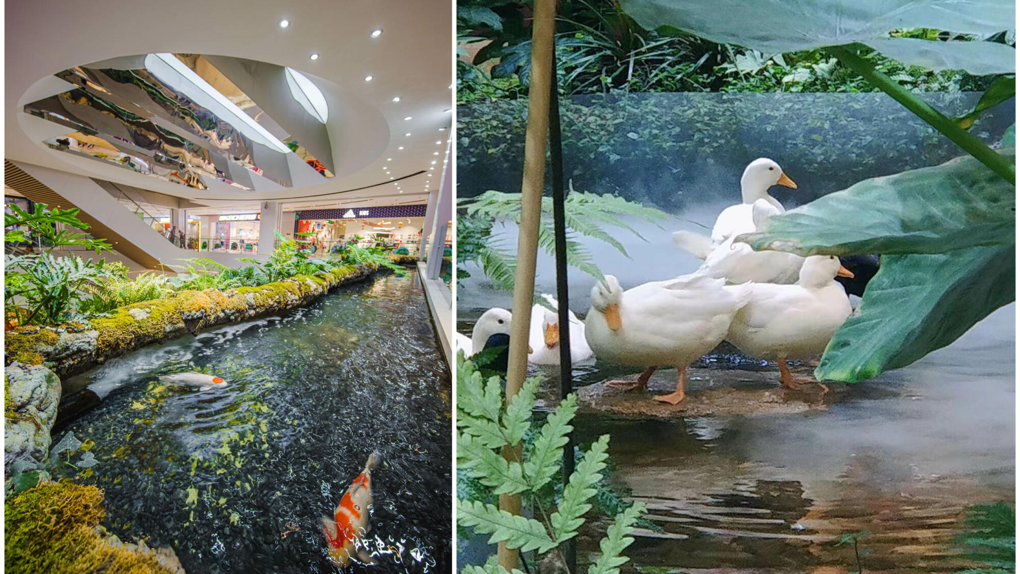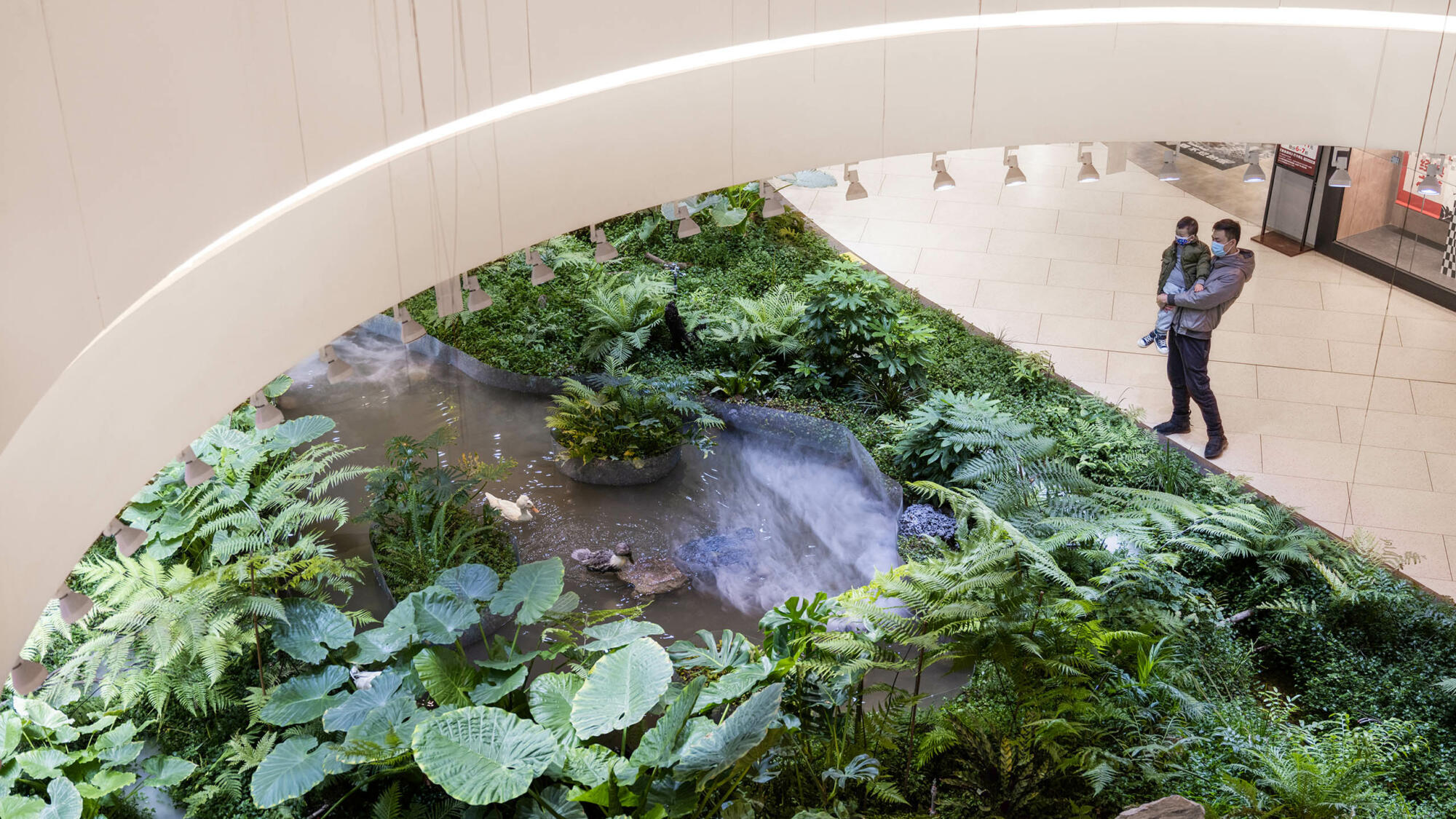 The central islands along the mall’s ground floor offermeandering trajectories offset from the main circulation: along elevated platforms, they combine water features and lush planting into an immersive environment that even has become home to fish and ducks.