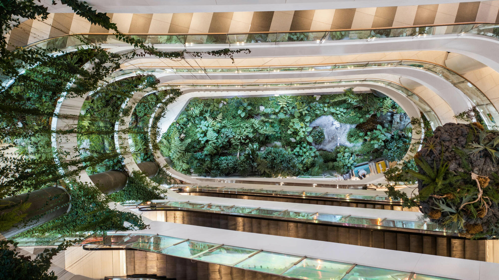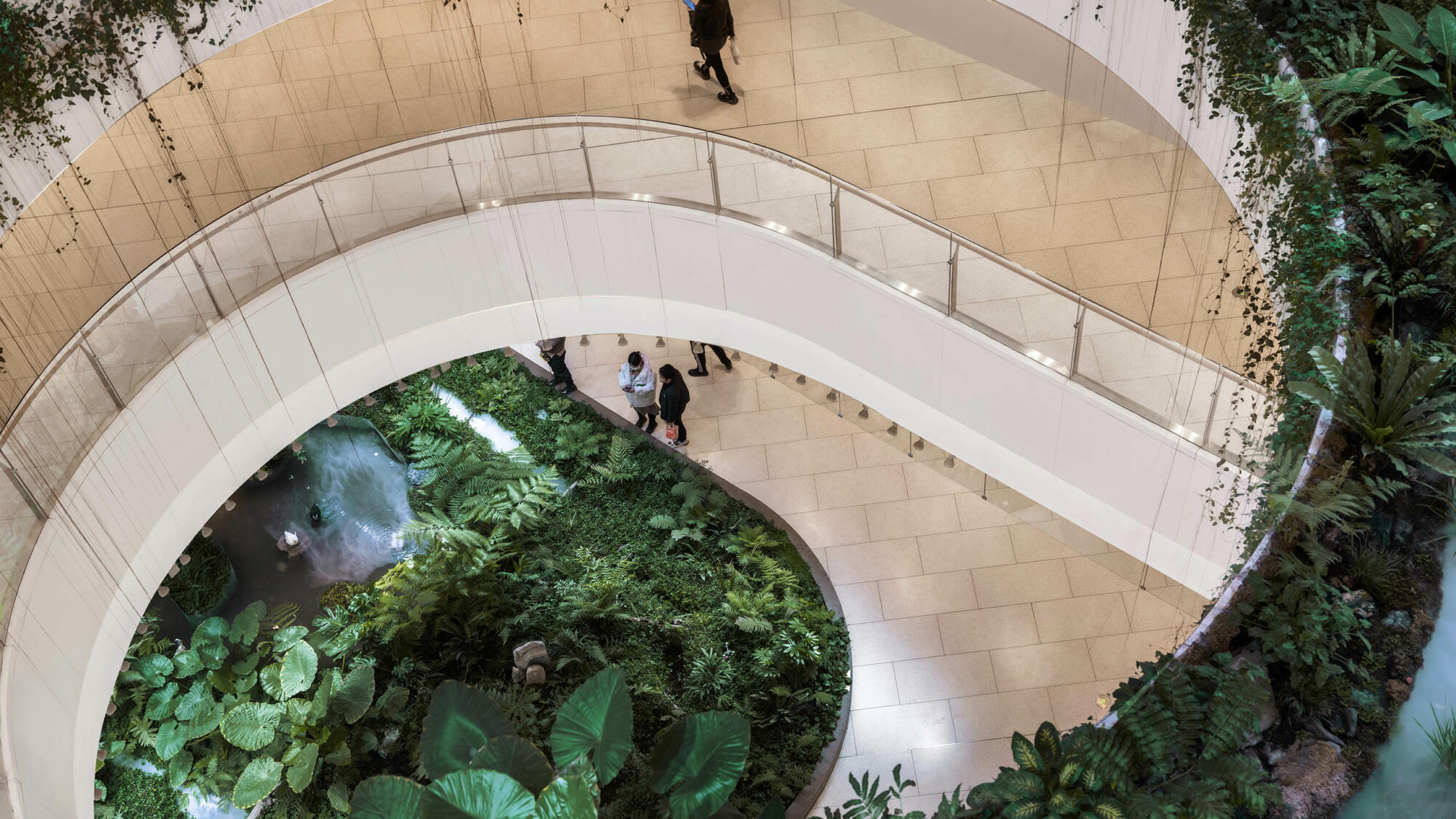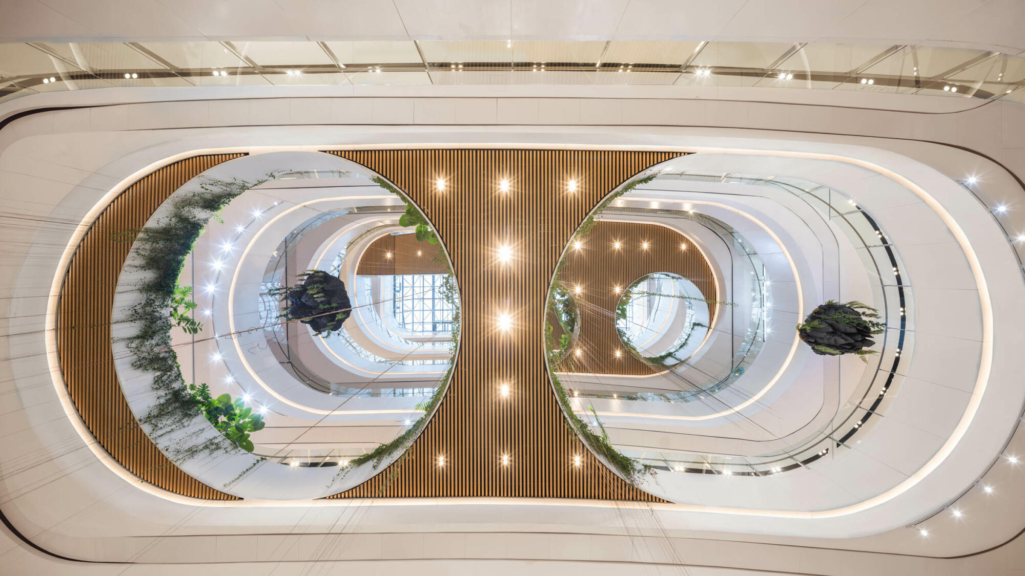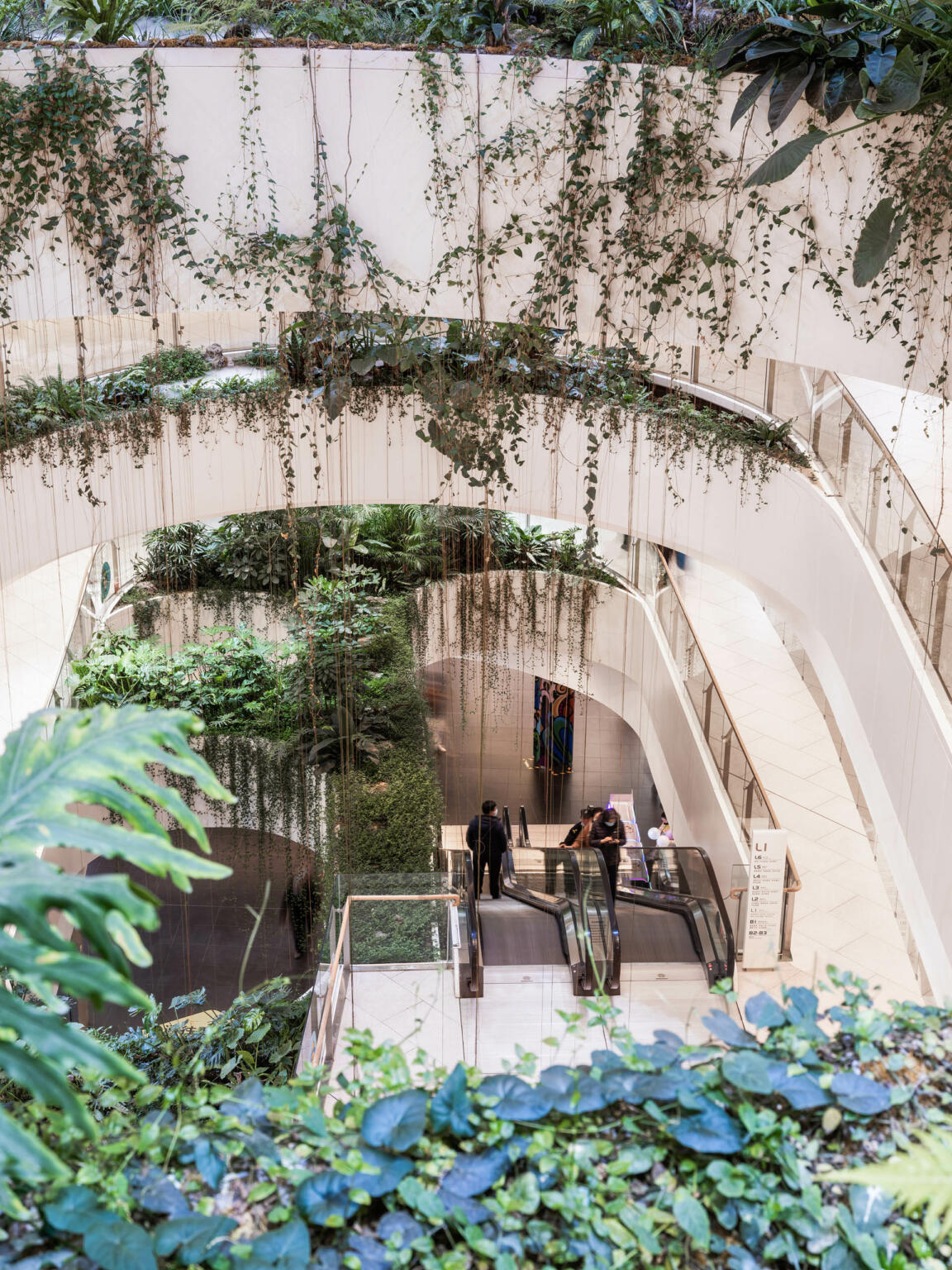 The outlines of the existing atria were re-drawn into clear geometric shapes that vertically overlap, to dissolve the rigidity and verticality of the space. Reconfigured edge zones, together with newly inserted connecting bridges, were converted into lush landscaped planters across all levels, in an innovative approach towards the positioning and functioning of commercial space.