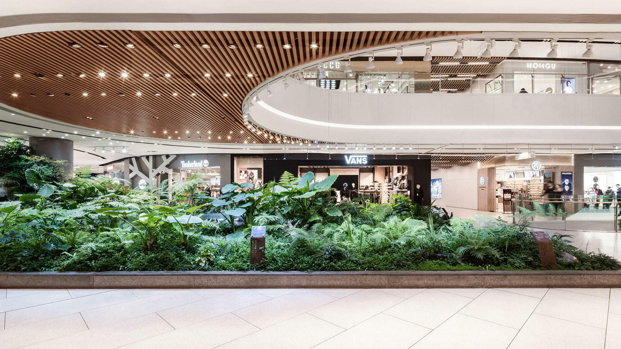 Together with green ‘pocket-park’ type islands along the mall’s corridors, the planted spaces amount to a total of two thousand square meters, incorporating varieties such as stream landscapes, rock gardens, and rain forests, all in line with the respective commercial theme of their location.