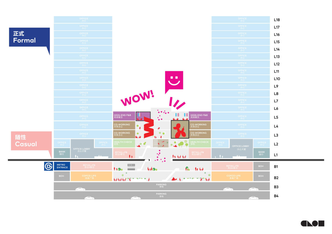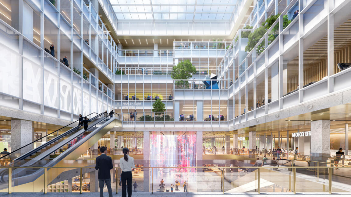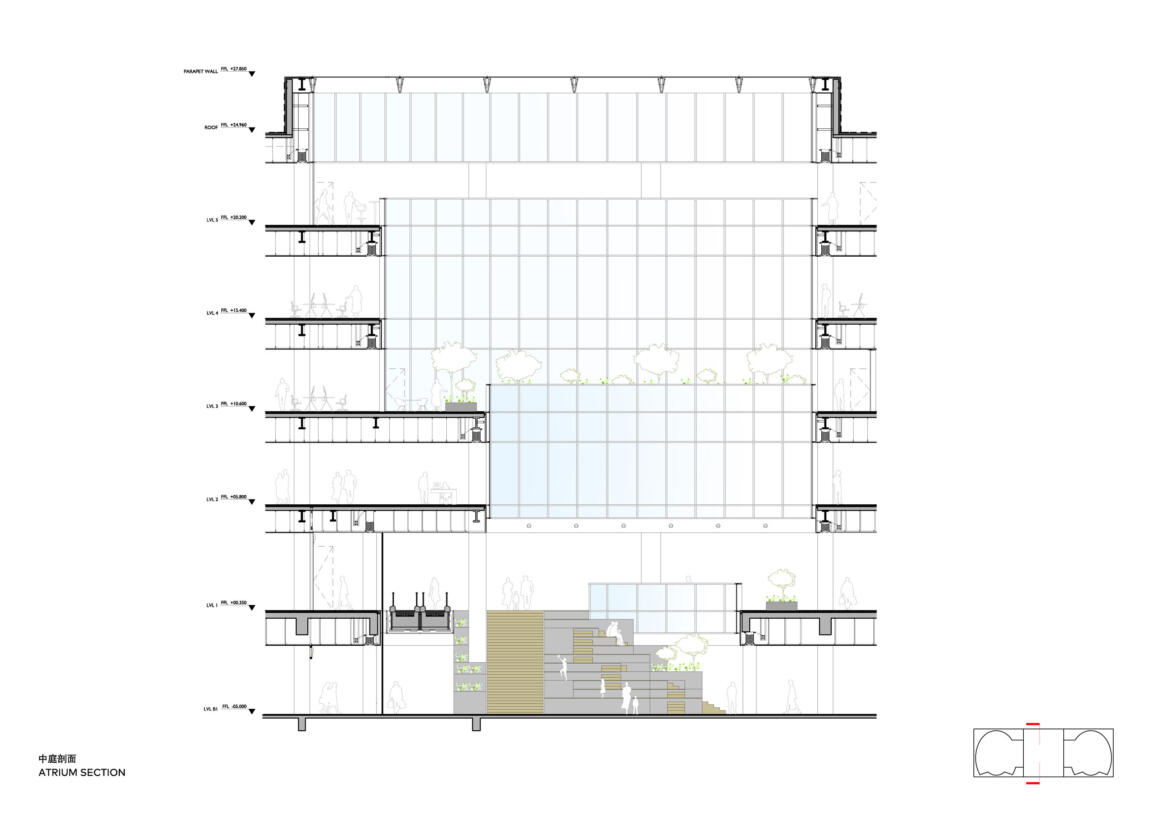 Interspersing contemporary workspace with recreational offers, the central atrium was conceived as an urban courtyard oasis, an all-day social gathering spot where sunlight, landscaping, and art create a comfortable environment at the intersection of work and commerce. Day-to-night uses, from co-working gardens to health and wellness facilities and dining establishments, ensure vibrancy of the five above-ground levels of this central zone beyond office hours, while the basement offers extended daily services in direct connectivity to Yong’anli metro station.