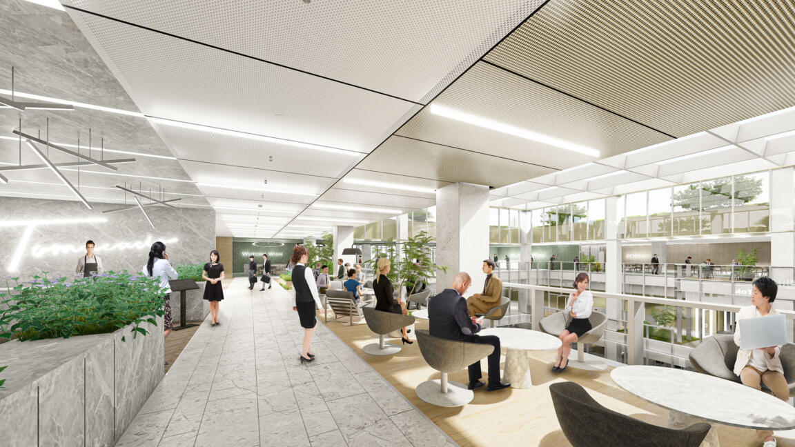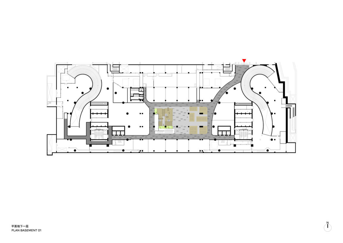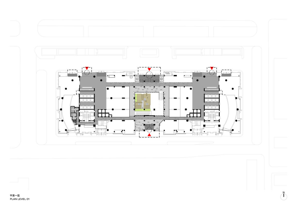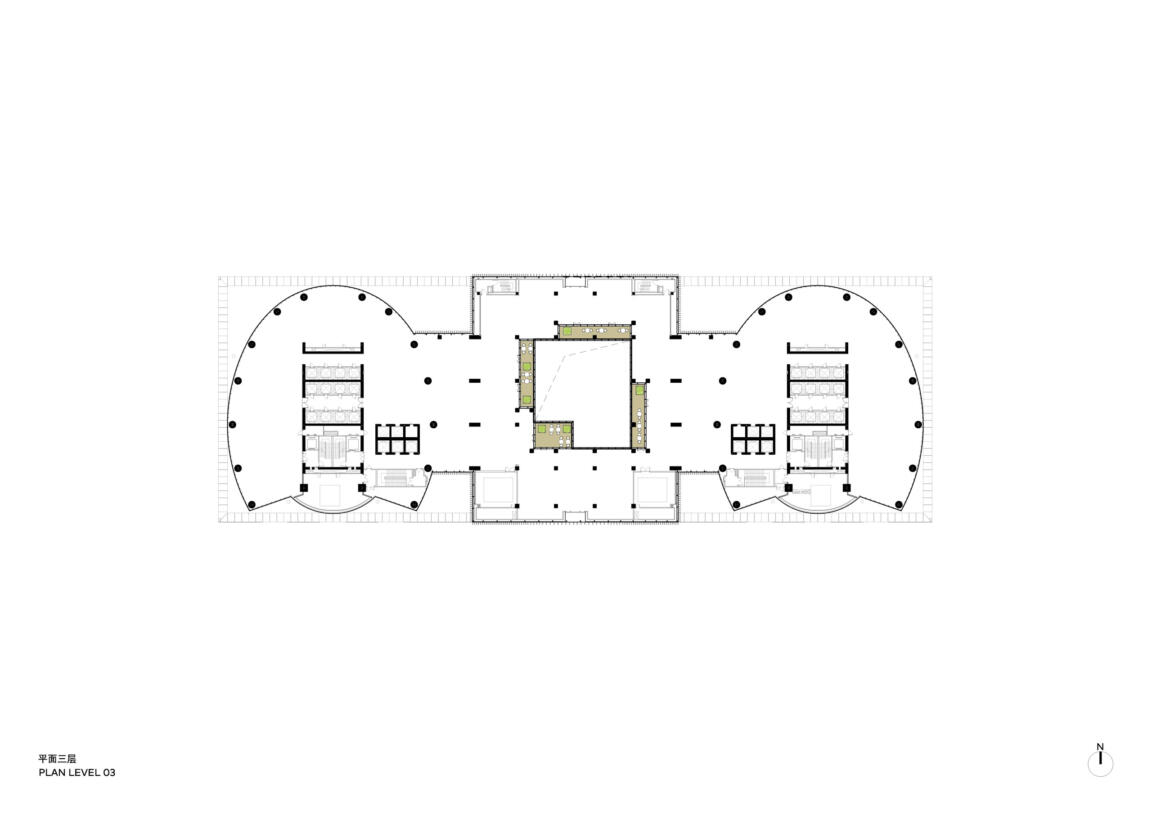 Interspersing contemporary workspace with recreational offers, the central atrium was conceived as an urban courtyard oasis, an all-day social gathering spot where sunlight, landscaping, and art create a comfortable environment at the intersection of work and commerce. Day-to-night uses, from co-working gardens to health and wellness facilities and dining establishments, ensure vibrancy of the five above-ground levels of this central zone beyond office hours, while the basement offers extended daily services in direct connectivity to Yong’anli metro station.