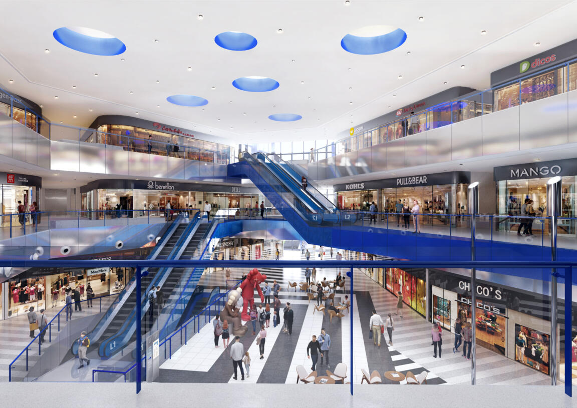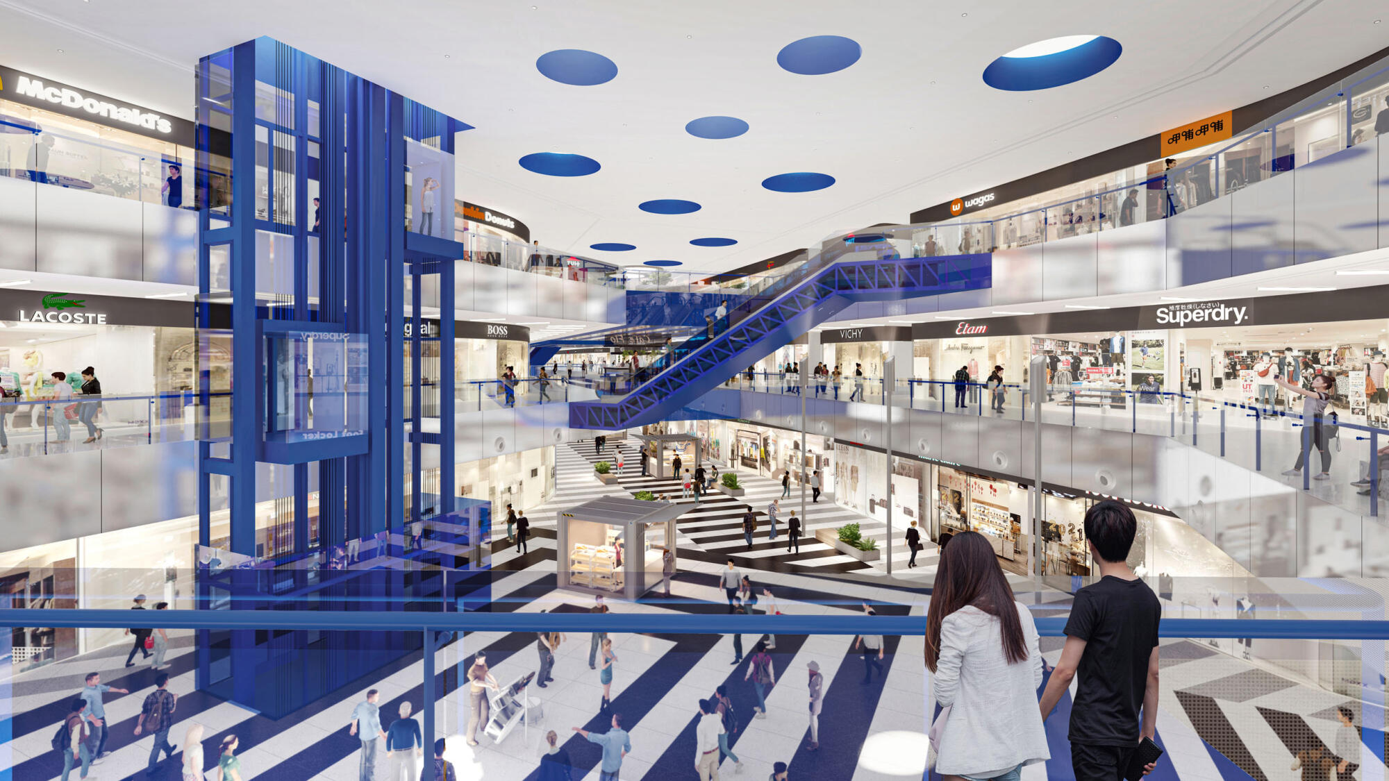 Streetscape elements convey the experience of an urban journey across the interweaving levels of a community mall.