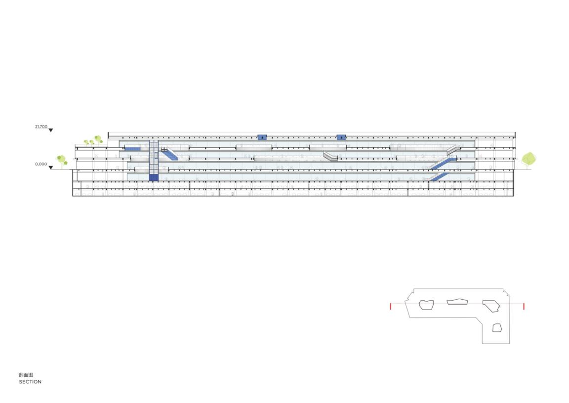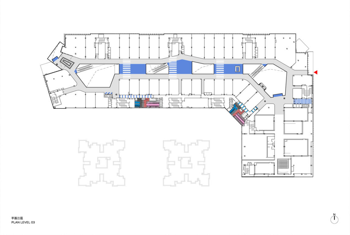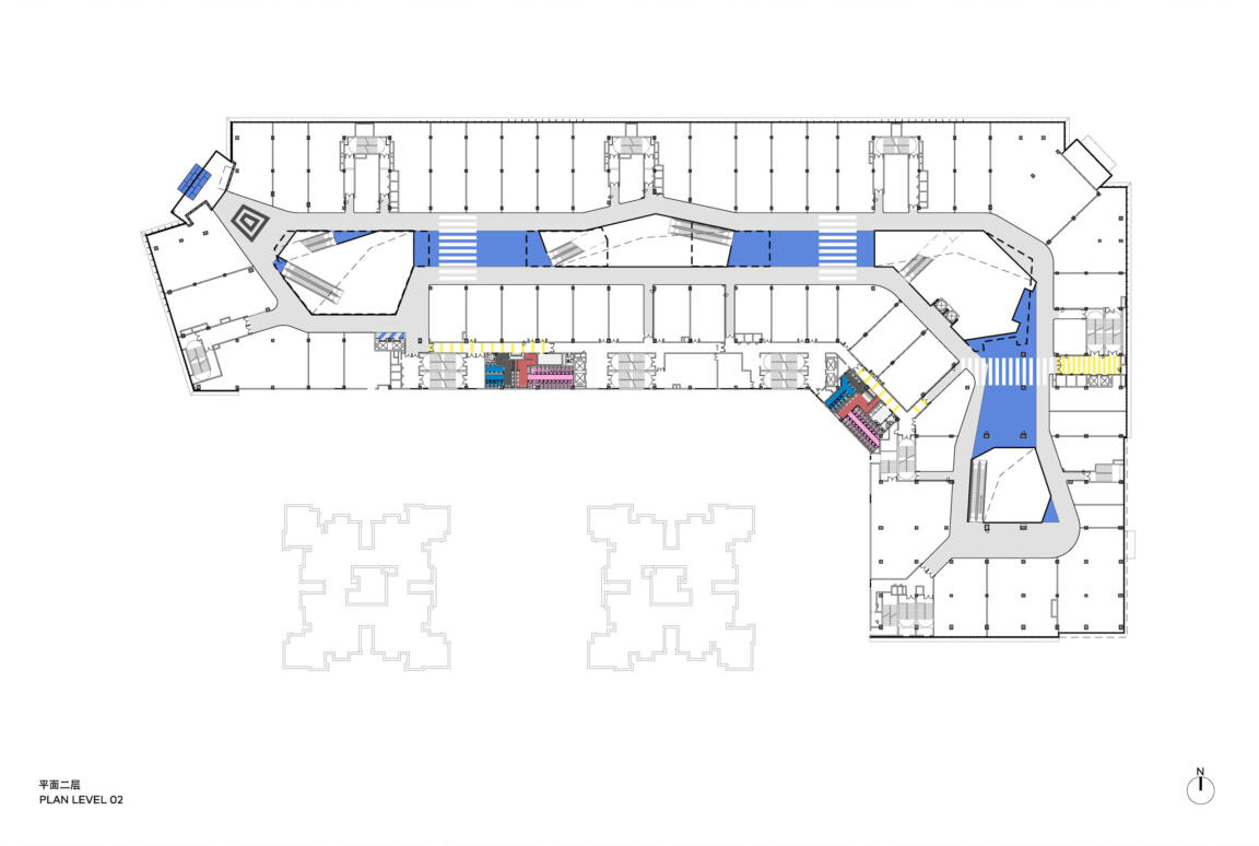 In the interiors, exterior streetscape elements are set to evoke the sensation of ‘being on the way home’: plazas, streets, alleys, and bridges are borrowed from Chongqing’s multi-layered urban context, and re-assembled in monochromatic sequences, to guide into and through the retail space, to set focal points, and to vertically connect the different levels. Spatial attachments such as shop windows and balconies line the generous atria in visual and thematic connection. Bridges criss-cross the linear spaces, while kiosks animate the circulation areas.