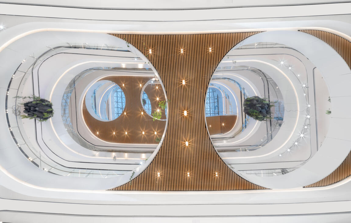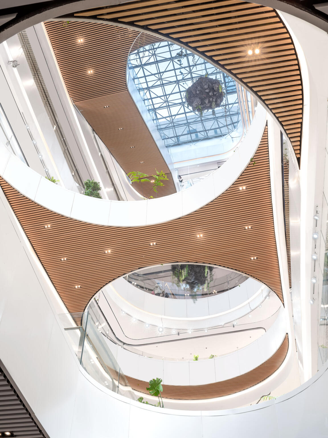 Looking upwards, horizontal bands of fashion retail, kids’ entertainment and education, sports facilities, and dining reach out across the seven levels like roots and branches of a tree. Spatial extension and planar shifts generate well-useable floorplate sizes for circulation, events, and encounters. This even distribution of attractions directs curiosity towards the previously unprofitable upper floors.