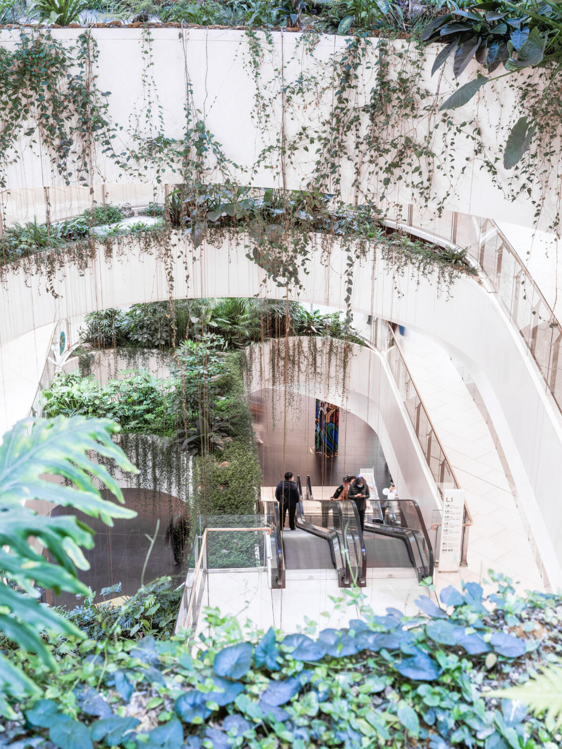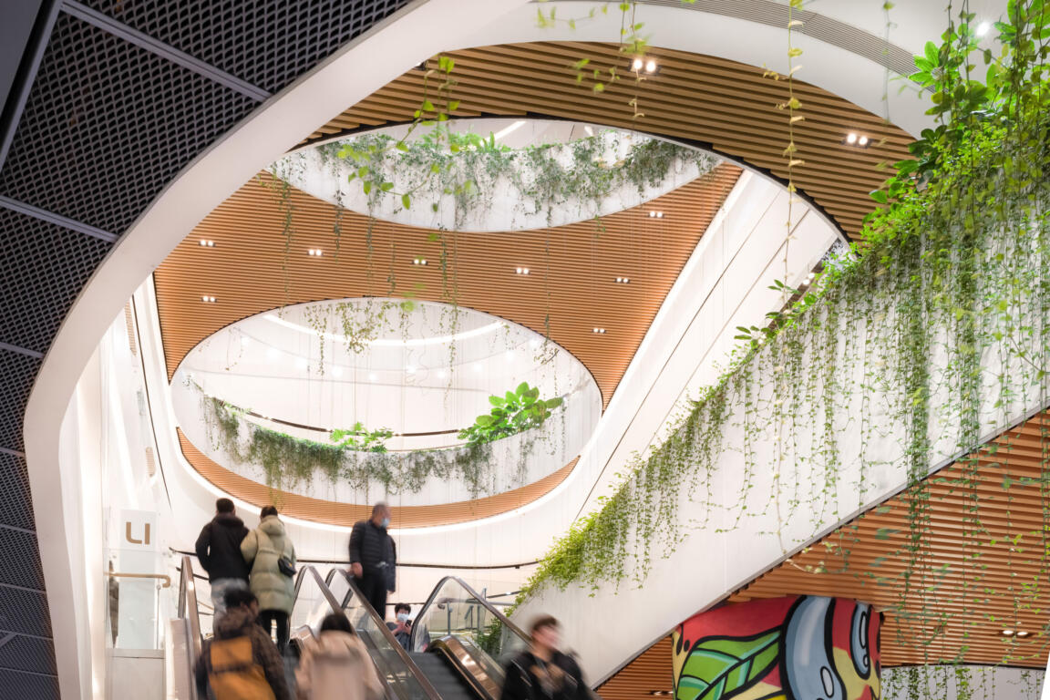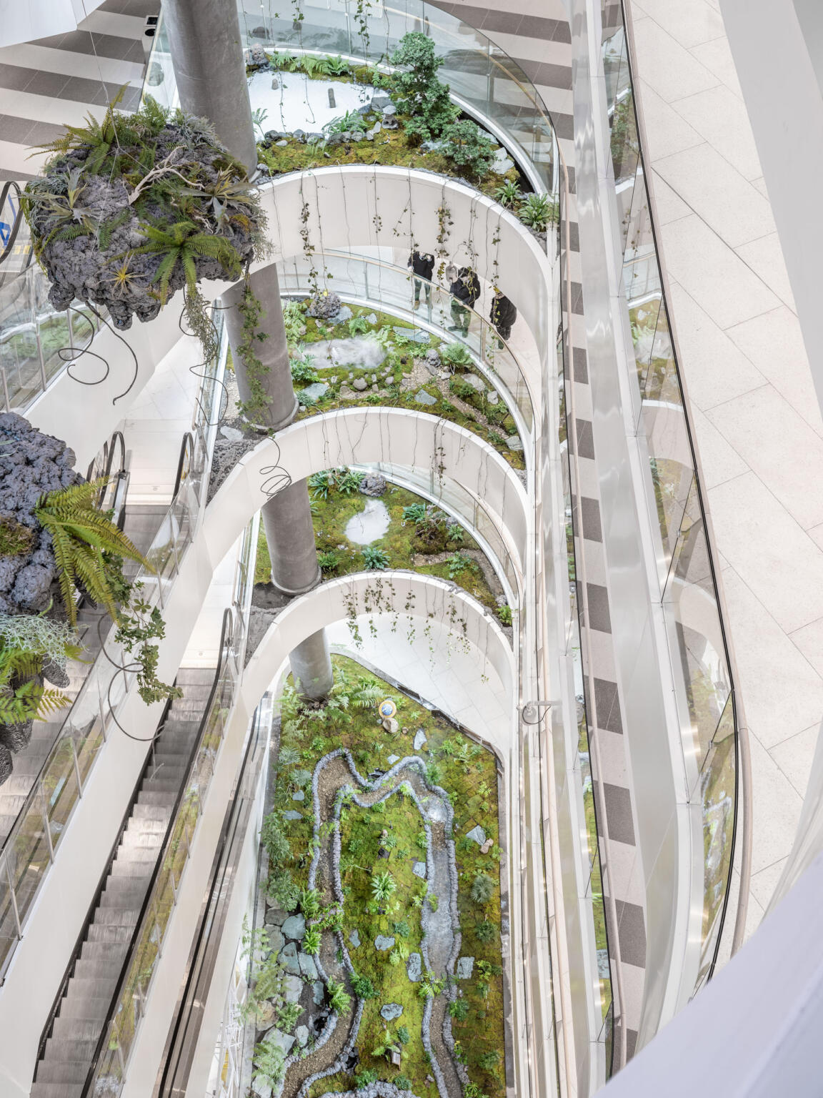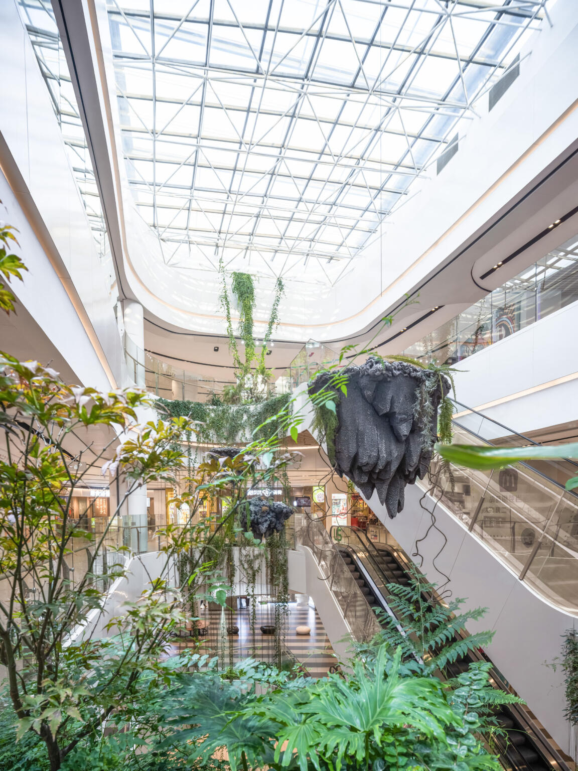 Together with green ‘pocket-park’ type islands along the mall’s corridors, the planted spaces amount to a total of two thousand square meters, incorporating varieties such as stream landscapes, rock gardens, and rain forests, all in line with the respective commercial theme of their location.