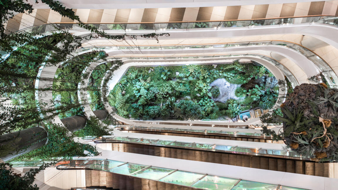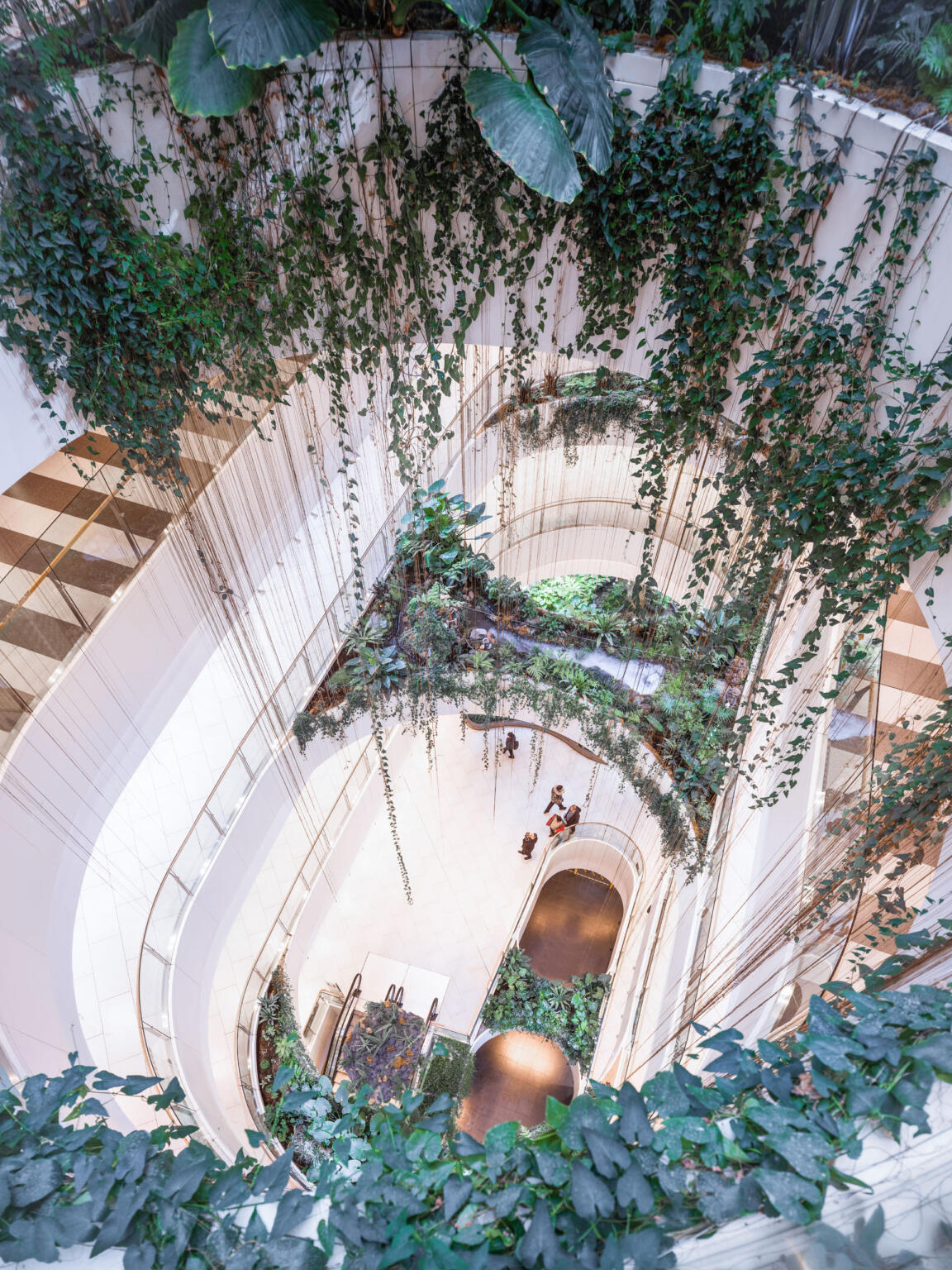 The outlines of the existing atria were re-drawn into clear geometric shapes that vertically overlap, to dissolve the rigidity and verticality of the space. Reconfigured edge zones, together with newly inserted connecting bridges, were converted into lush landscaped planters across all levels, in an innovative approach towards the positioning and functioning of commercial space.
