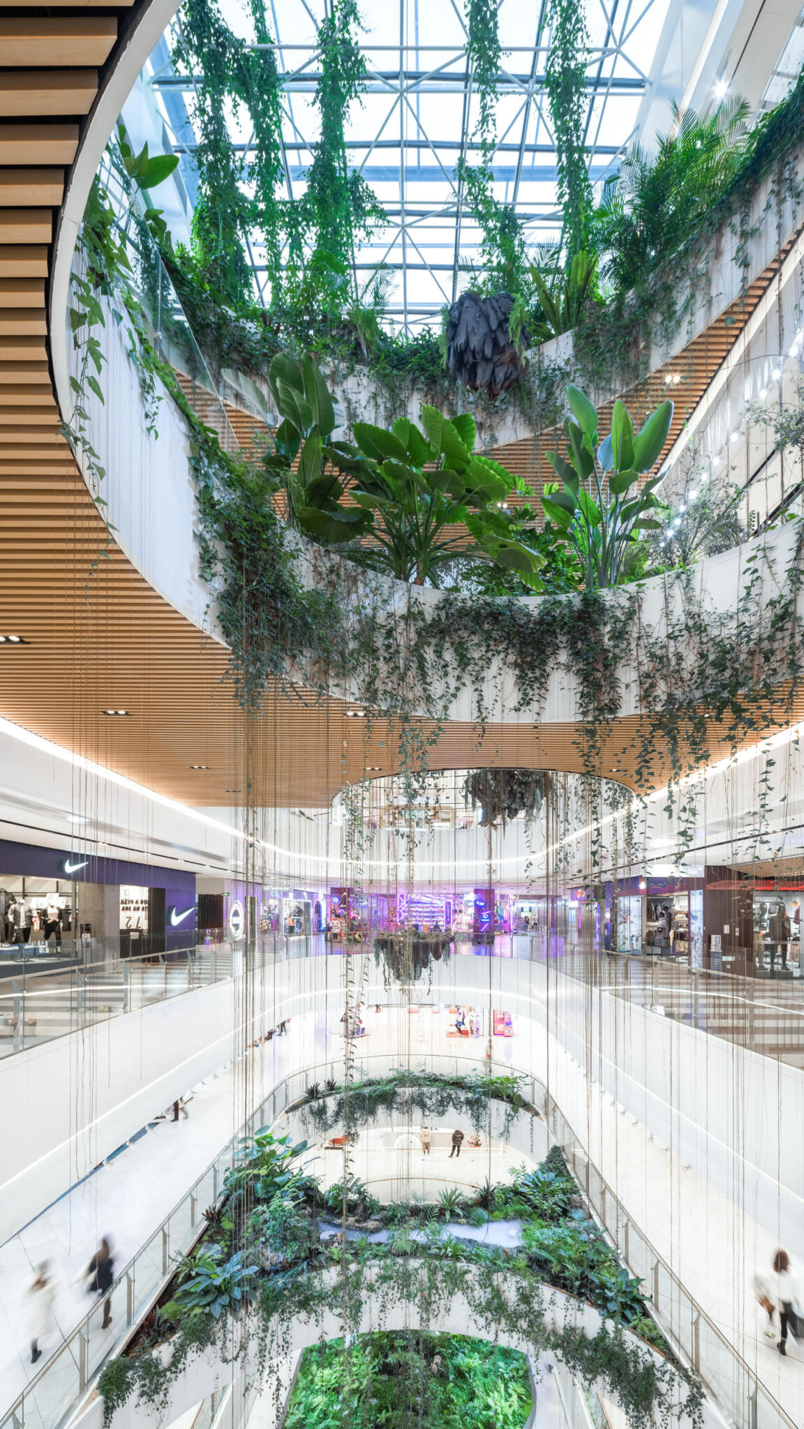 Challenging the often sterile atmosphere of conventional shopping malls, the retail centre was conceived as a green and natural indoor space. A spirited contemporary interpretation of the Hanging Gardens of Babylon, it incorporates horizontal gardening strategies across all retail floors to create social meeting and gathering spots with a fresh identity, interactive potential, and affective qualities.