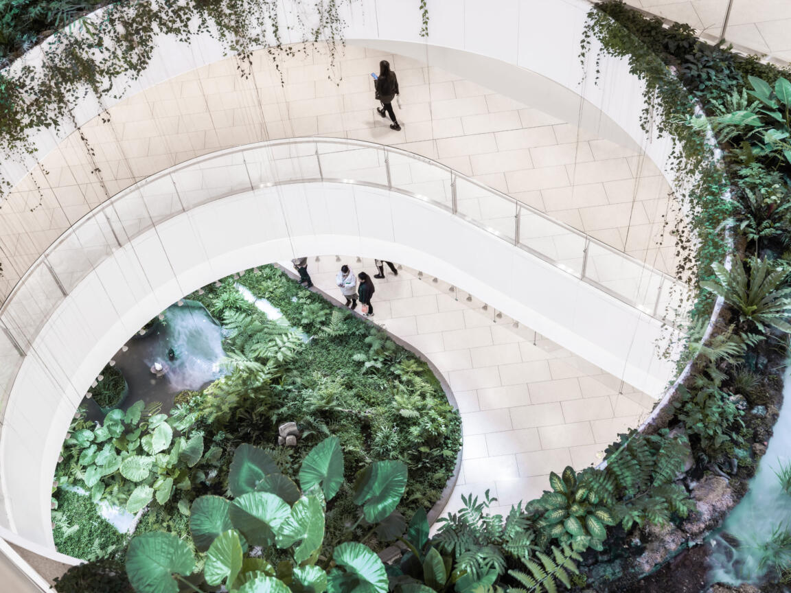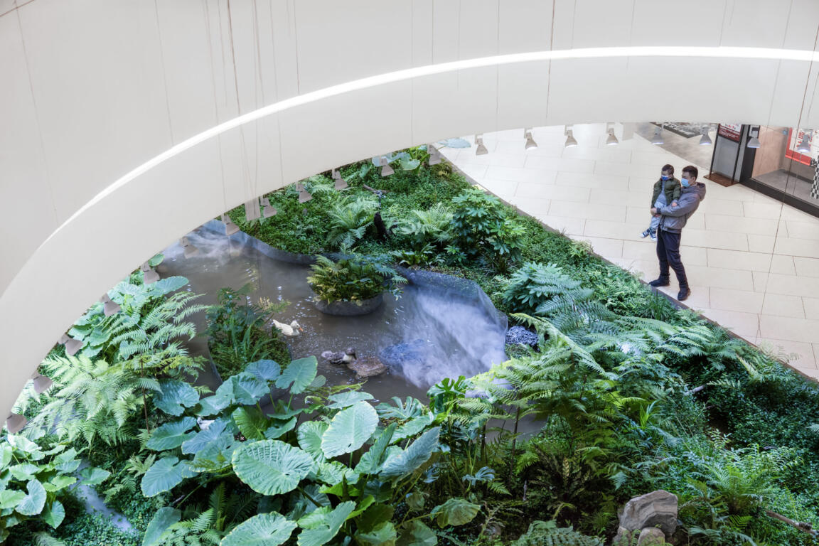 The central islands along the mall’s ground floor offer meandering trajectories offset from the main circulation: along elevated platforms, they combine water features and lush planting into an immersive environment that even has become home to fish and ducks.