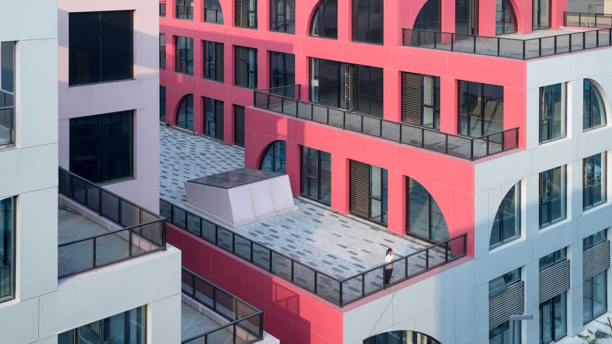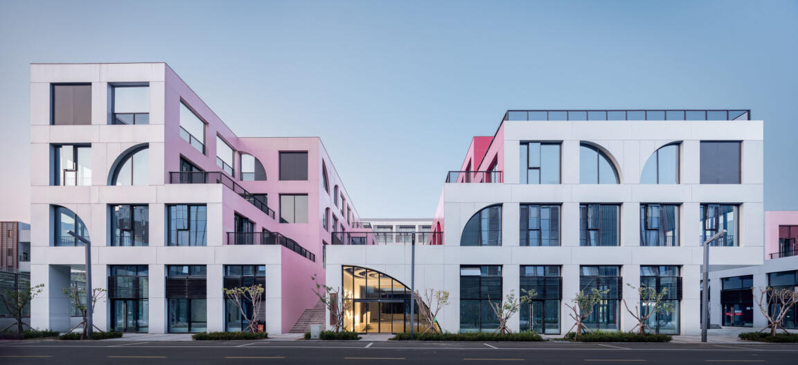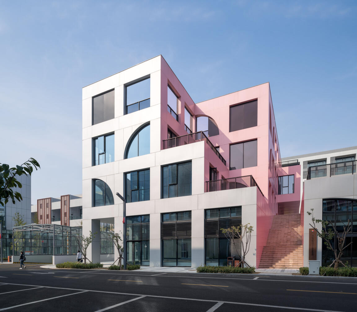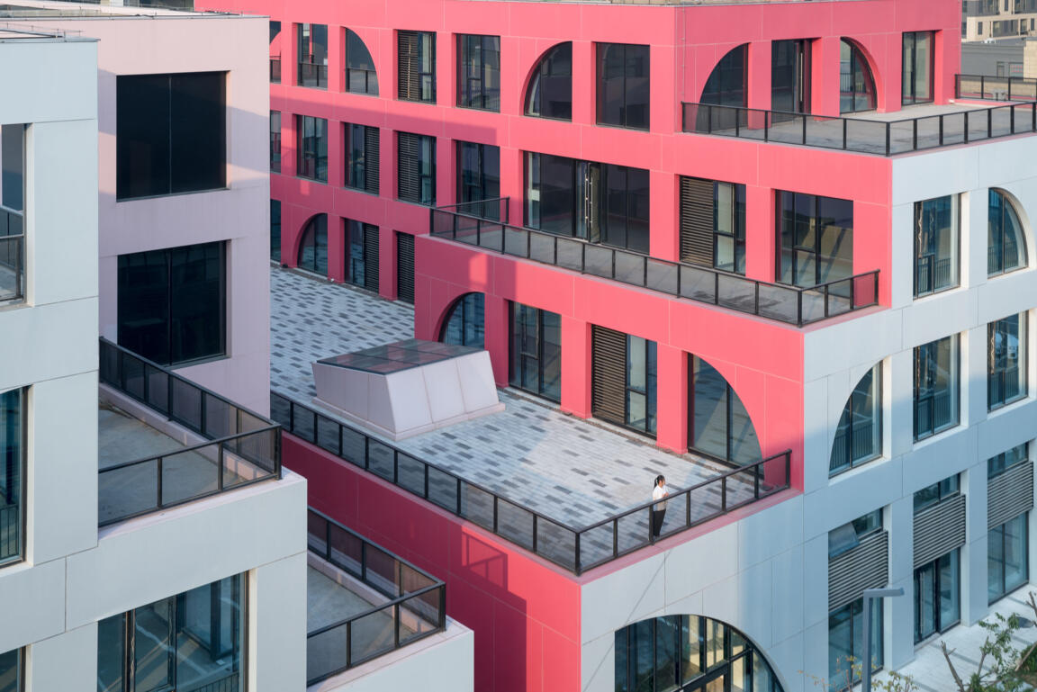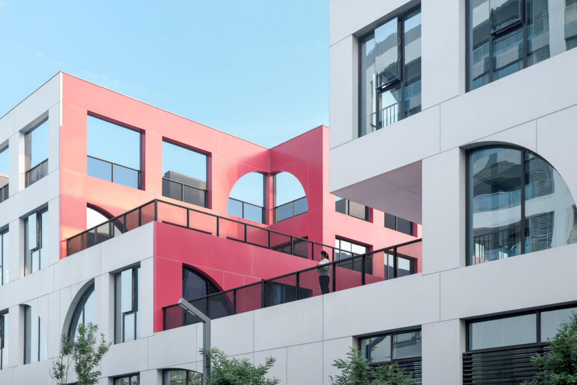 The form of the volume resembles stepped boxes and, when paired with the geometric windows and doors, expresses a rational beauty. The façade design of the volumes plays with pinks and grey which, from a distance, creates a shiny effect that warms as one approaches.