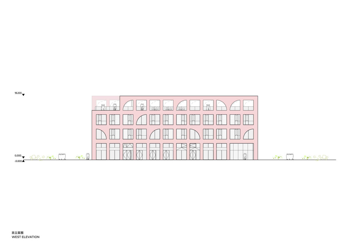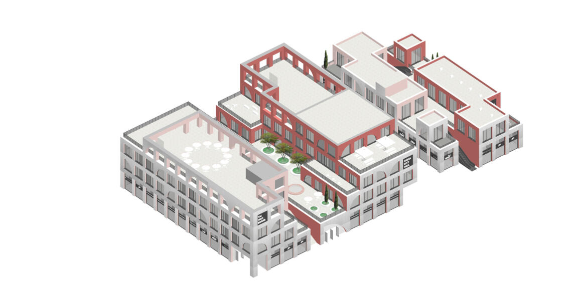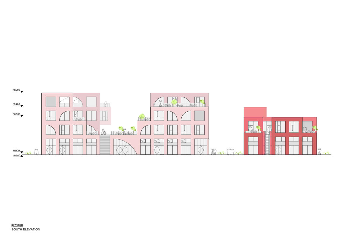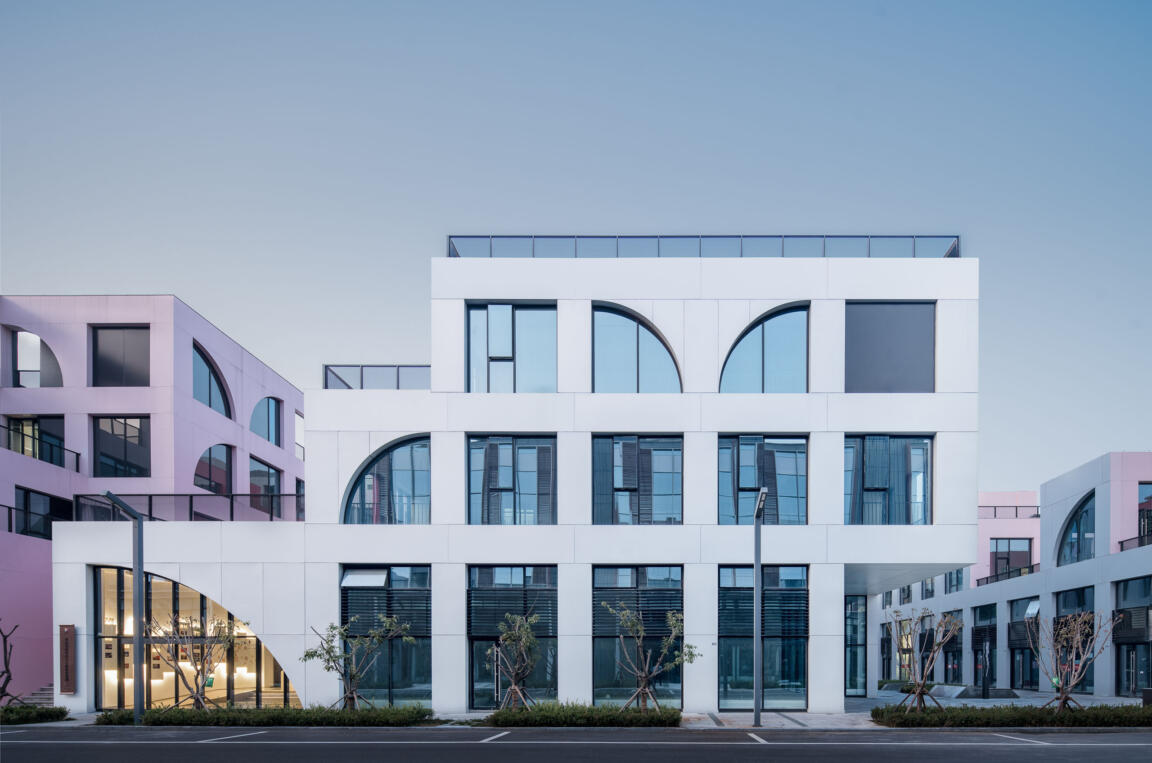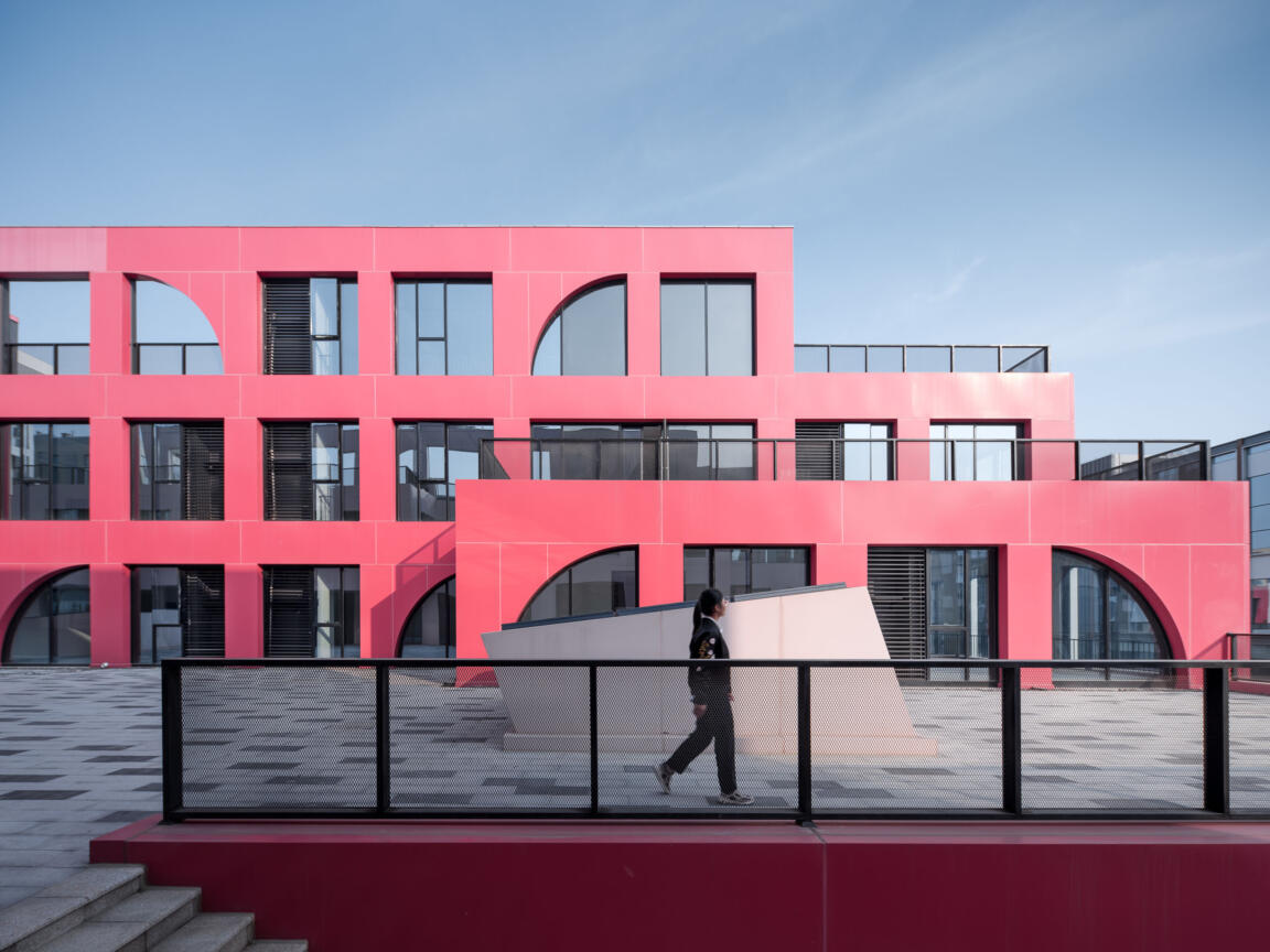 The form of the volume resembles stepped boxes and, when paired with the geometric windows and doors, expresses a rational beauty. The façade design of the volumes plays with pinks and grey which, from a distance, creates a shiny effect that warms as one approaches.
