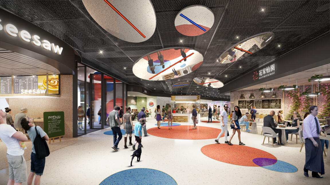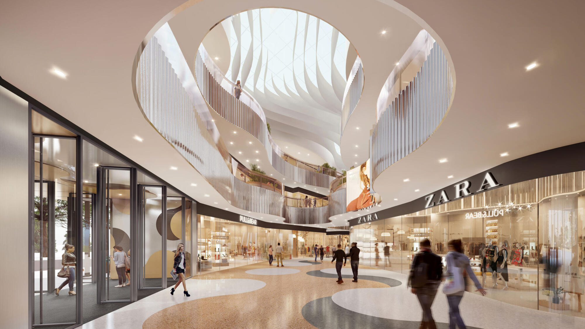 Two interconnected atria weave along the longitudinal mall space in elegant curves. Alongside their undulating outline, linear landscape islands and seating areas create a relaxed atmosphere for socialising, blurring the boundary between tenanted and public spaces. Vertical spandrel patterns echo the elegance of willows hovering above running water.