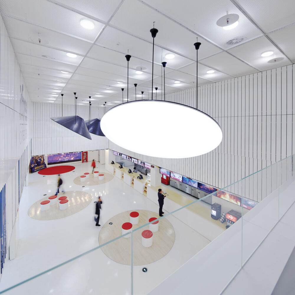 With its clean lines, robust fair-faced concrete and metal mesh ceilings, the use of red velvet, and the larger-than-life suspended lamp cones, the cinema reminds one of the grand theatres remodeled with a young and urban take. A contemporary and thoughtful demonstration of iFree’s new brand identity is also designed by CLOU.