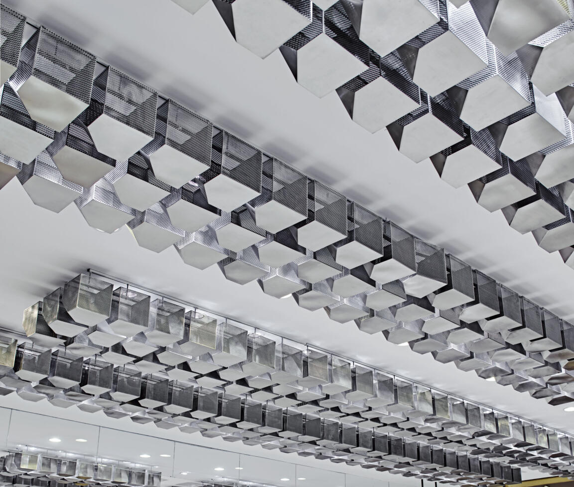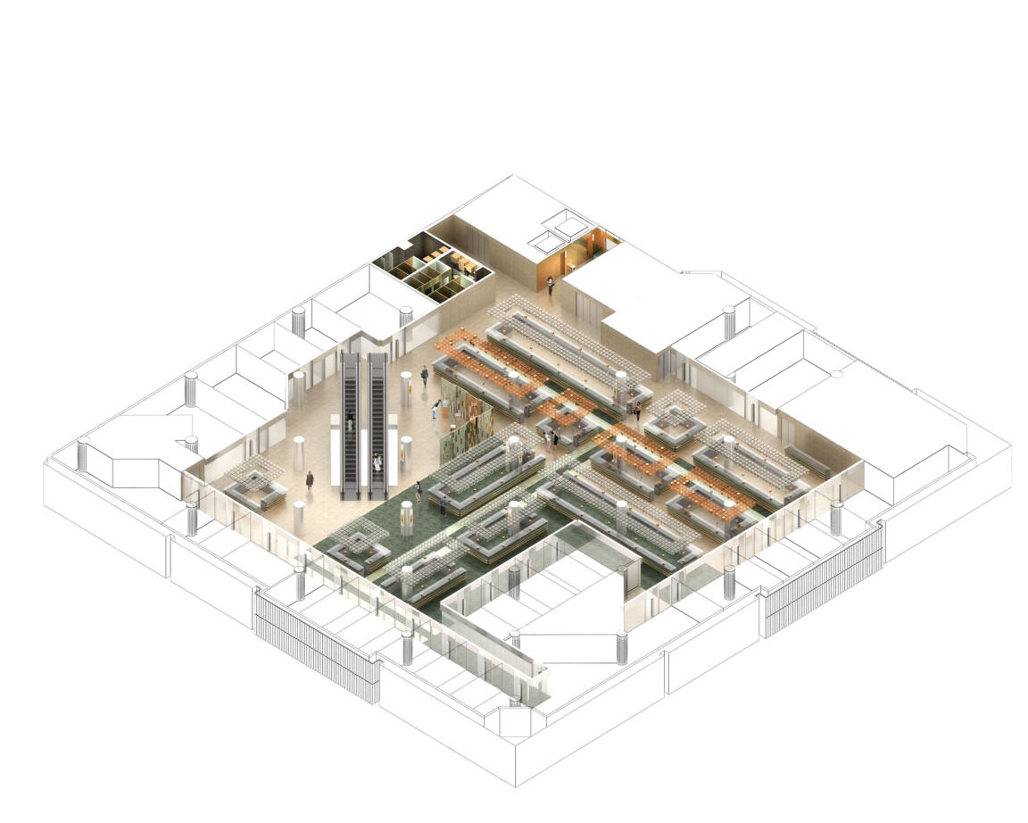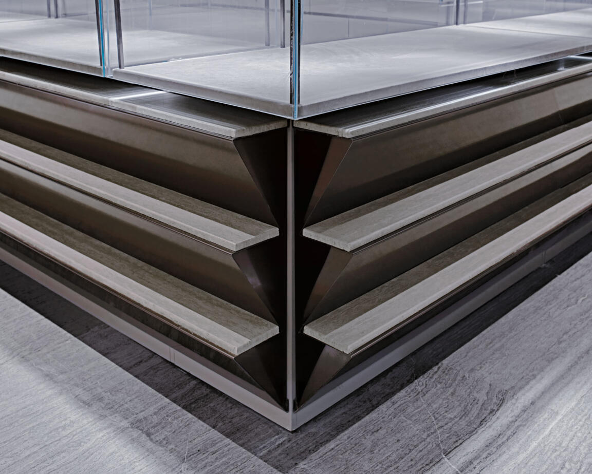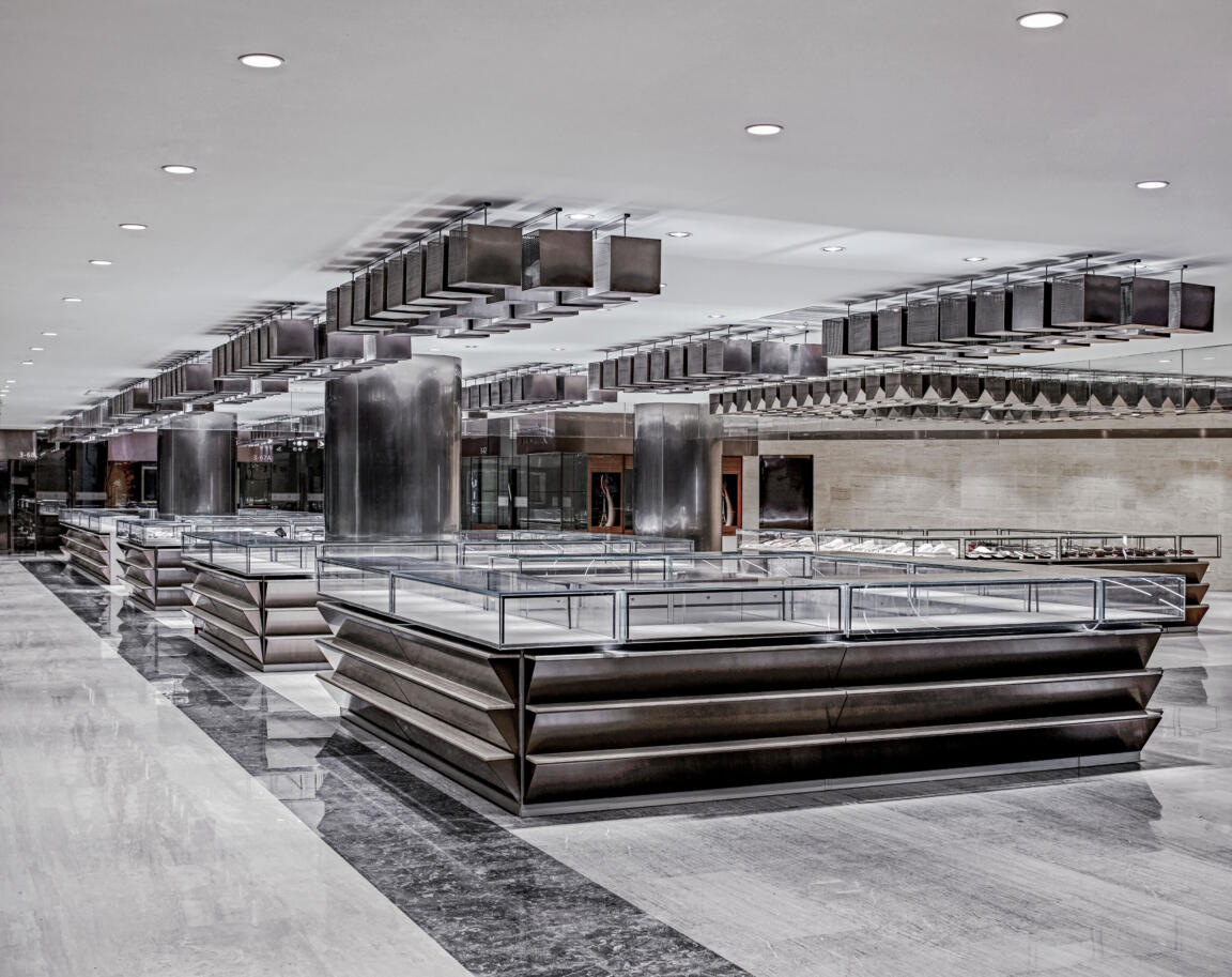 To create a sense of unity throughout the design, counters were fitted with anodised, corrugated steel and customised in a range of tones and natural stone selections to create a different atmosphere on each floor. Each level hosts different precious stones and as such the lighting and materials have been selected to show the jewellery in an optimal way. Diamonds on the ground floor require cold lighting, which is balanced by gold column cladding and signage boxes, while on the second floor, jade jewellery, which requires warmer light, is offset by darker material finishes.