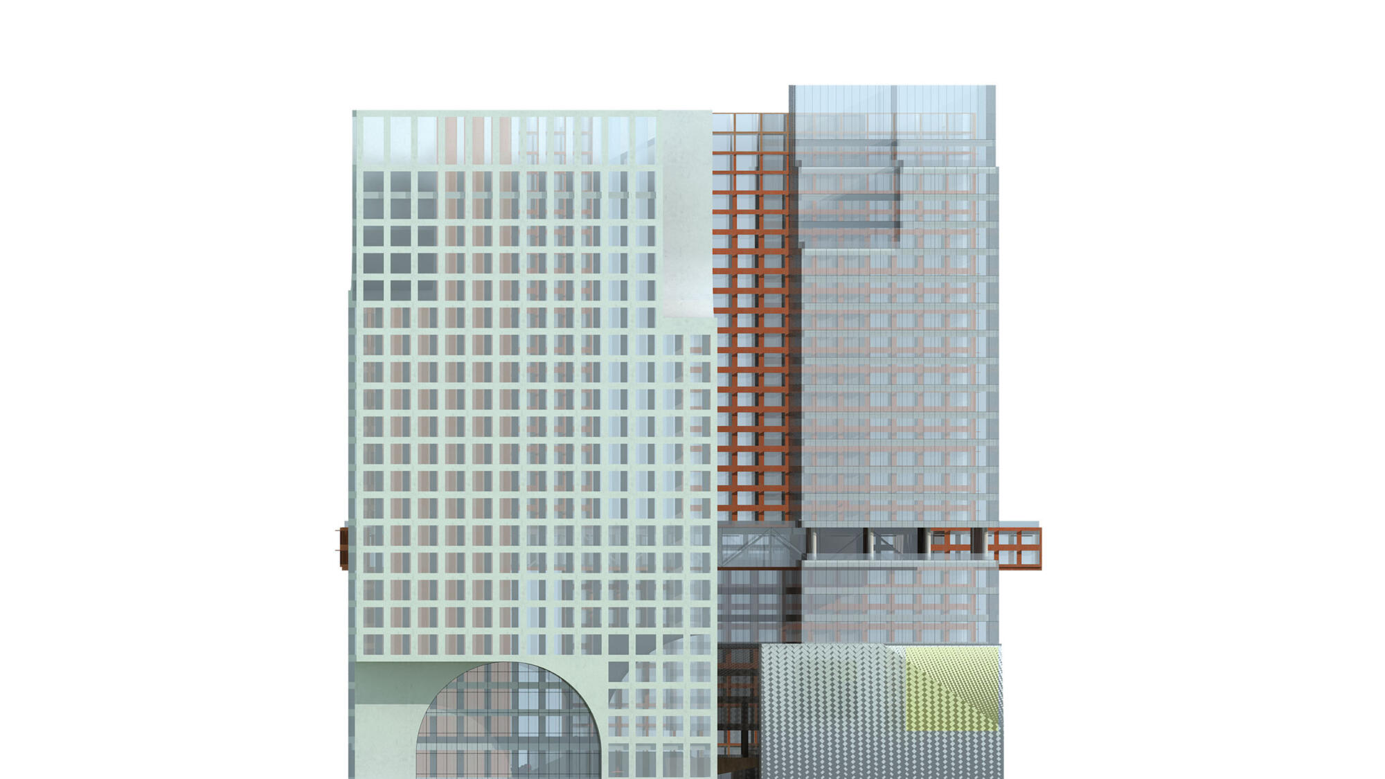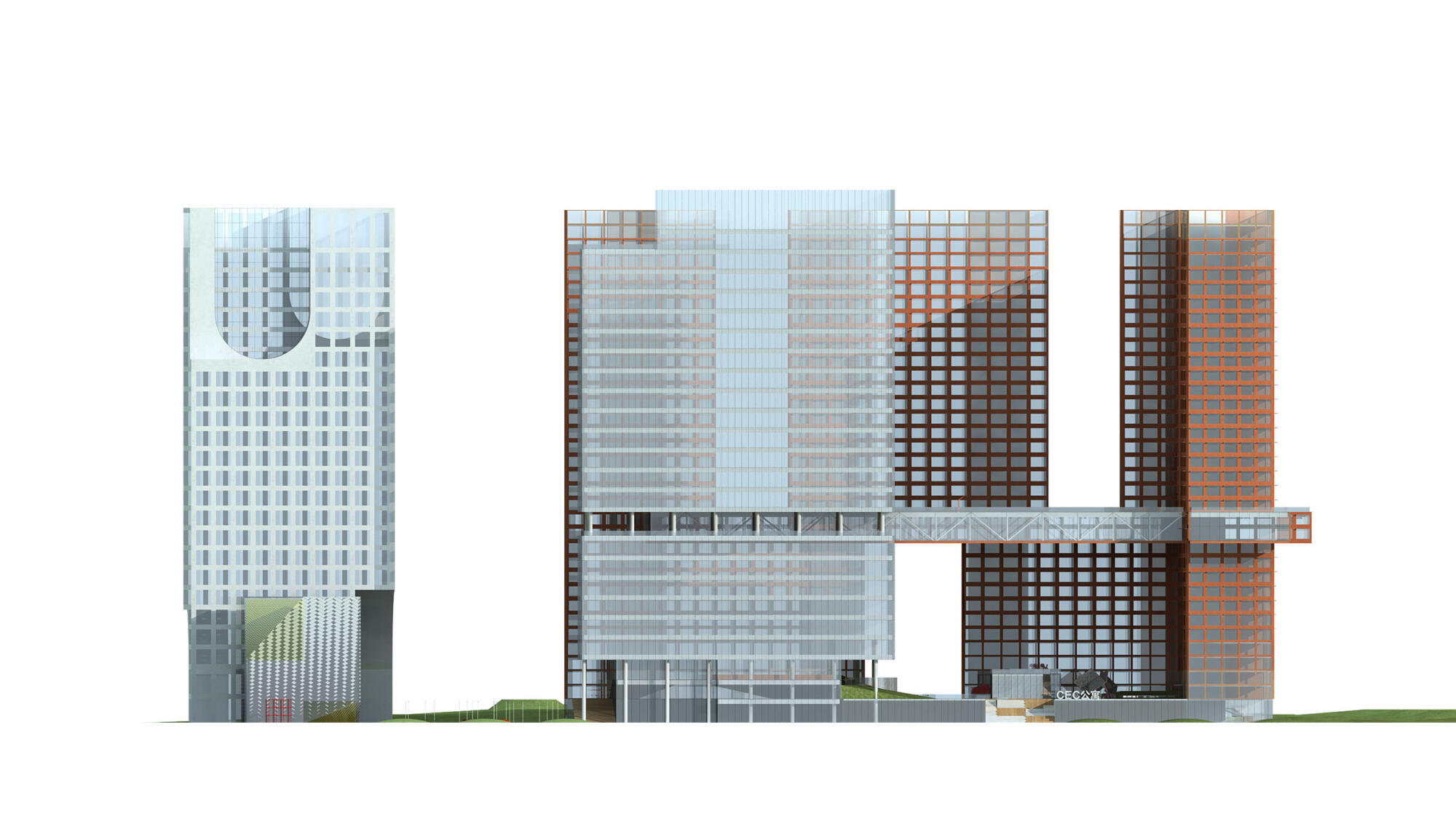 The residential towers are positioned at the north-west corner of the site benefitting from excellent views towards the park. An elevated ‘viewing corridor’ exists at the mid-section of the towers connecting to the core of each building and spanning between. Two independent courtyards cover the ground level with greenery and public space.