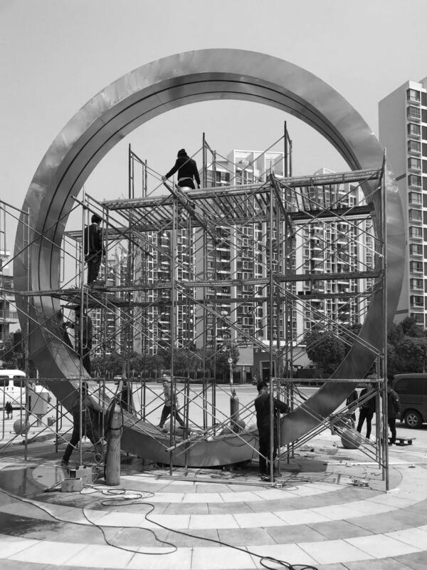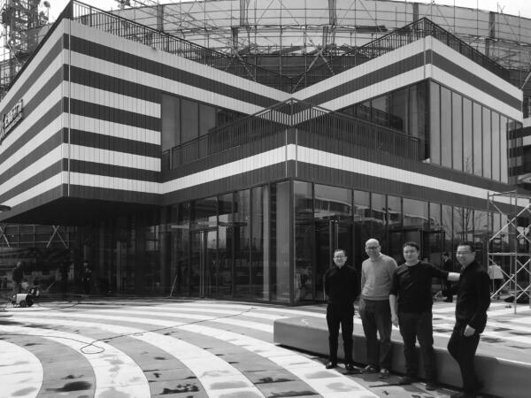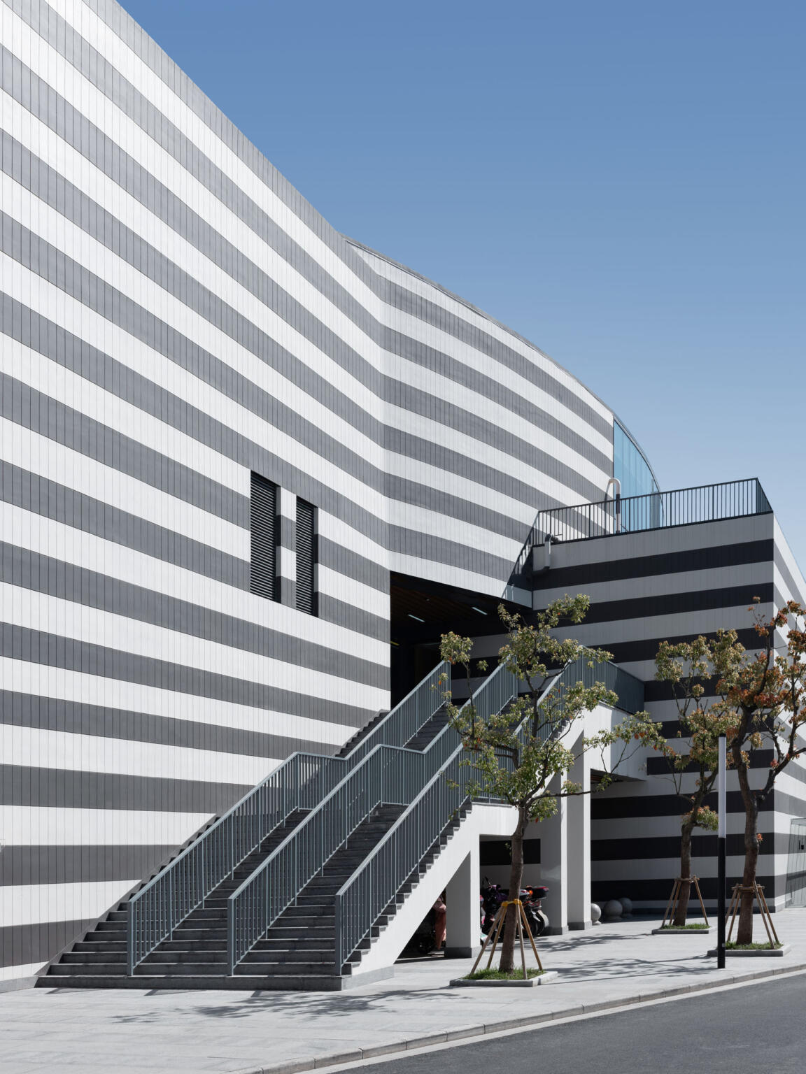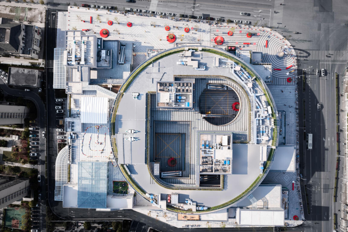 The ring above is clad in textured glass allowing diners views out over the elevated terraces and city. The lower levels’ black and white terracotta strips are a contemporary reference to Shanghai’s “Shi Ku Men” brick architecture.