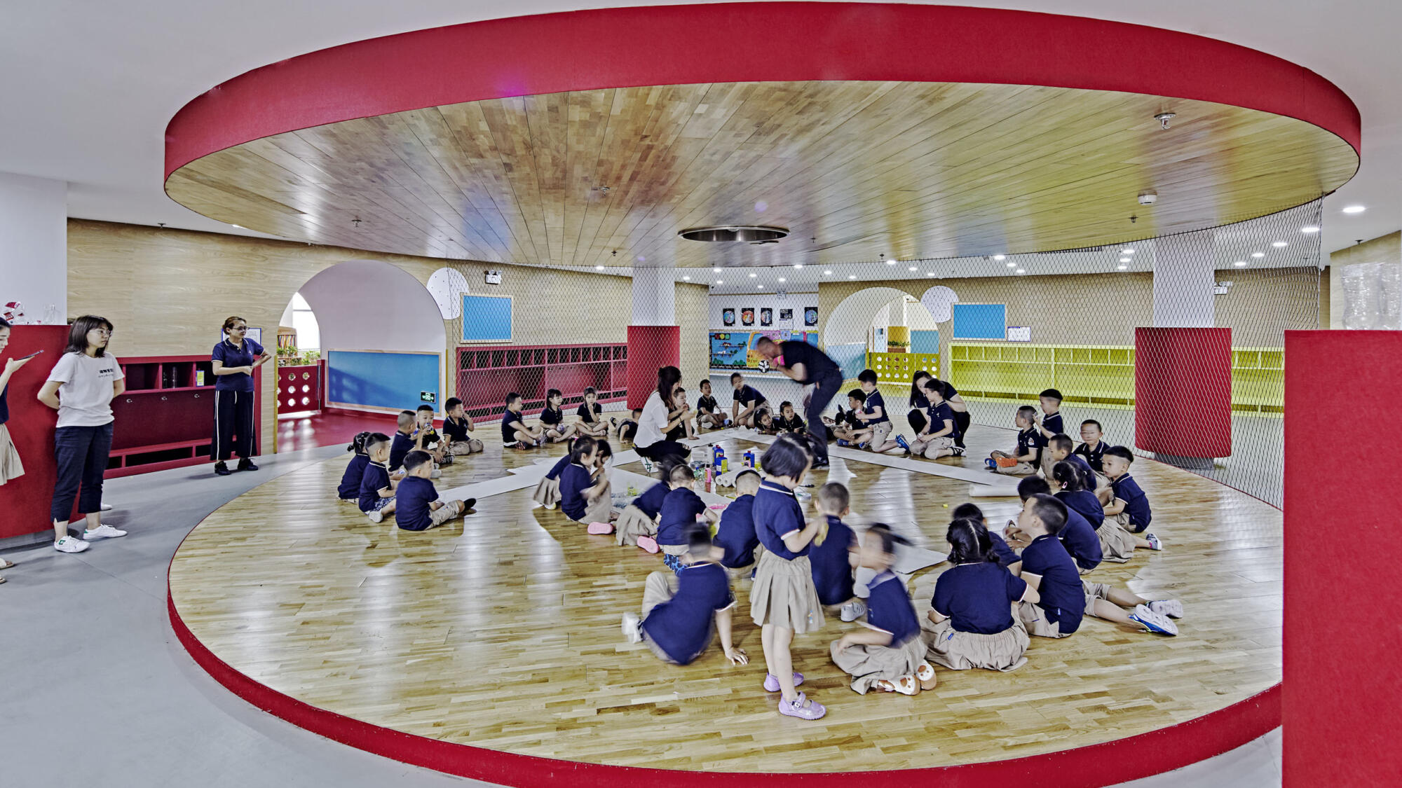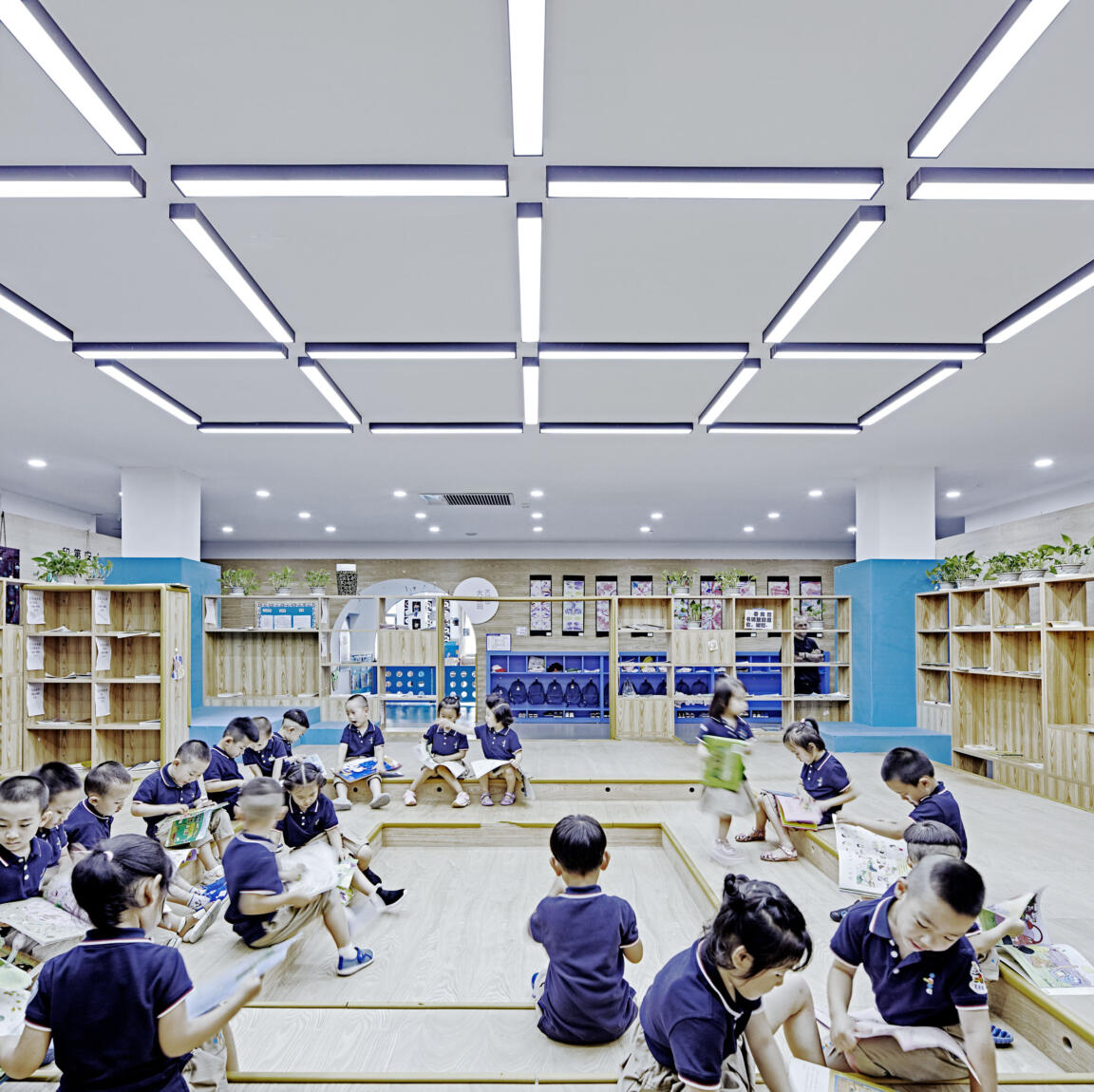 The Nobo Free Play kindergarten features central spaces on each level that offers themed activity zones such as an indoor running track, a children’s library and an auditorium area. These spaces support social connectivity among the 12 kindergarten classes, providing opportunities for ‘free play’ and multifunctional activities. A music room and an art studio with direct access from the central spaces complement the classroom activities. Back of house program, such as the kitchen and teachers offices, can be discovered and observed by the children through large panorama windows.