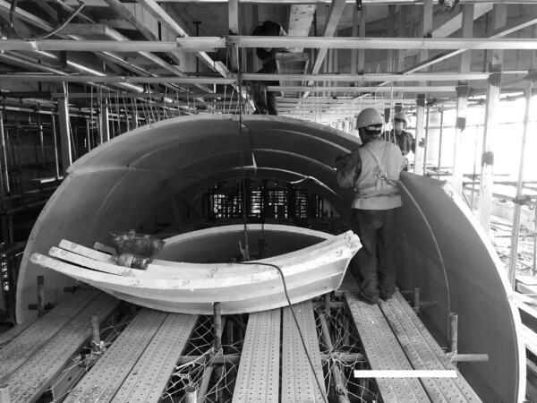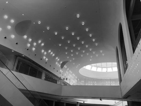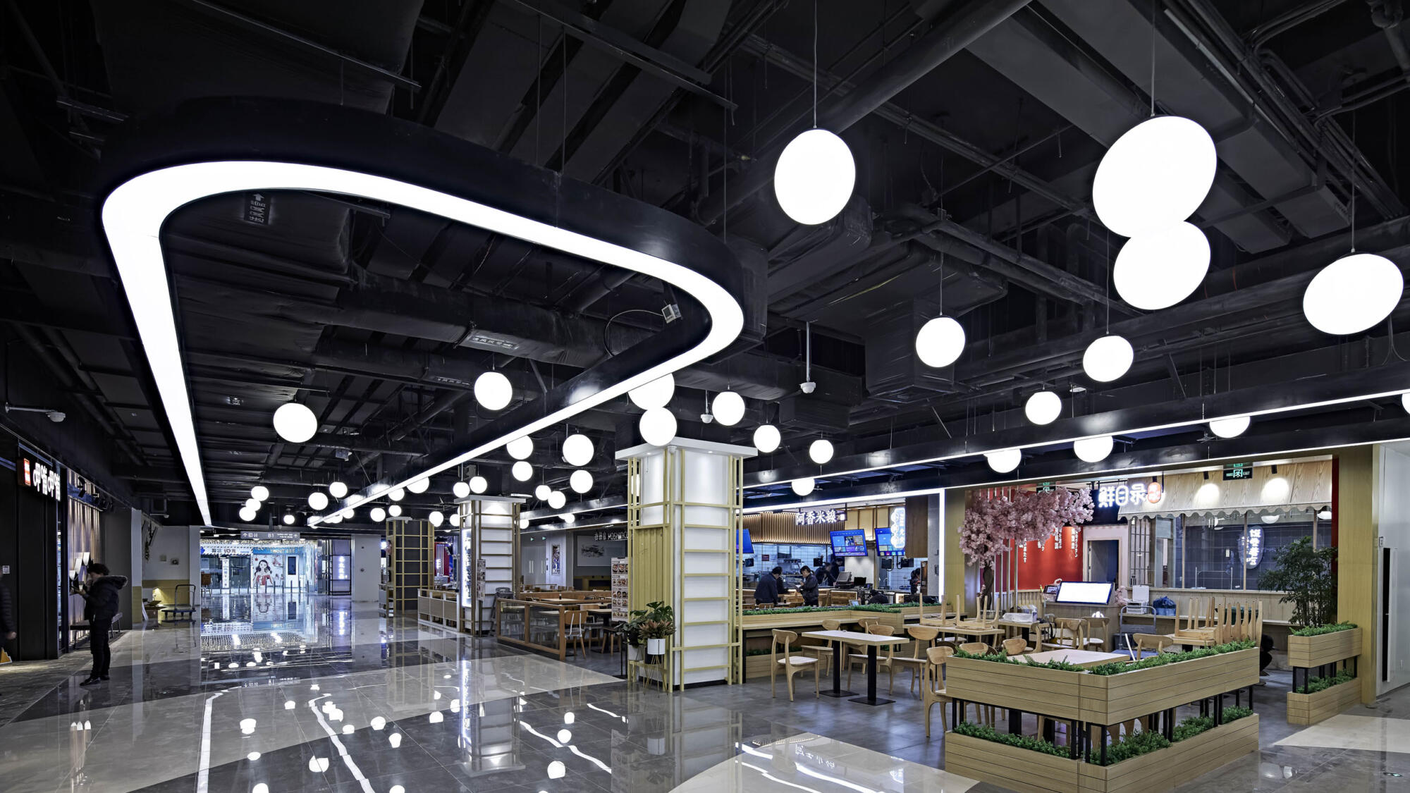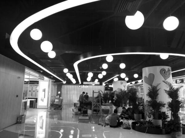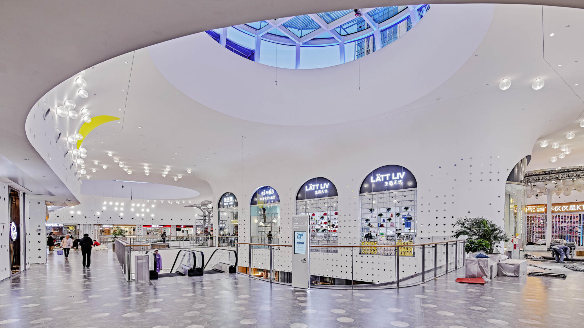 A key design intention focuses on providing a creative social space on the mall’s top floor enticing visitors to visit, capture and share the design on social media. The vaulted double-height spaces were inspired both by Beijing’s imperial archways and the light-flooded renovated factory spaces in Beijing’s Art District which now operate as galleries. Featured details include mirrored inlays and over-sized light bulbs creating interest on the curved surface of the seamless GRG panels.