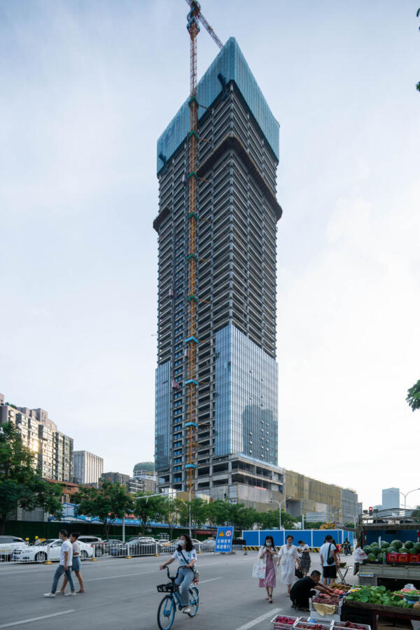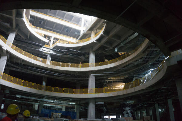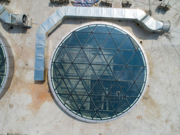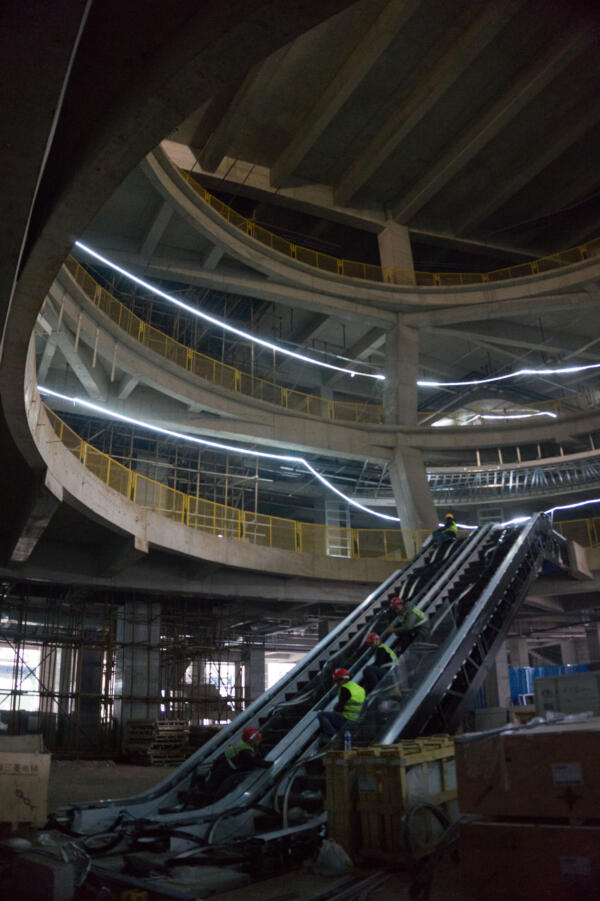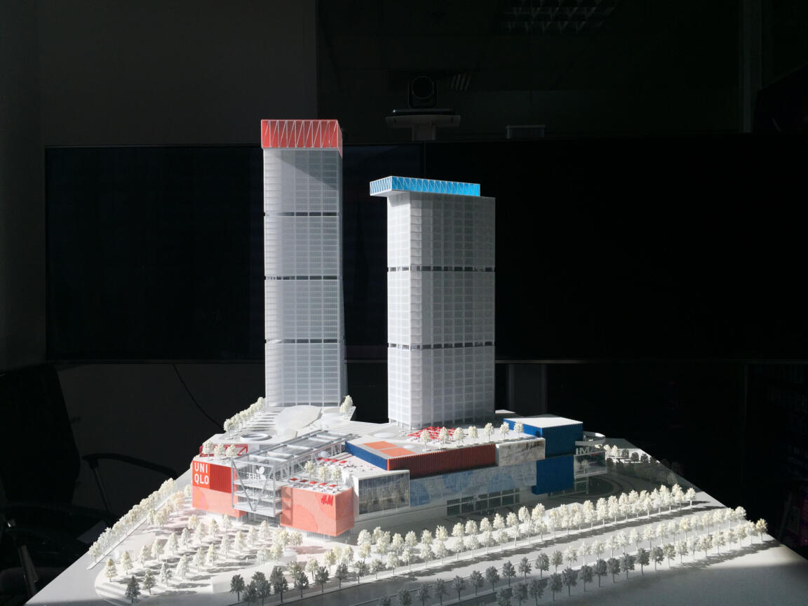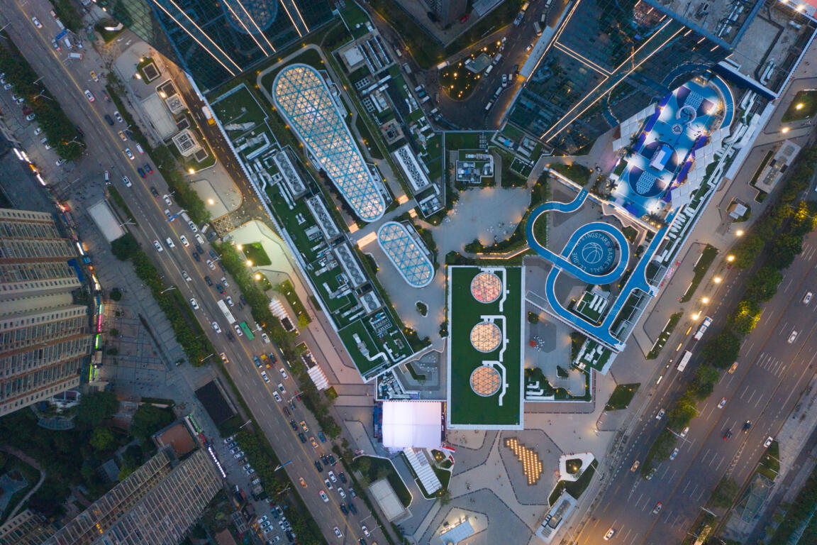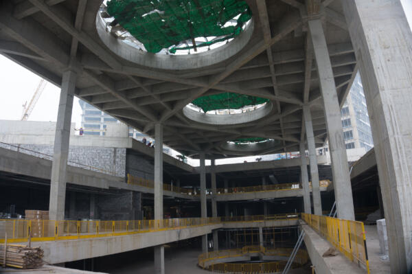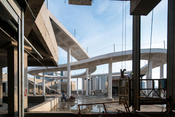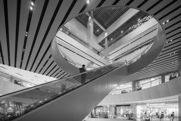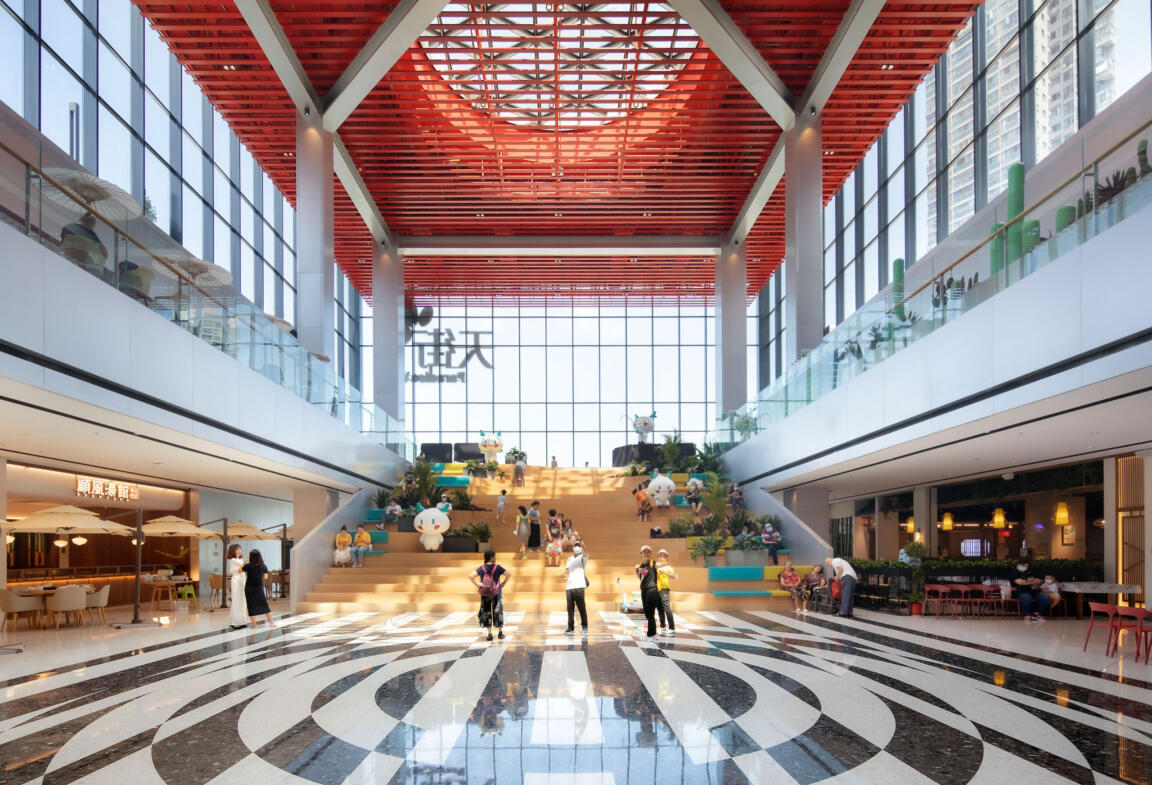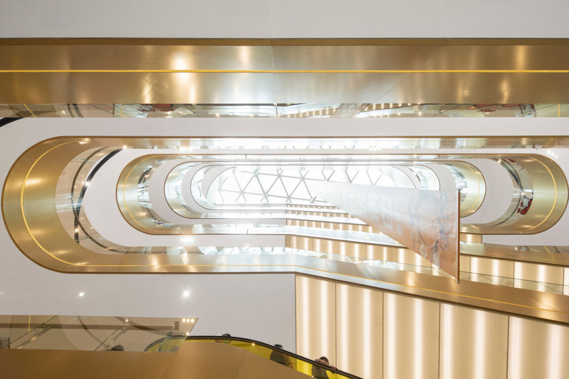 On a triangular plot topped by two office towers, the 110,000 sqm mall’s two wings converge towards the apex of the site, informing the placement of key spaces, their hierarchical order, and their distinct shape.