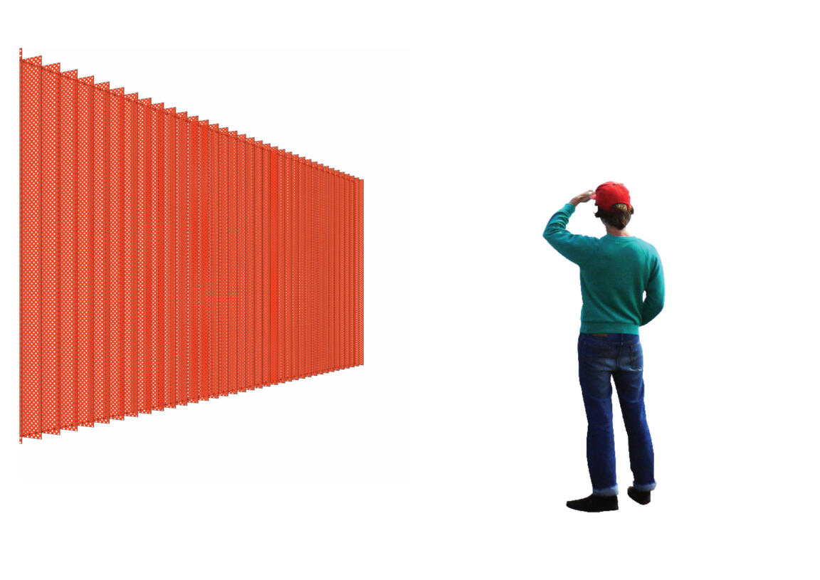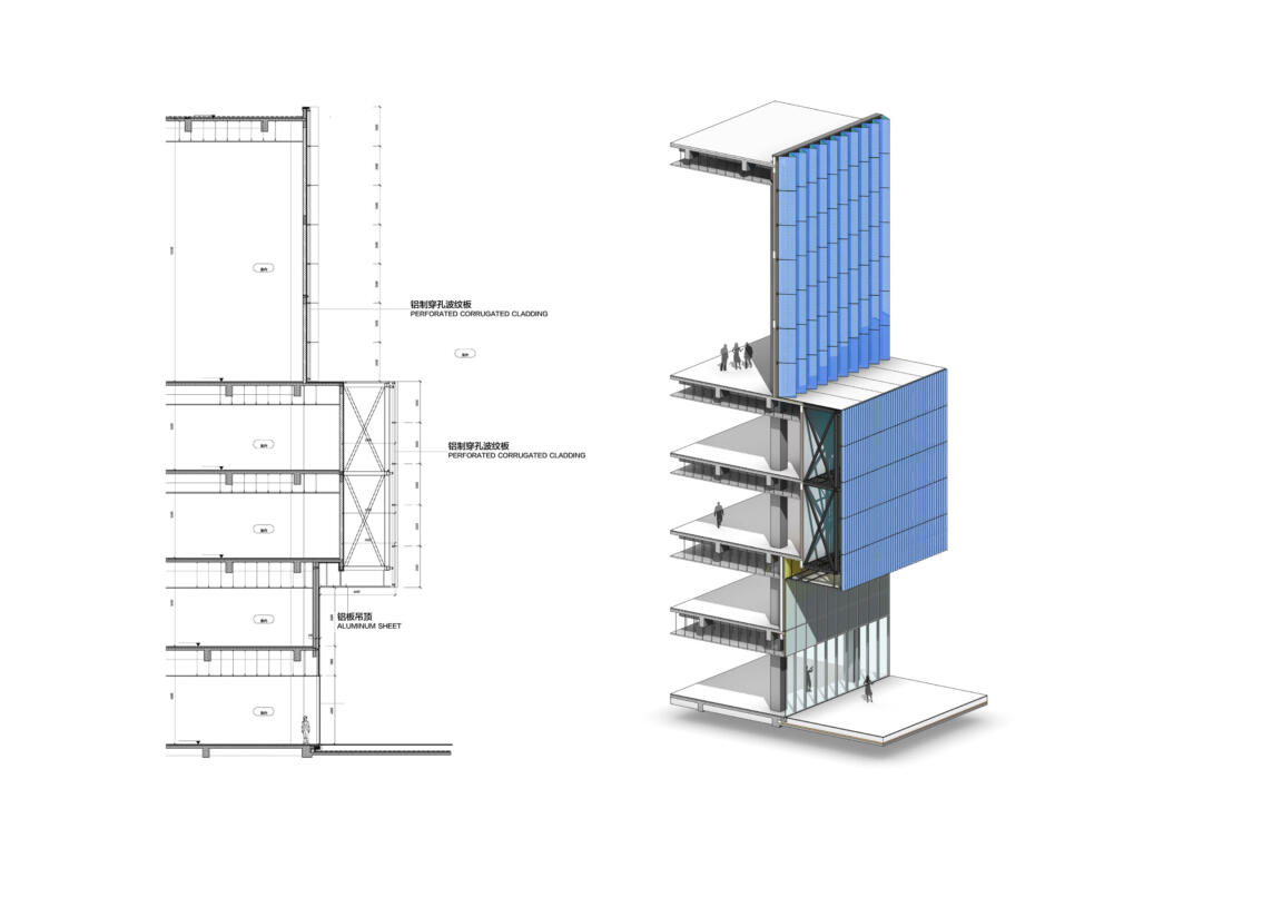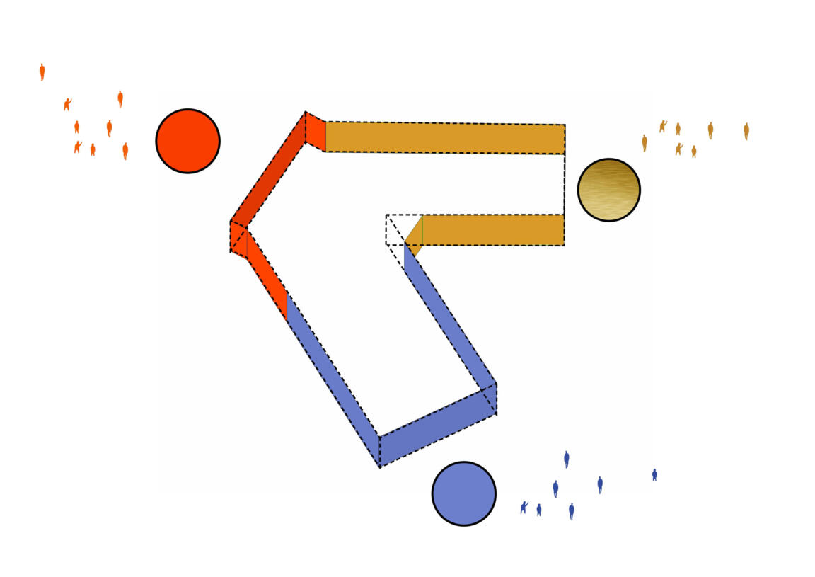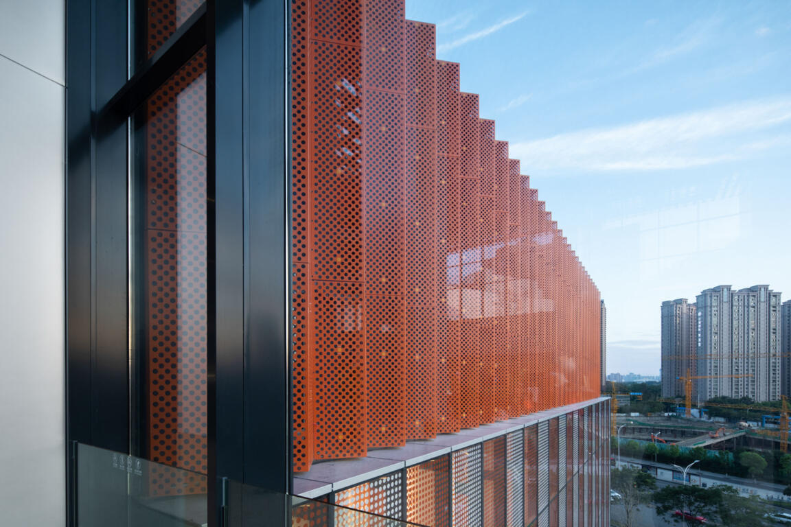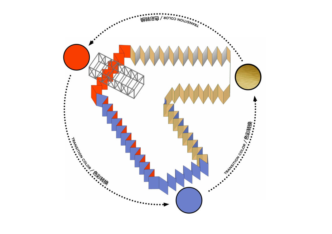 The interior key zones and their dynamics are reproduced in the approach toward the exterior façade design: the corners set out the colour identities of their respective adjacent facades, with each side of the triangular footprint represented in an individual colour scheme of gold, red, and blue. The strong hues diffuse in a dynamically pleated façade that adds three-dimensional depth and a clever two-fold colour play, allowing for different aspects from every view angle. Perforated metal screens feature diverse intensities of corrugation for further articulation and visual layering along the extended sides. This introduces lightness and differentiation to the stacked volumetrics, effectively breaking down building mass.