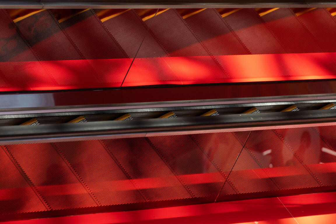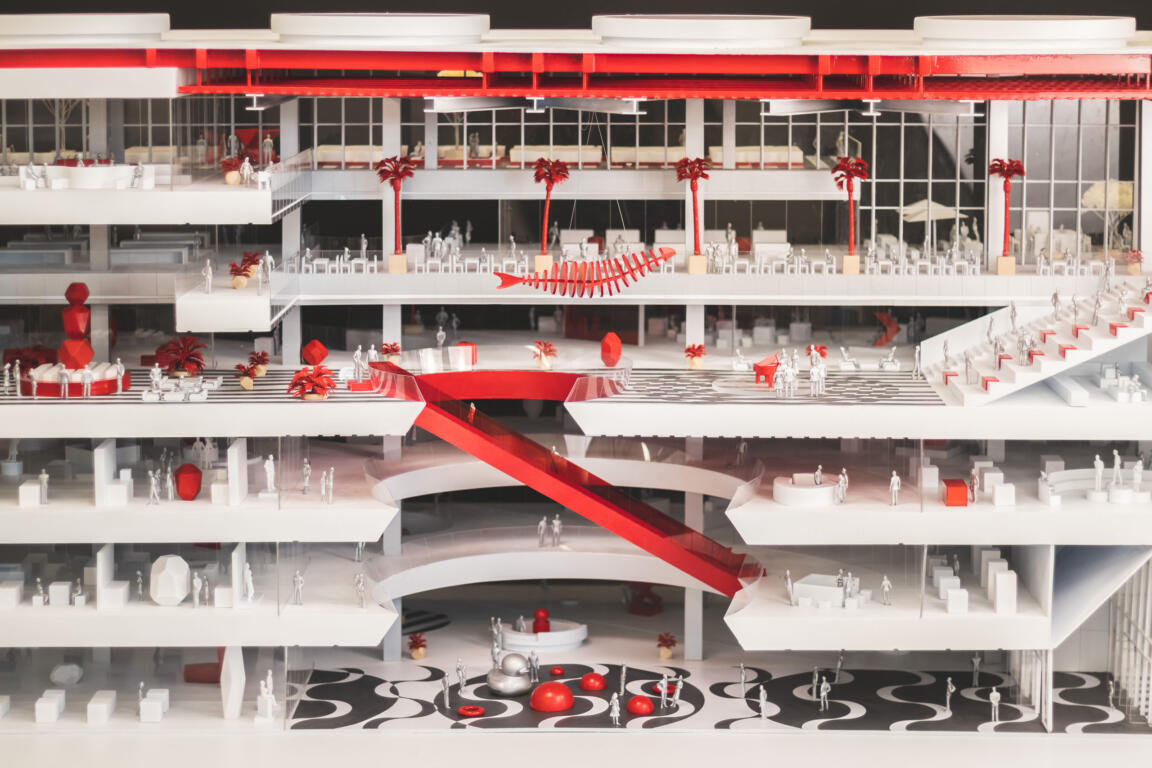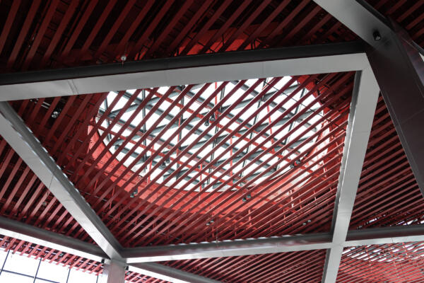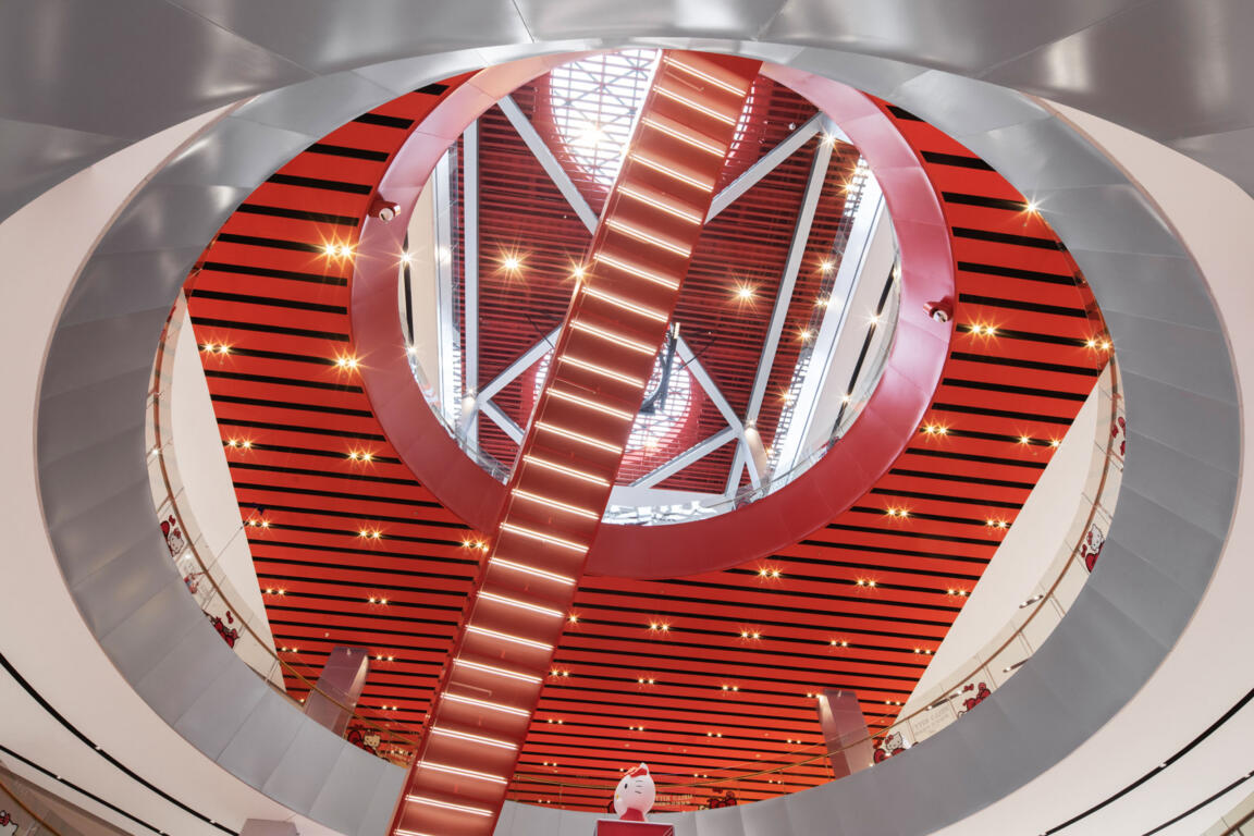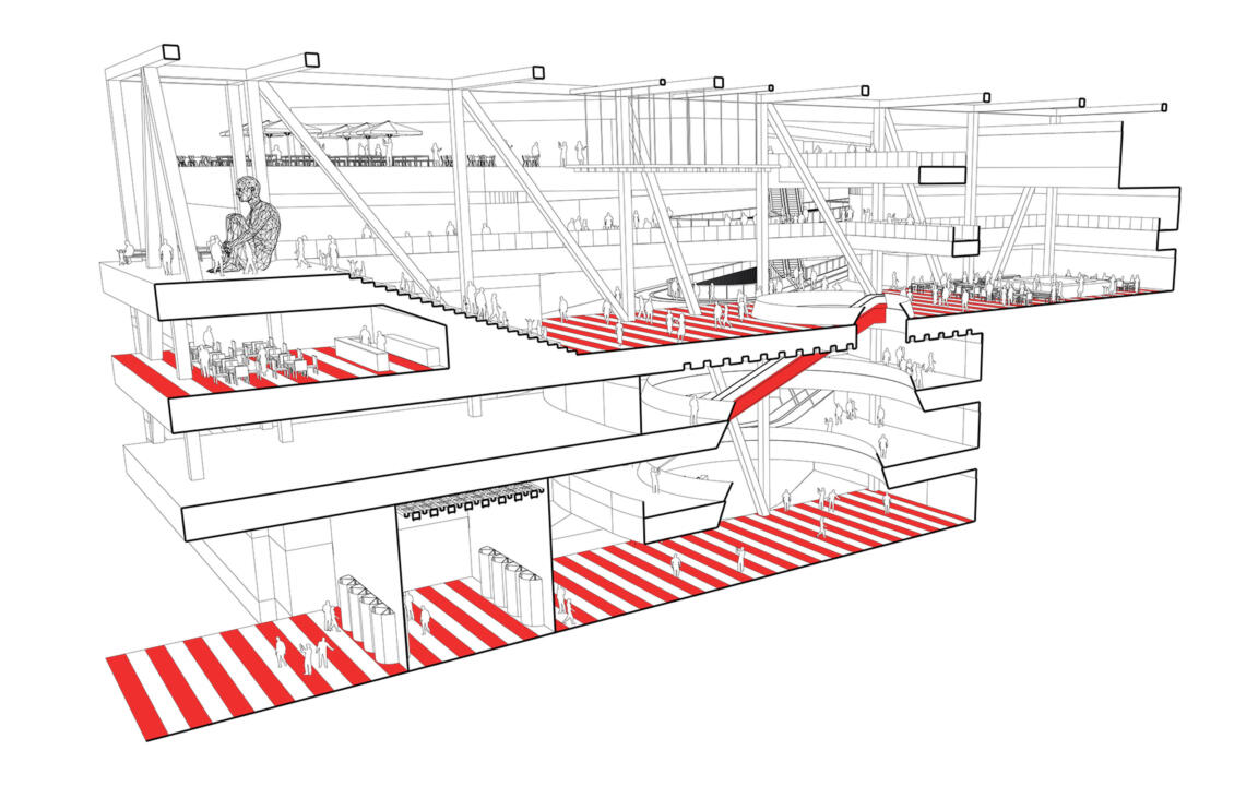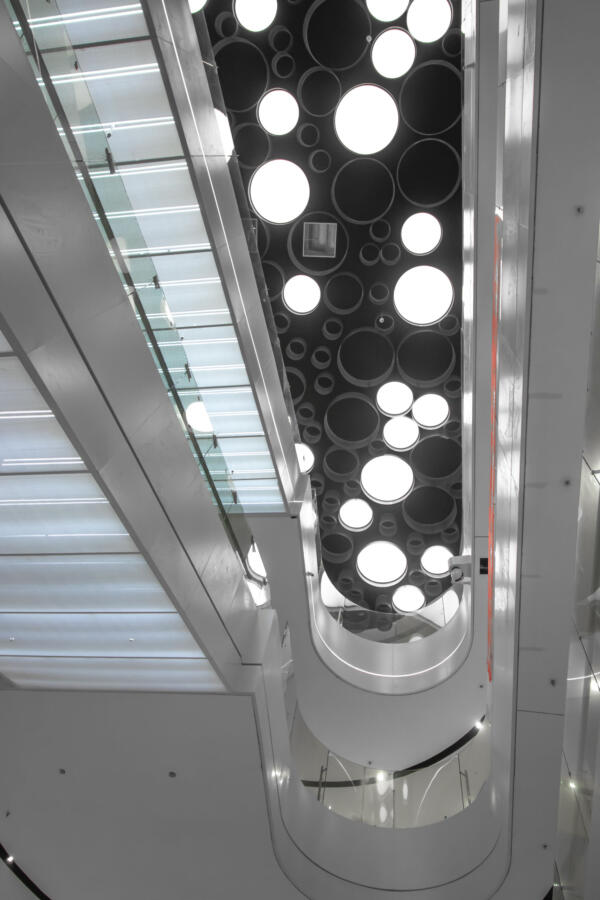 The Bridge, the connecting element between the two wings, acts as a spatial and metaphorical hinge: a central zone for encounter and celebration, a communal gathering point, and a vertical and horizontal distributor. Red feature escalators cross a cylindrical void on multiple levels, moving visitors vertically through this pivot point.