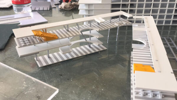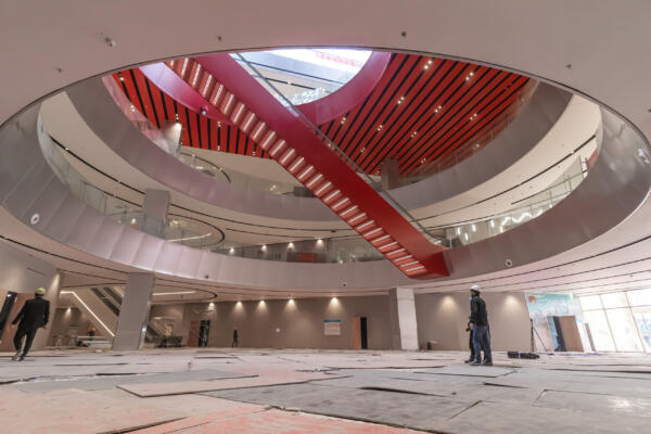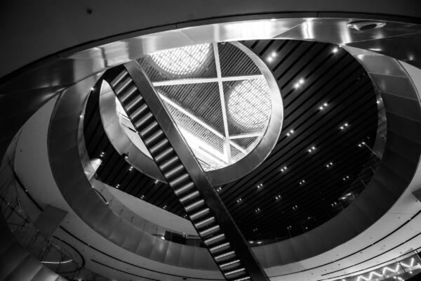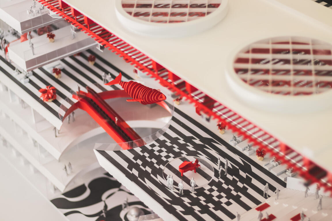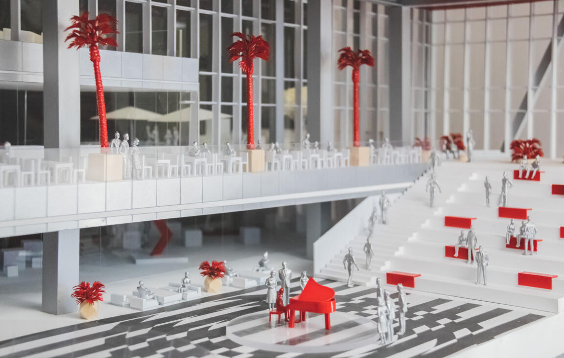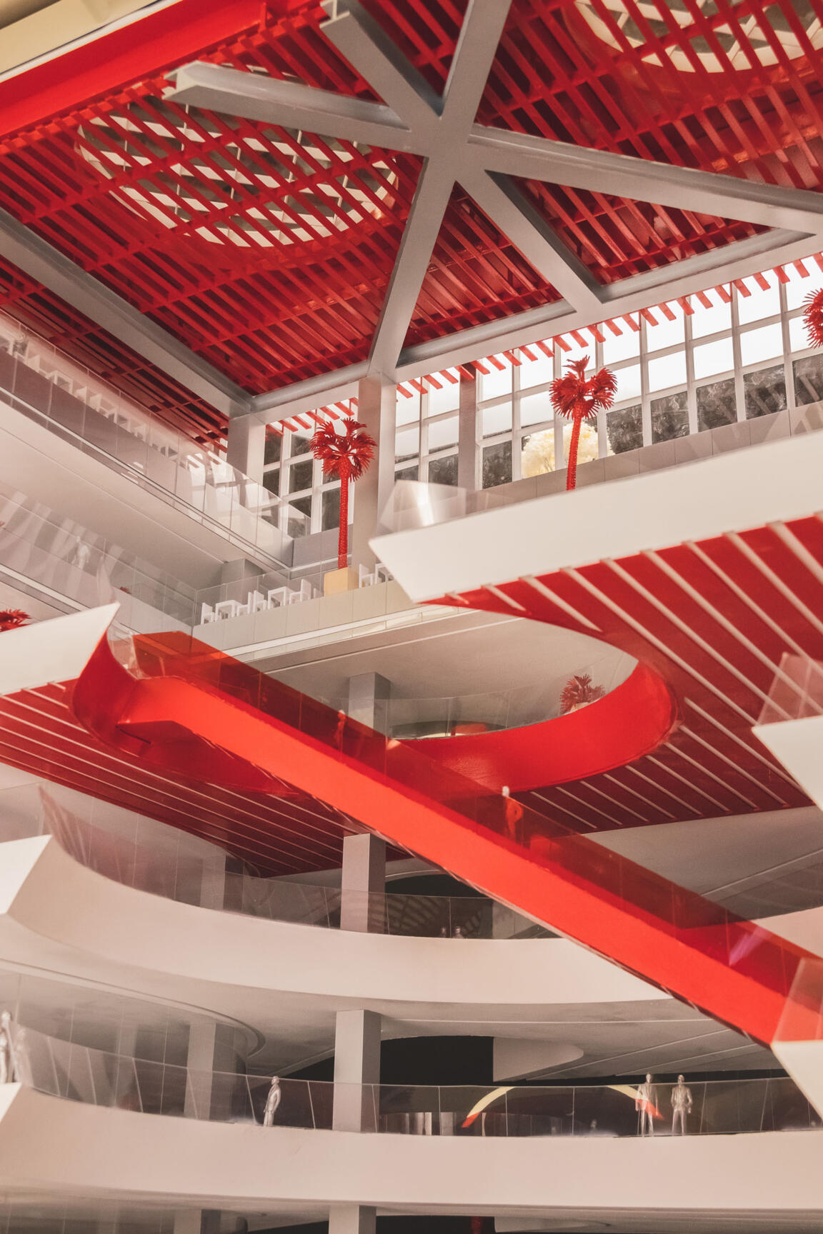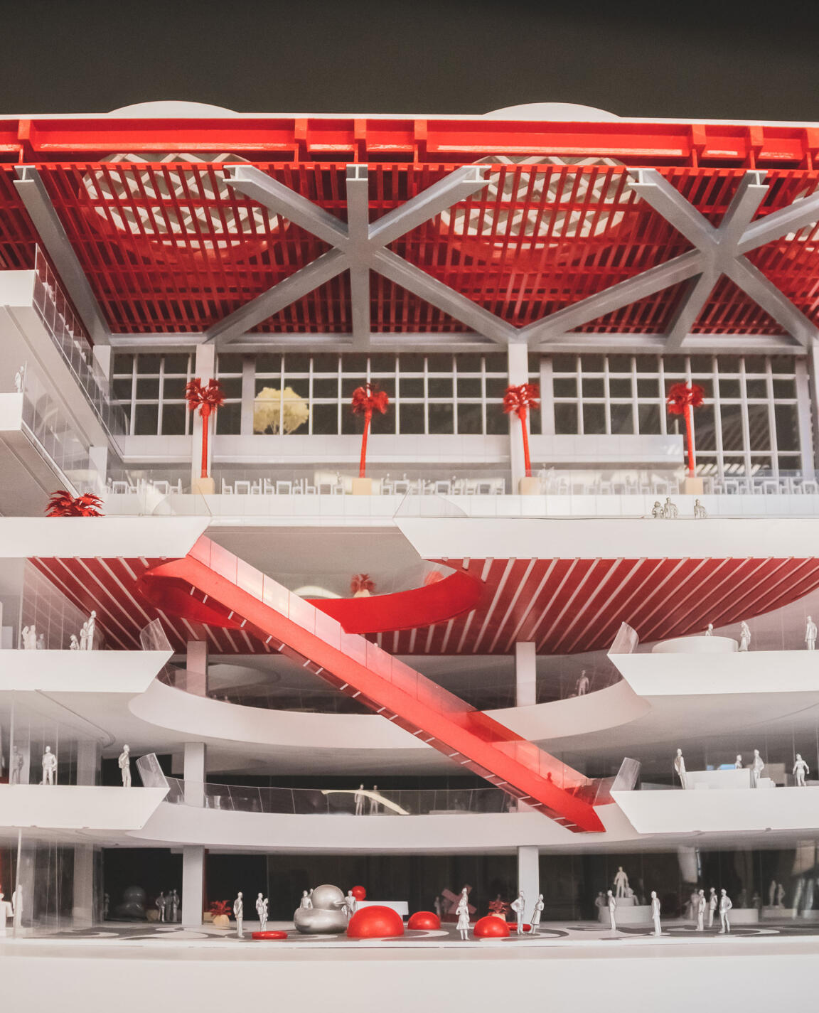 The Bridge, the connecting element between the two wings, acts as a spatial and metaphorical hinge: a central zone for encounter and celebration, a communal gathering point, and a vertical and horizontal distributor. Red feature escalators cross a cylindrical void on multiple levels, moving visitors vertically through this pivot point.