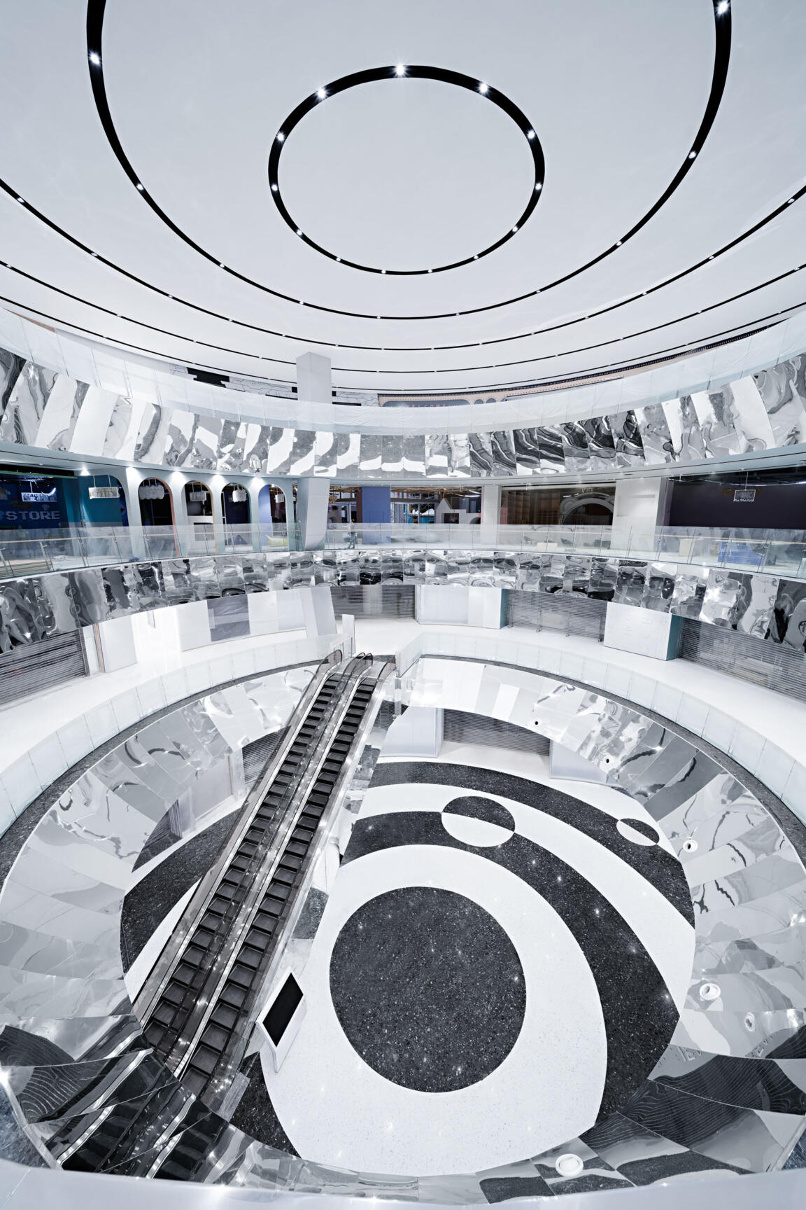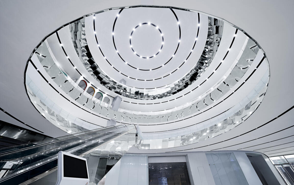The Source stands as the origin of water as it emerges from the ground. The spherical multi-story atrium symbolizes concentrated power in concentric monochrome patterns that energetically direct movement. The dense ceiling orbits are mirrored in the black-and-white circles of the floor to anchor the space at its base. Mirror accents in the vertical circulation create bright visual effects, with escalators appearing to cascade as they transport people from one level to another. Connecting to the metro hub, the Source is the discharge point of allocation into the development.
