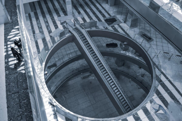 This transit base induces a dichotomy in the functional setup of the retail floors: its hub character strives to swiftly accept, channel, and distribute large passenger volumes vertically into the business zones, while the retail aims at attracting and retaining visitors to dispense them horizontally into its multiform commercial environment.