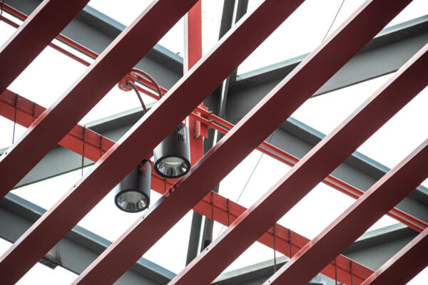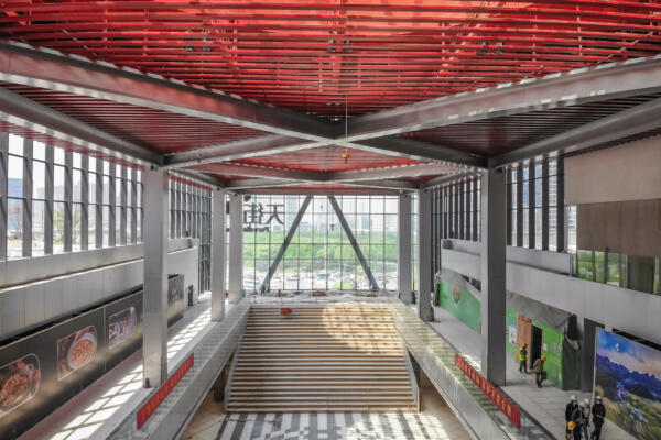 From here, a linear event space stretches out to culminate in a full-width landscaped stair that leads up to a panoramic window: an elongated cantilever that prominently reaches out into the surrounding cityscape. The bridge narrative continues in the industrial feel of the bright red exposed ceiling structure.