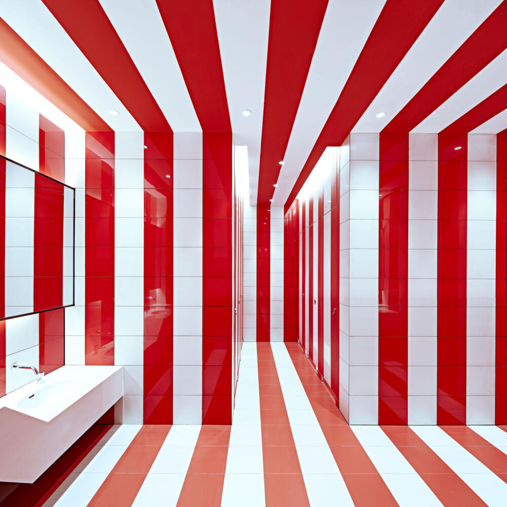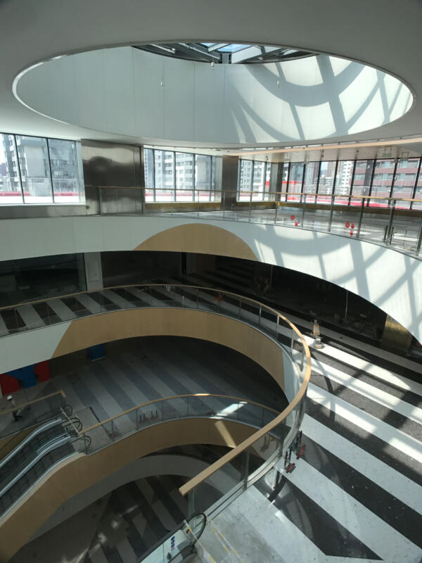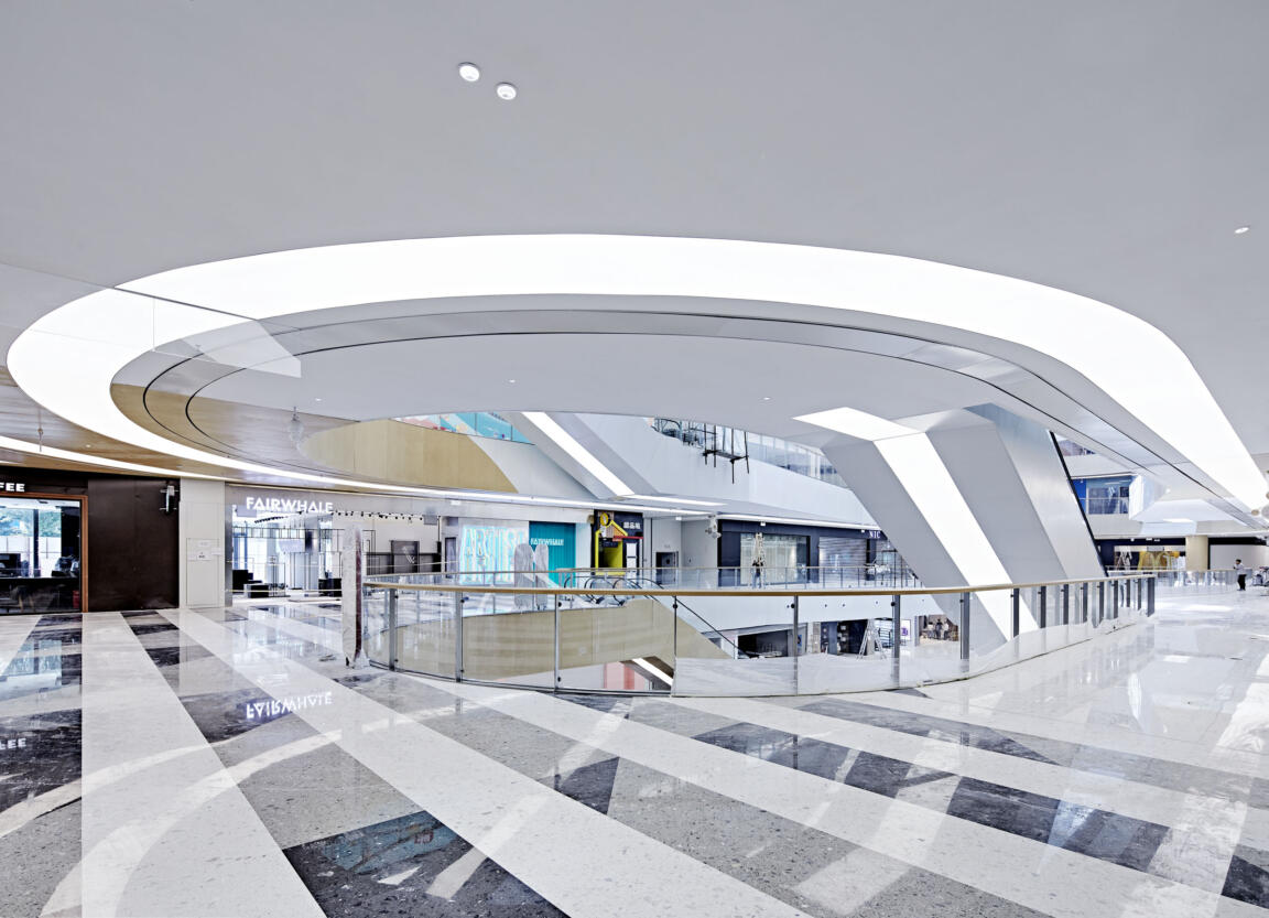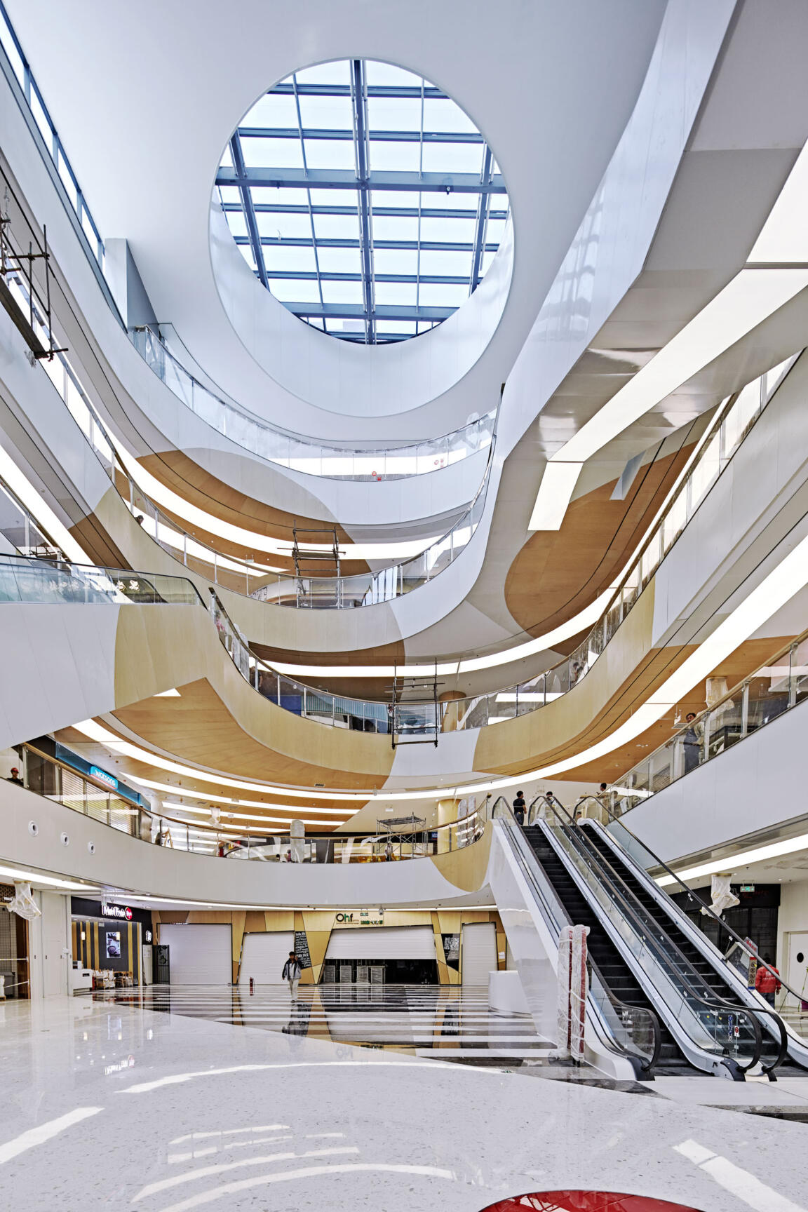 Seeking to appeal to children and their families, the interior design features abstracted images of planets and space travel to encourage exploration. The design of the atrium space plays with optical illusions by projecting parts of circular shapes on atrium galleries, walls and ceilings, distinguishing them with colour and timber finishes. The scattered shapes form perfect circles from specific viewpoints. Customers are engaged in discovering these viewpoints and capturing their experience on their camera phone.