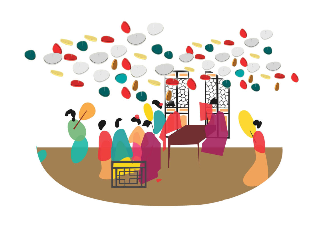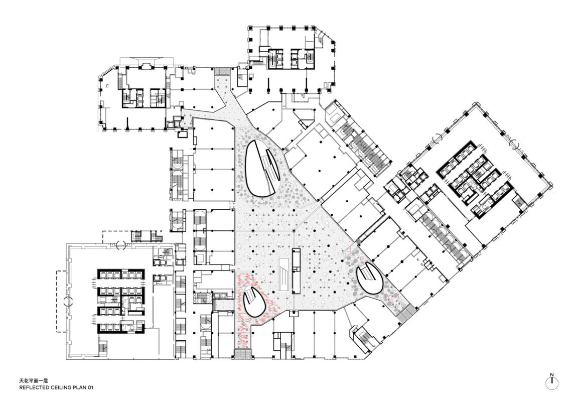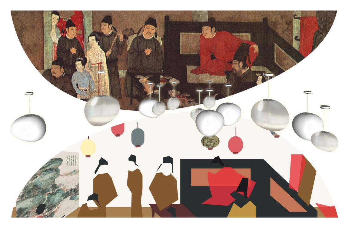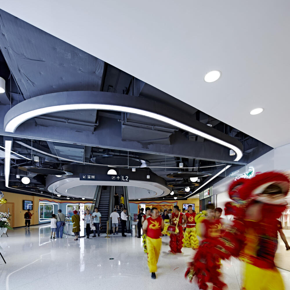 CLOU’s inspiration for the interior design of Tianhui Centre came from a historic painting that depicts the leisure life of the royal families of Emperor Yongzheng. The traditional Chinese elements such as the pavilion, umbrella, hat, lantern, mirror and fan have been turned into attractions integrated into the ceiling design.