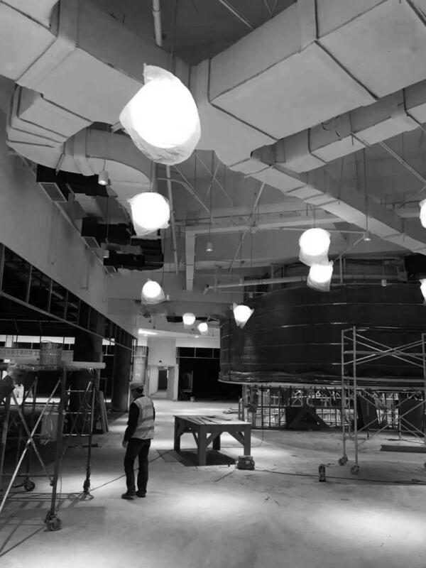 This design combines lighting features of different themes and shapes – balls represent lanterns while chromatic LED tubes resemble raindrops and umbrellas – allowing for a focal point and adding more fun to the interior atmosphere.