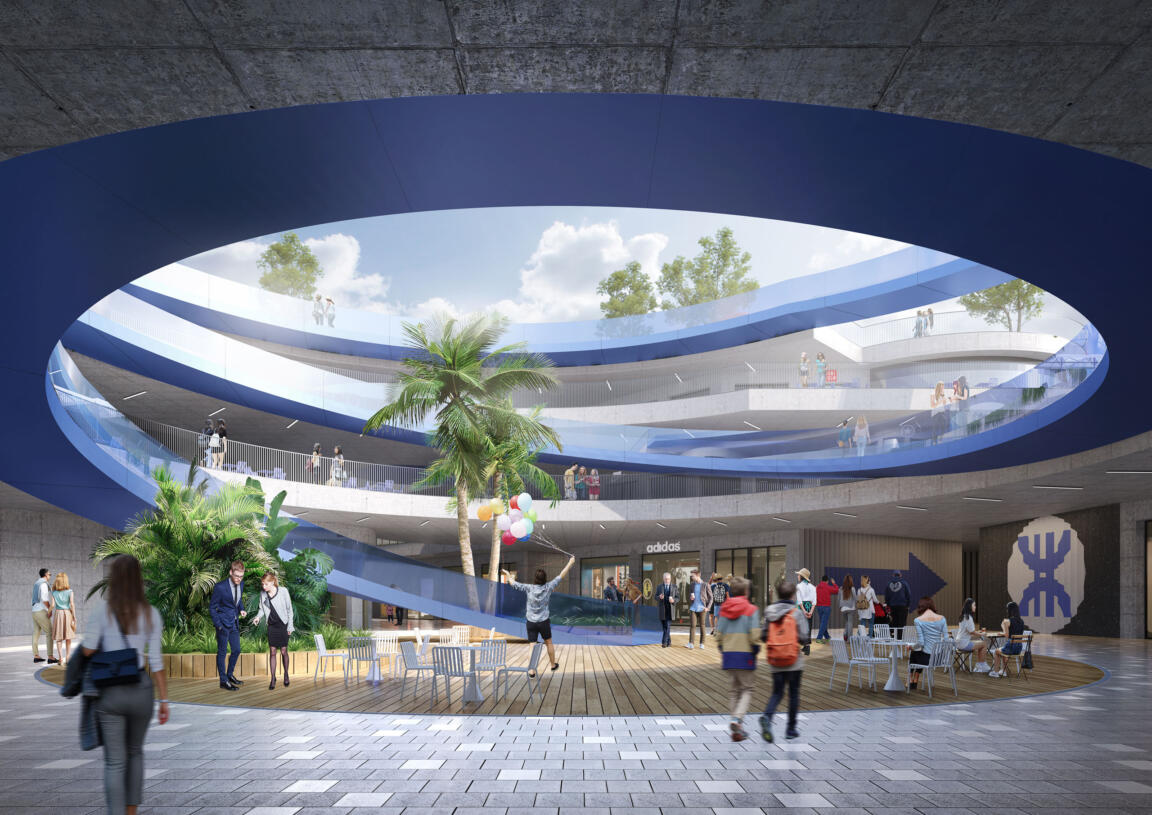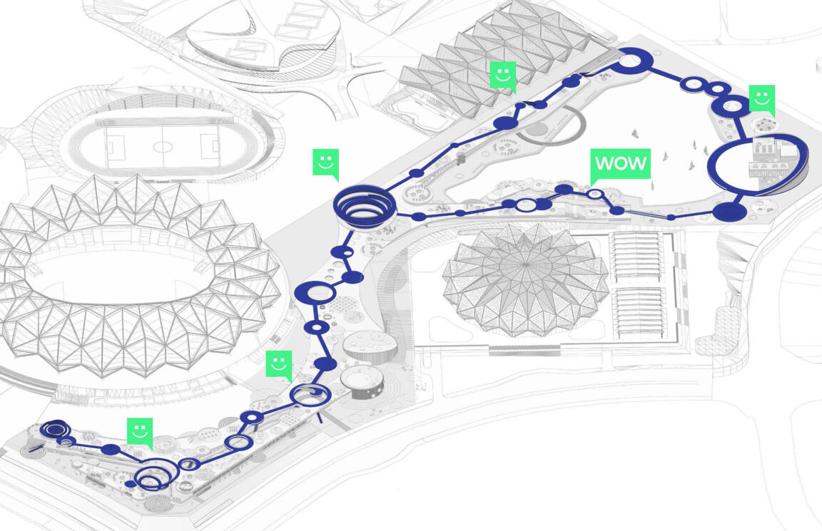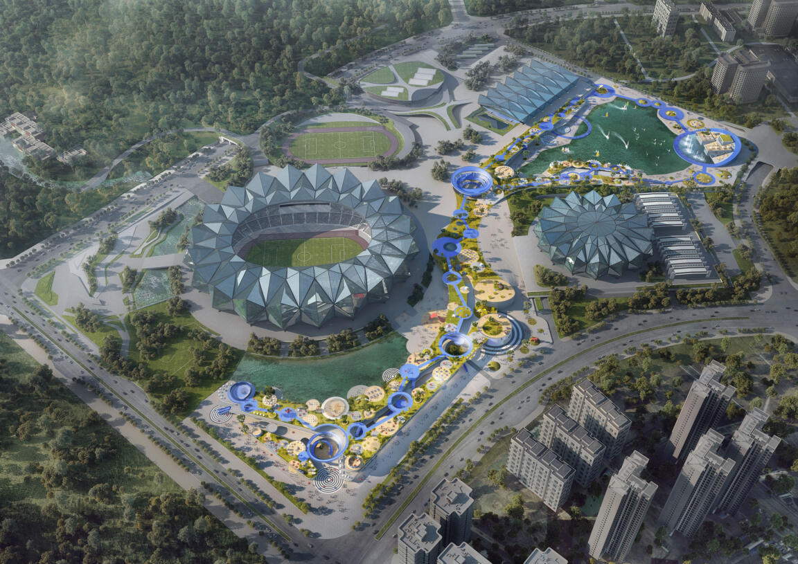 Stretching across a length of almost one kilometre, the mall winds around two stadia and several indoor sports venues, to interconnect them on two above and one below ground layers. A continuous roofline with a feature running track covers three distinct areas: a sports and fashion zone at the main corner towards the large stadium, a children’s and entertainment zone towards the green core of the sports site, and a leisure and culture zone around a large water feature and amphitheatre to conclude the experience and lift it into the outdoors. The mall circulation transitions from indoors to outdoors, with external corridors lined by greenery.