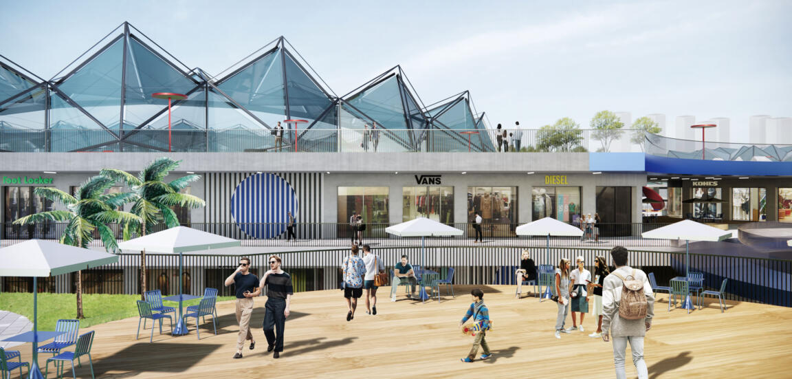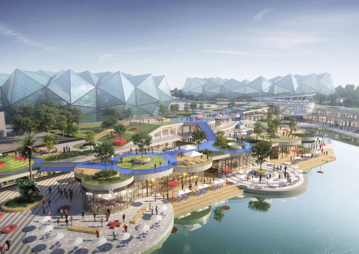 Weaving together the different sports venues of Shenzhen’s 26th World University Games in Dayun, an elongated retail mall serves as base for a multi-level leisure park: an urban living room that revitalises the area with everyday uses, attracting local residents, business people, students, and families alike.