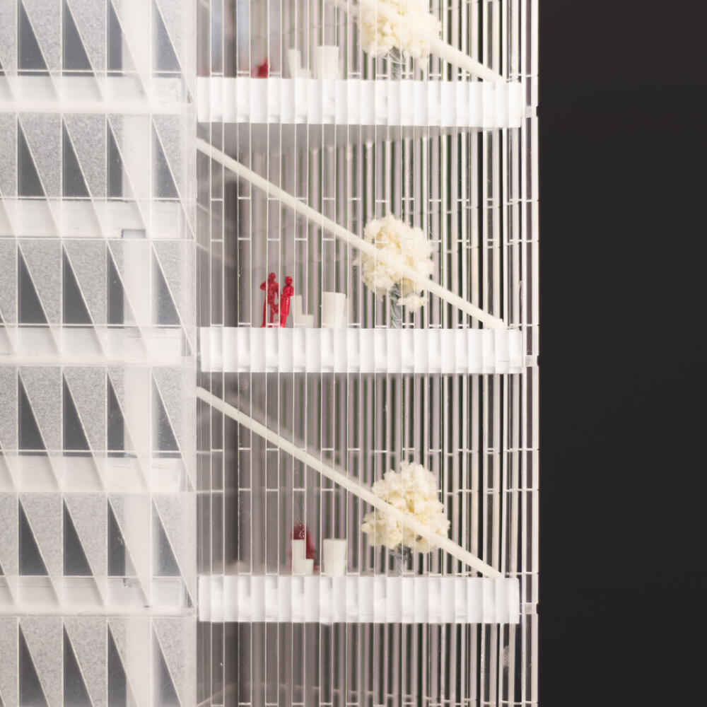 124米高的办公塔楼投影与地块的核心位置。尖角部位的楼板每跨两层形成一个视野绝佳的高空观景台,同时也是室外休息区。CLOU视室外办公空间为办公文化革新的下一步。