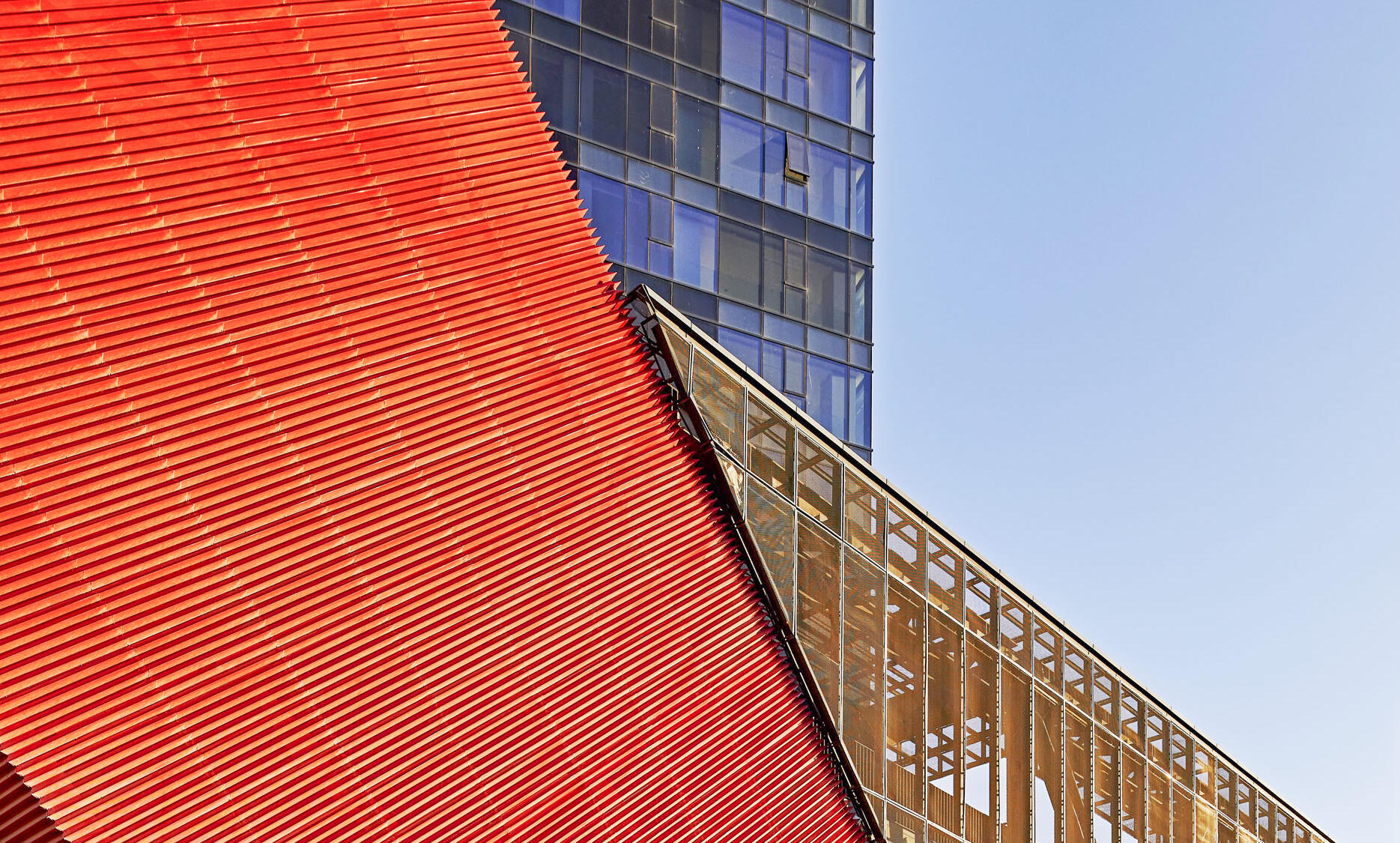 办公塔楼三角的形态在面向主路口的一侧创造了有力的形象存在,而在不同角度下又显得优雅、纤长。塔楼的三角形态是一系列务实的判断结果,包括将办公楼面向新建公园一面的景观视角最大化,同时结合尖角部位打造两层通高的高空观景台。俯瞰临近公园的平台提供了可以一览美景的舒适休息区。
