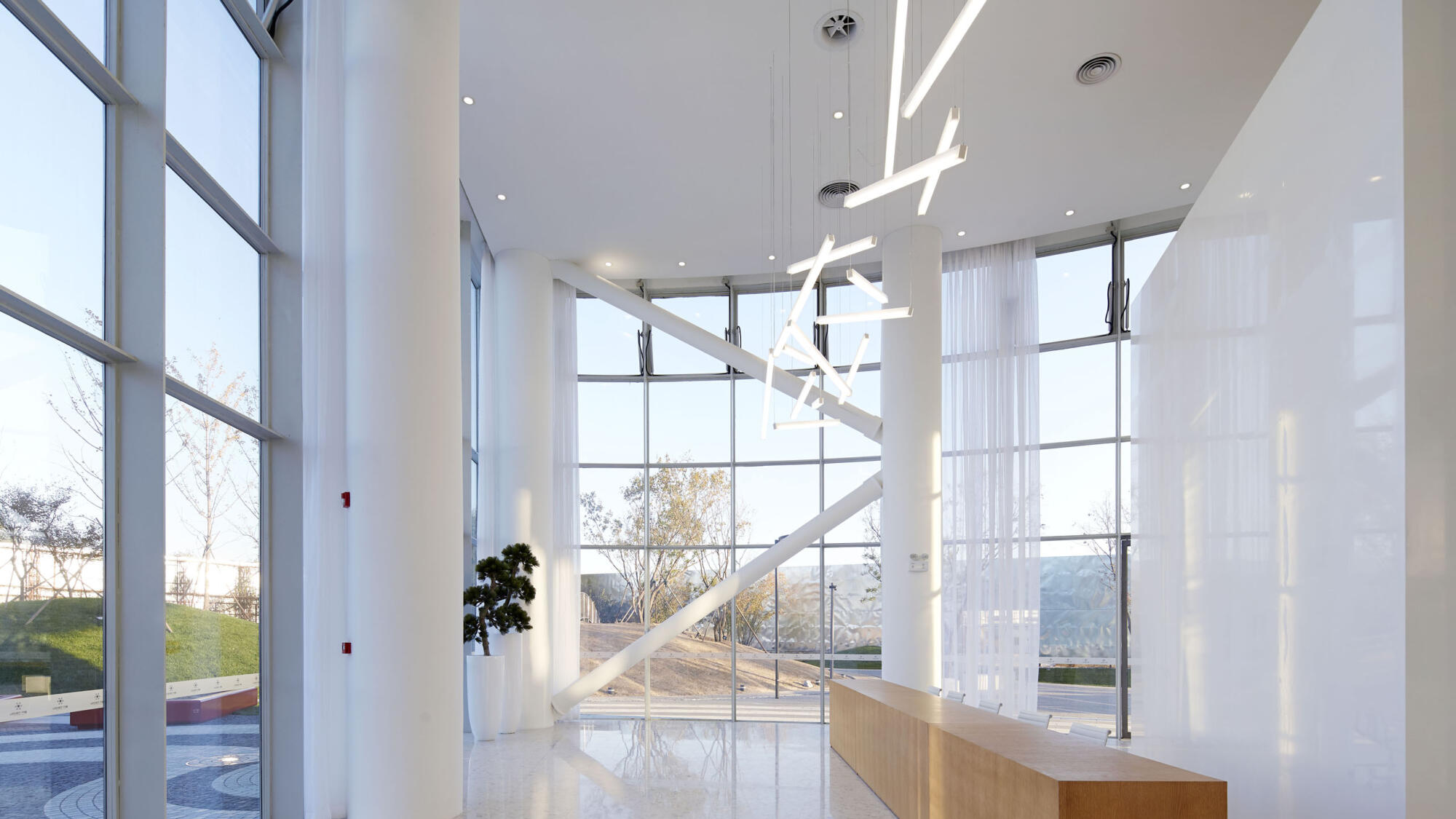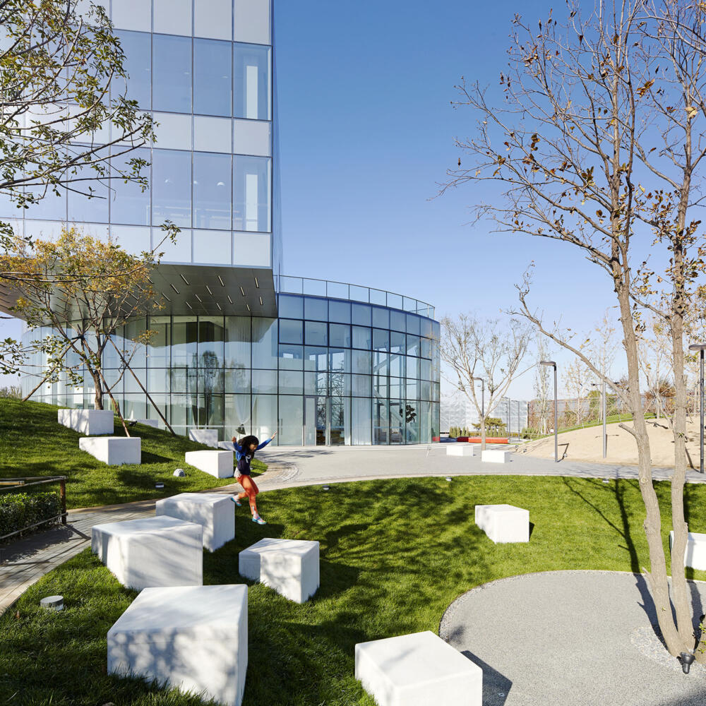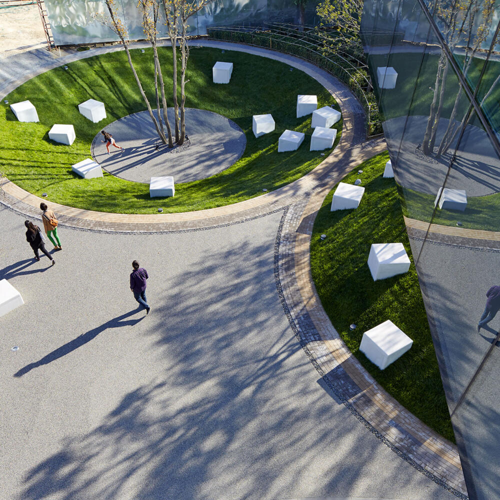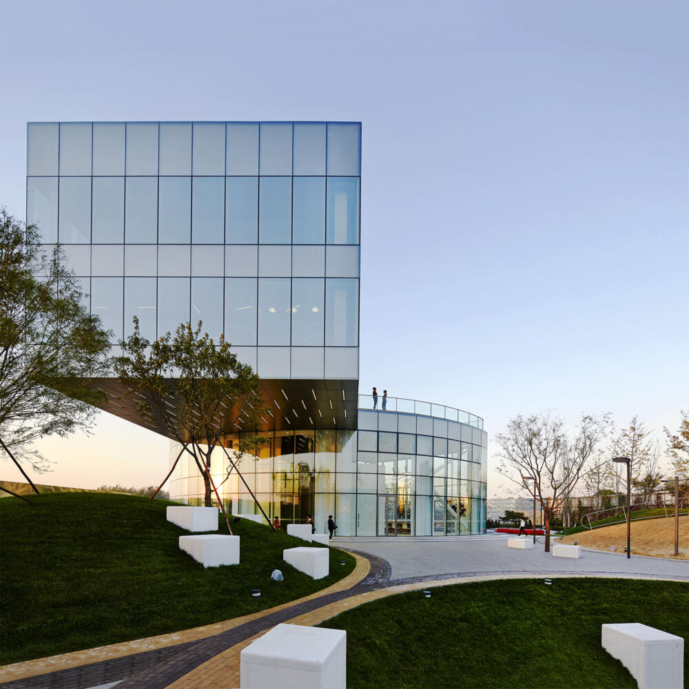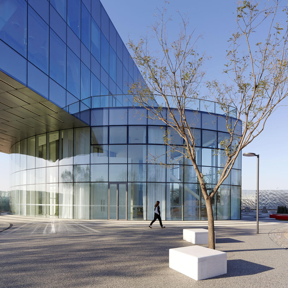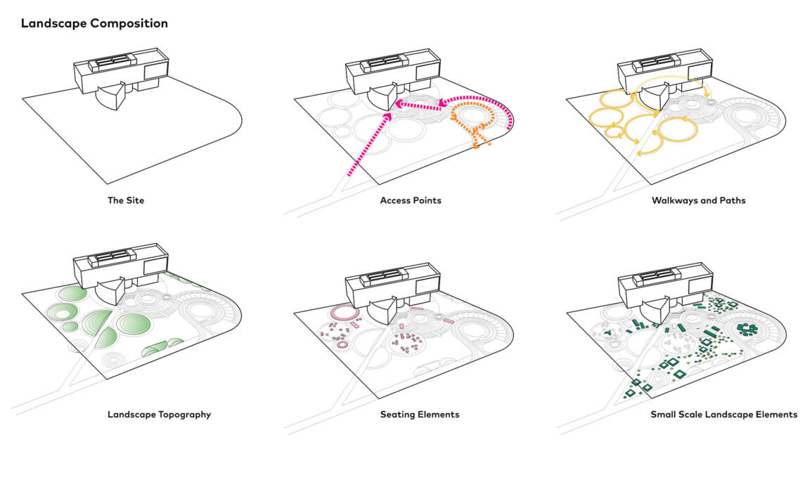 The sales gallery and its surrounding landscape demonstrate the design direction of the new leisure and business centre, an emphasis on the human scale and a prioritization of functional ambiance.