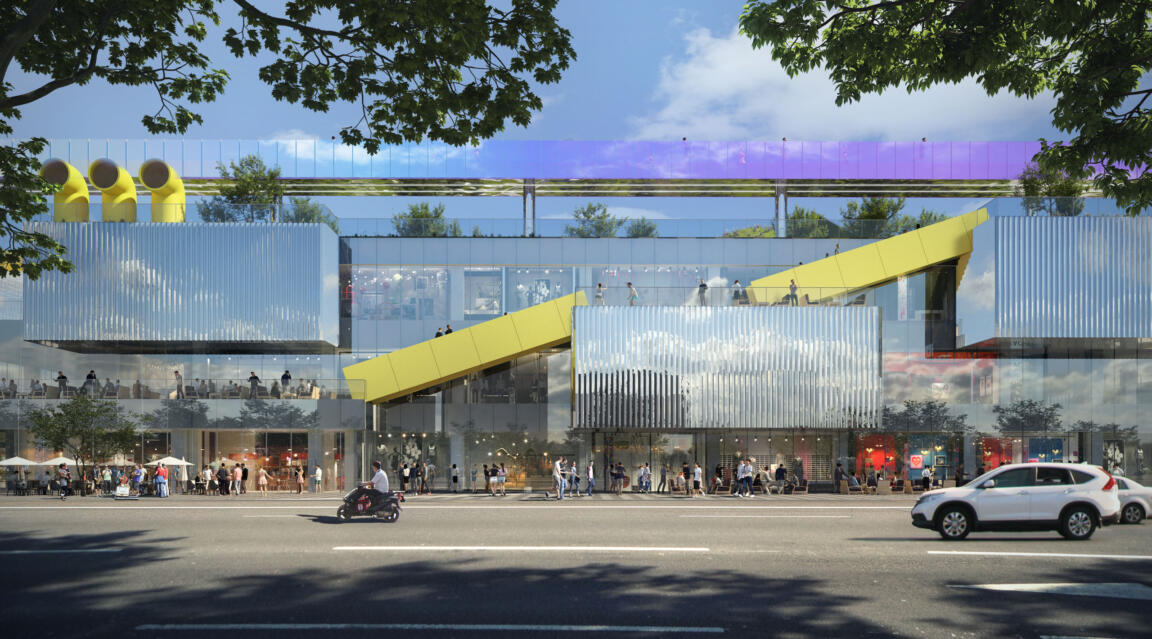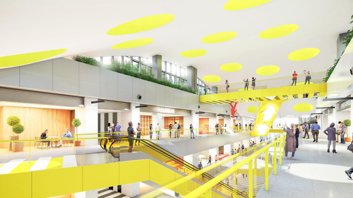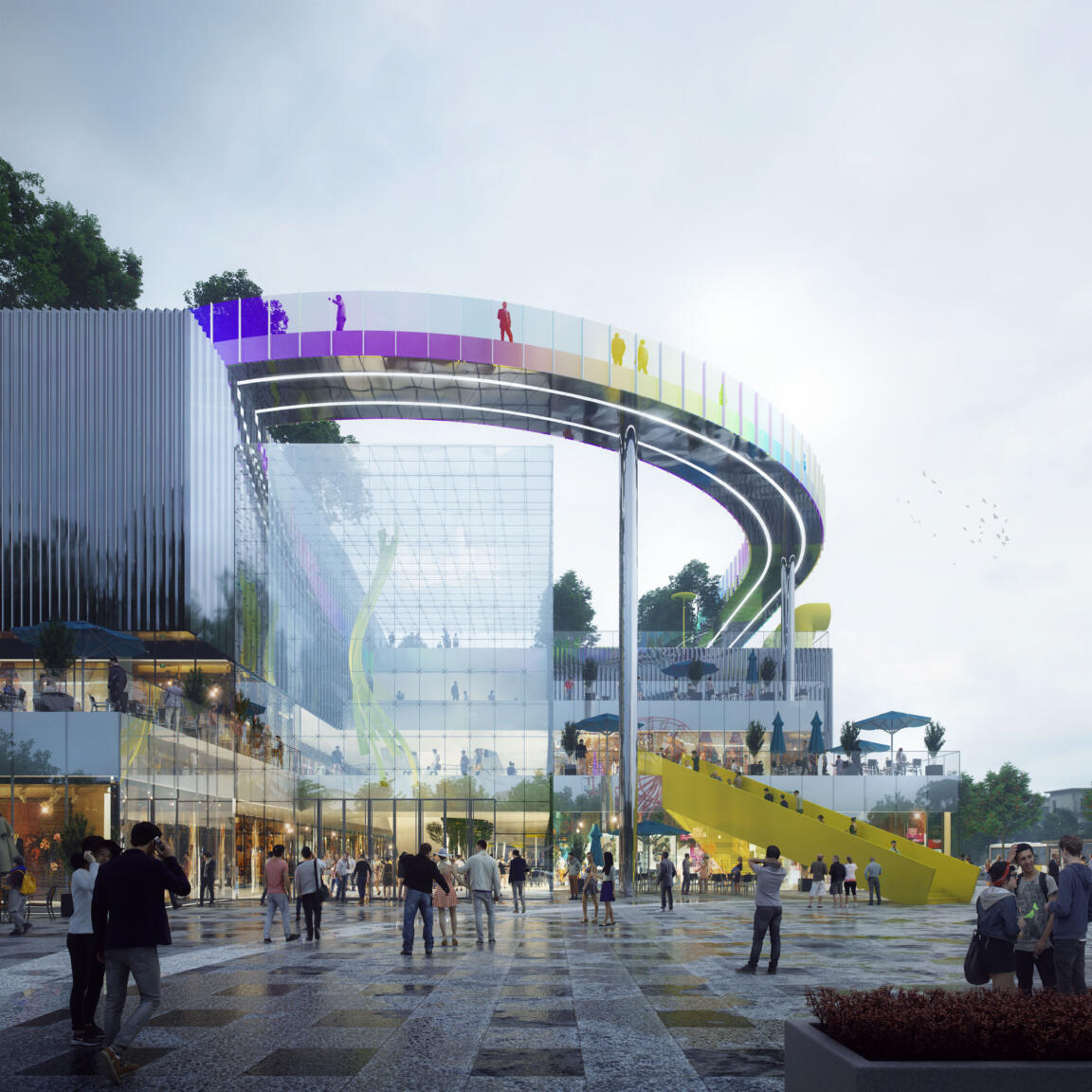 The facades’ materiality plays on the project’s name SkyMall. Triple height glass volumes at the entrances draw in shoppers and invite generous amounts of natural light. Boxes clad in corrugated refract the sky whilst the dichroic glass enveloping the running track tinges the panorama of the neighborhood in many colours.