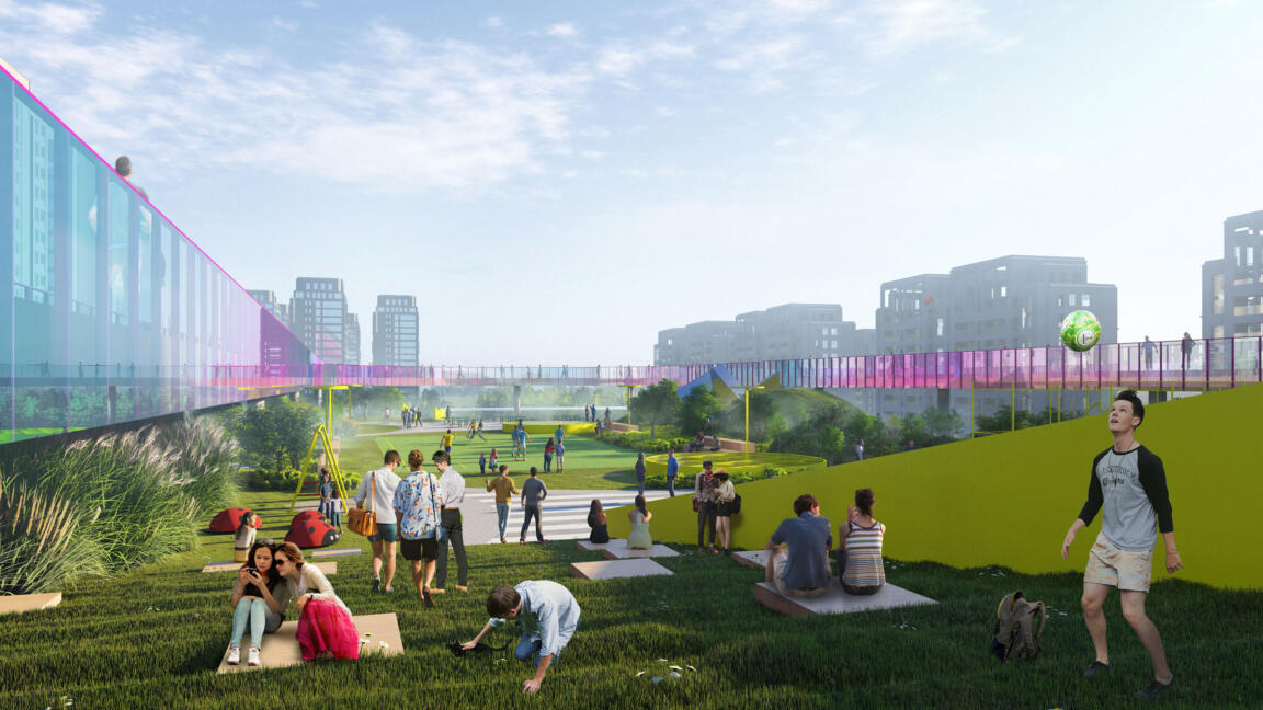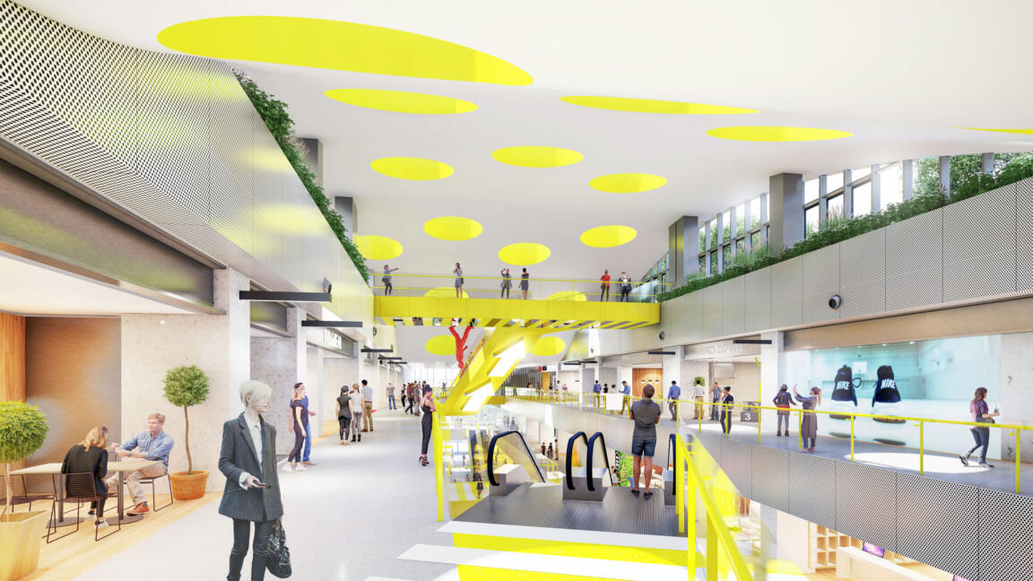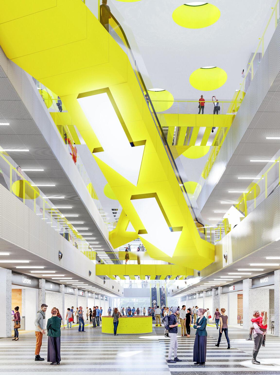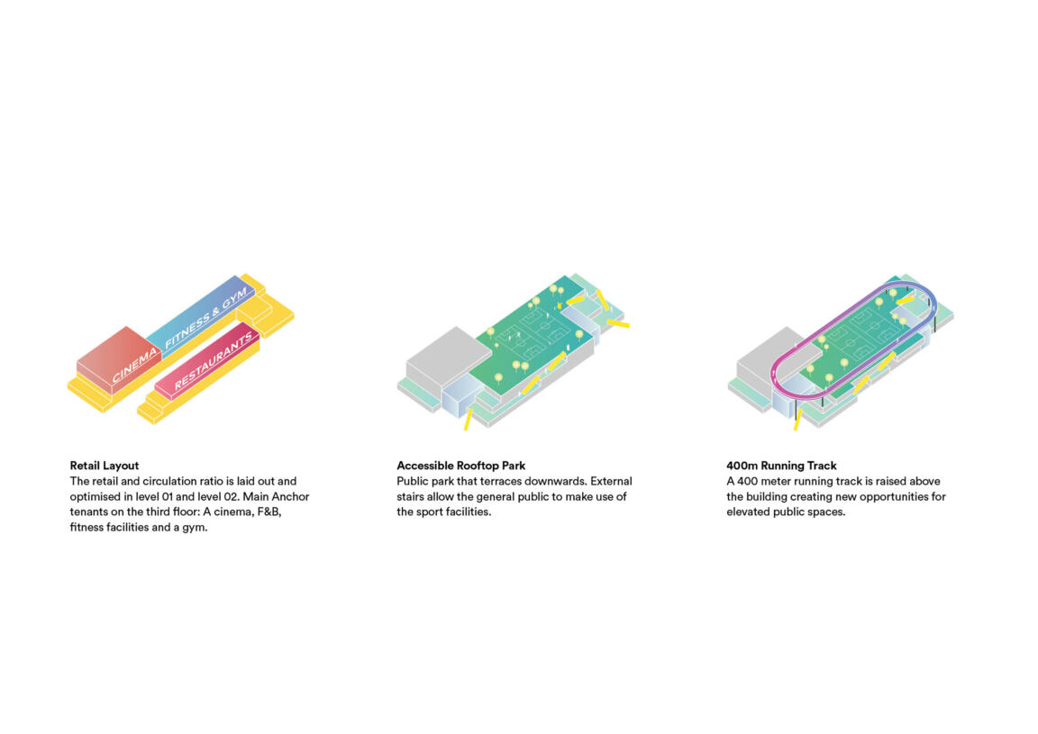 The proposal features a rooftop sports park that is open and free of charge throughout the day. 400-metre running track on the roof loops around gardens and sports fields, promoting daily workouts to the community. Yellow external staircases ascend the stepped volumes of the SkyMall providing access to shoppers and members of the public alike. Restaurants and shops open onto these stepped terraces, creating a sense of street life above the ground floor.