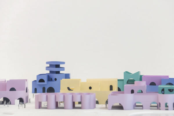The individual building shapes play with the absence of scale, in an interpretation of how abundantly children see the world: