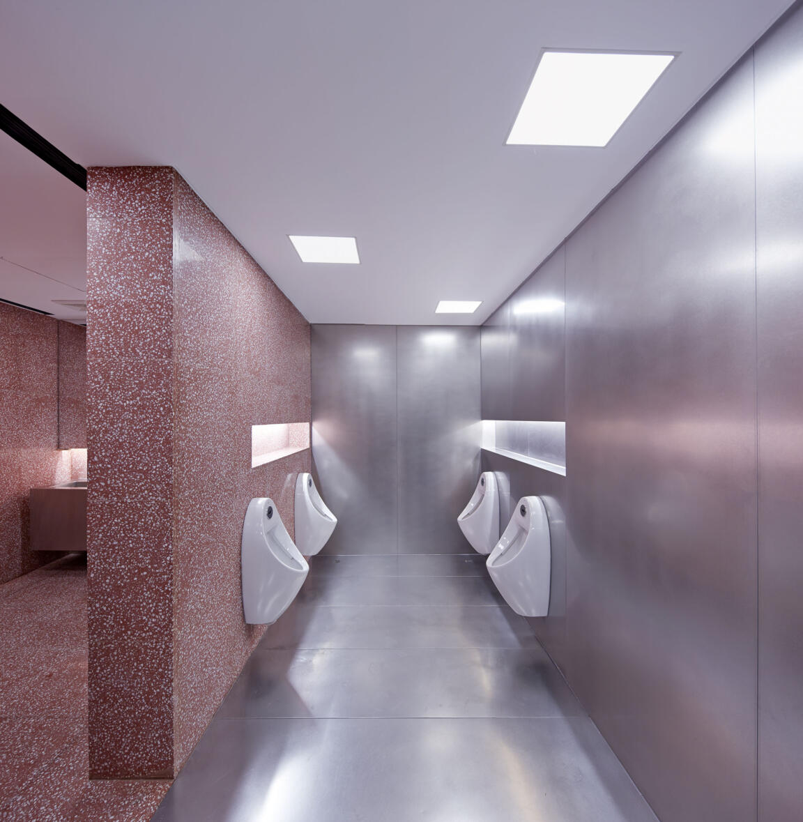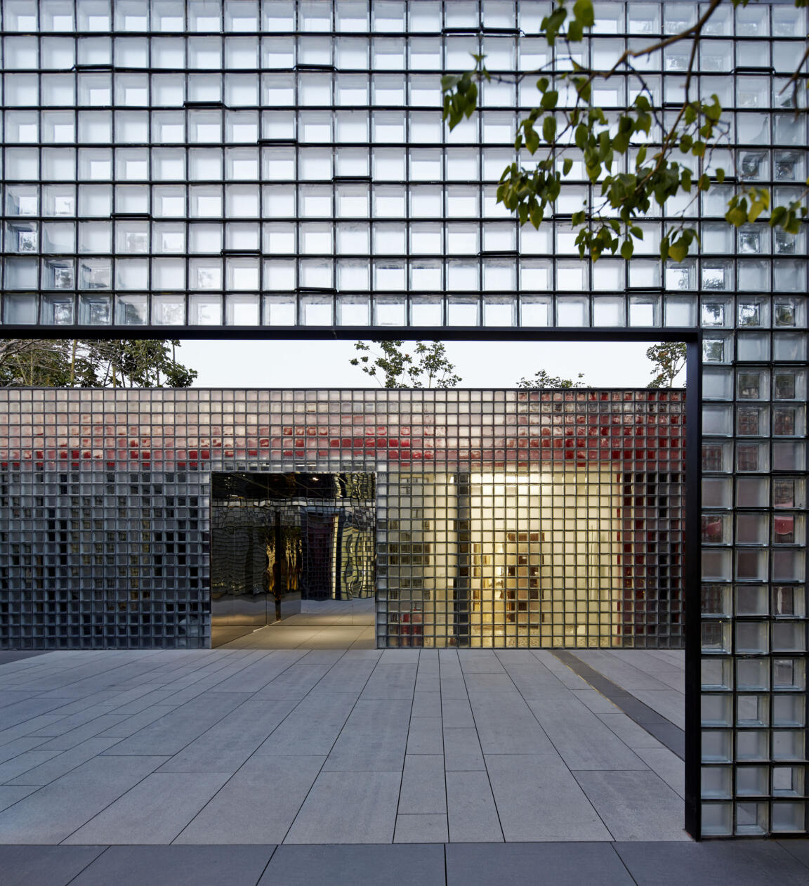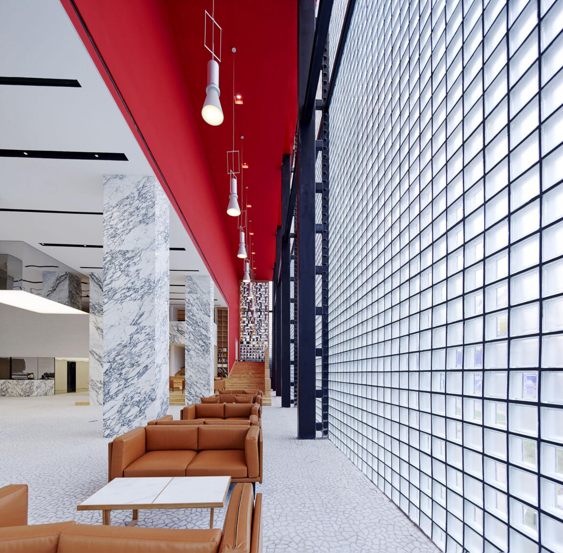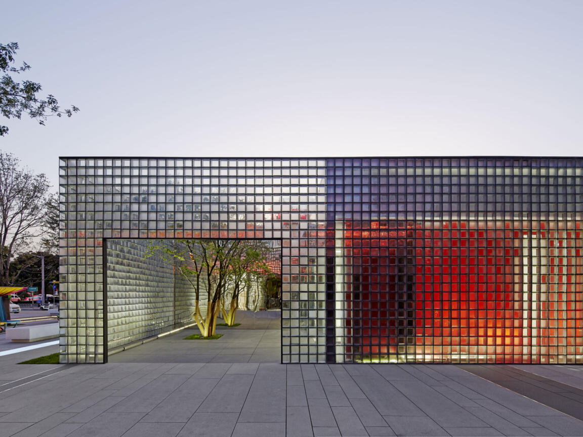 The boiler room exterior, now made interior, is painted bright red to give depth to the façade during the day. Glass bricks were an ideal choice of façade material to maximise the transformation with minimal means. The opacity of the glass walls changes gradually throughout the day according to the position of the sun while strong LED up-lights along the walls create a red ‘lantern effect’ at night.