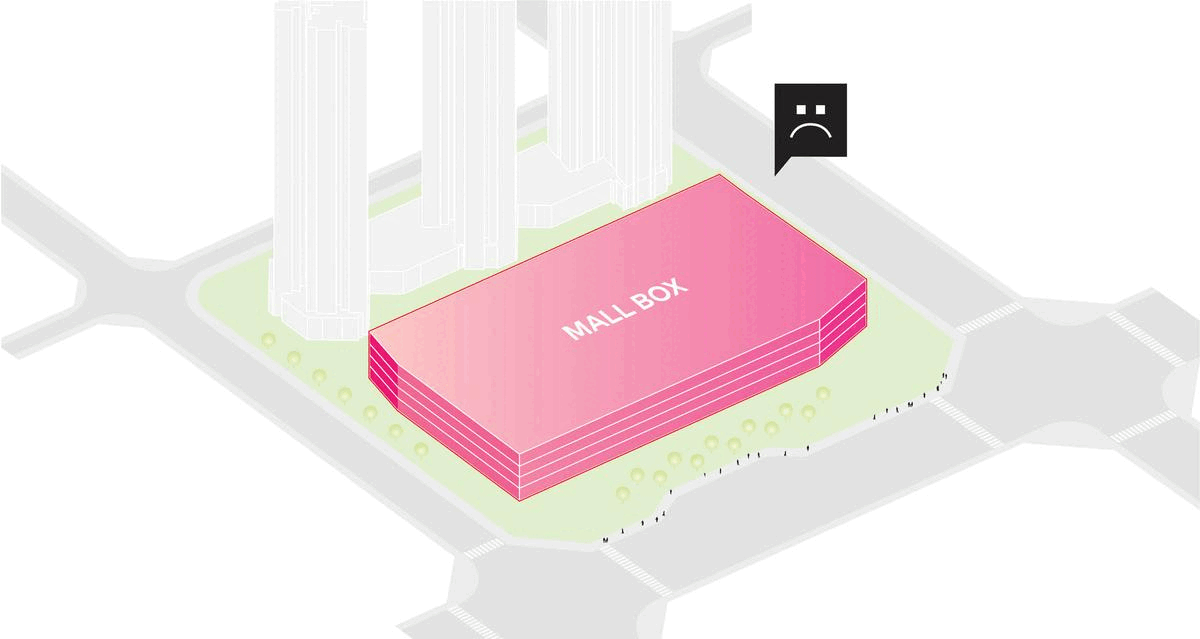 Mobilising and maximising exposure, approachability, and operational value of the mall’s multiple corner setting, the long horizontal massing of the generic buildable envelope was broken into smaller, shifting cuboids that reference human scale.