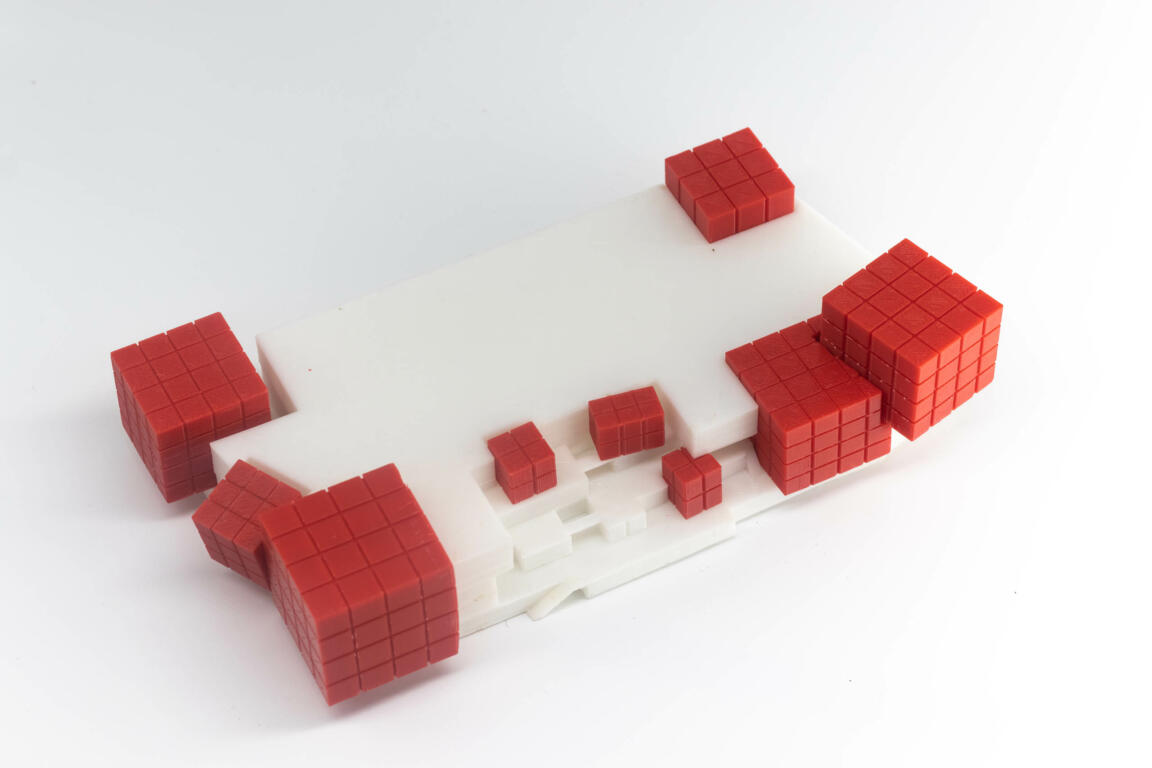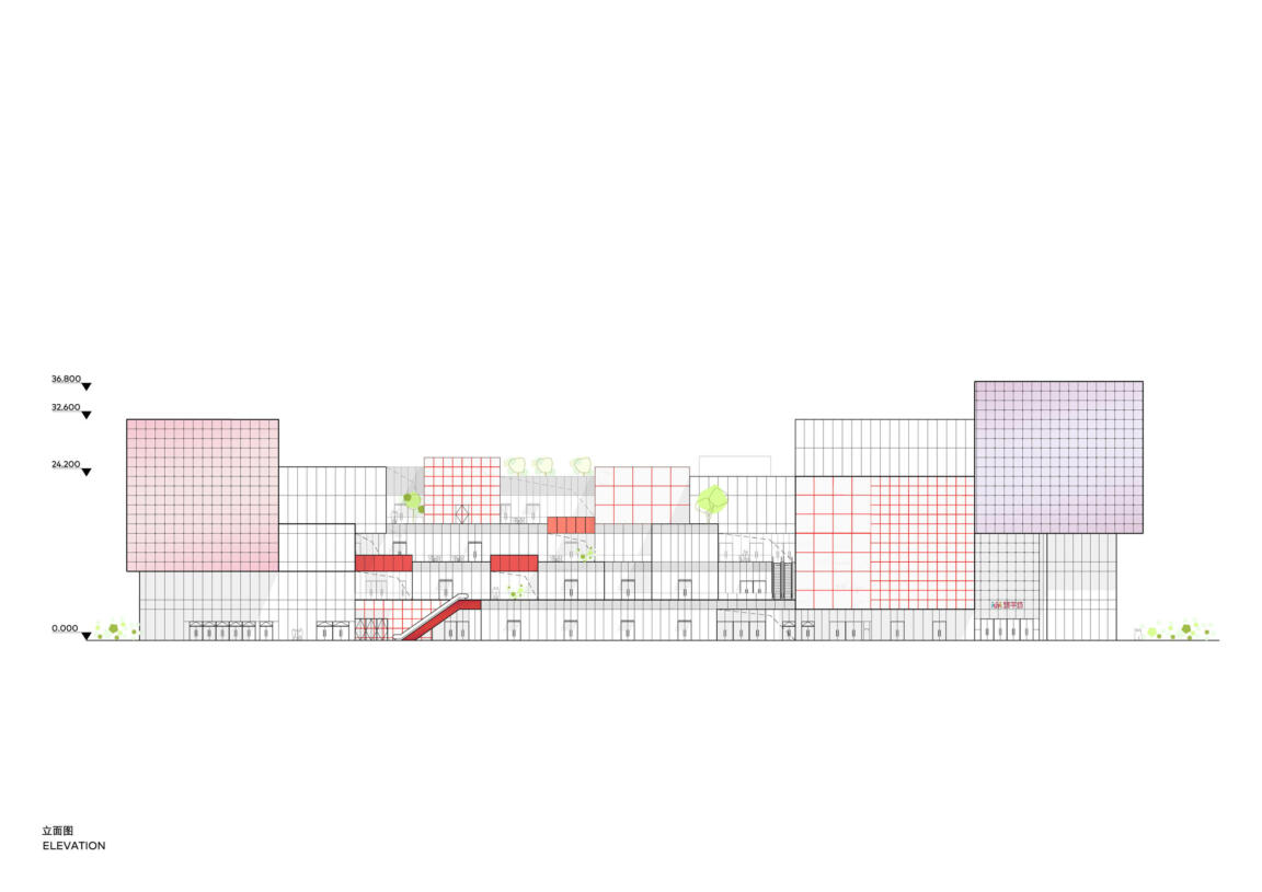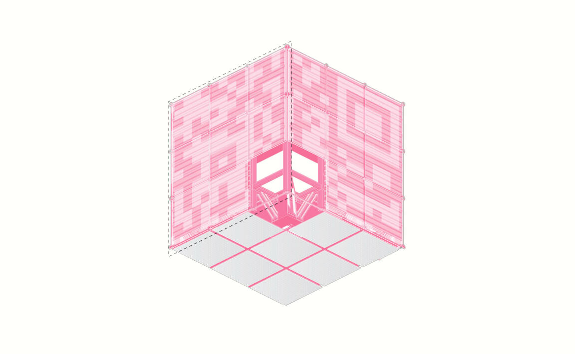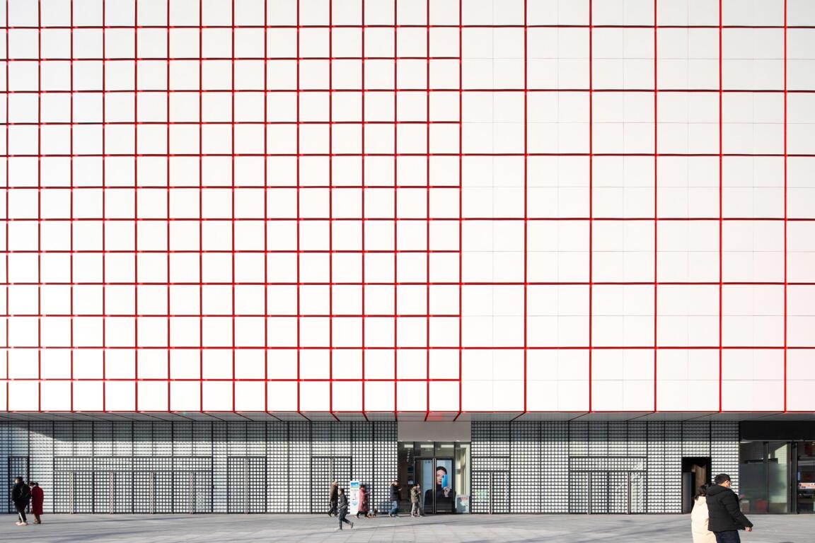 The main body of the stacked cube facades is perceived as a composition of white pixelated clusters, with the individual interlocking cubes patterned in two different scales of linear red squares reminiscent of graph paper, based on a standard and a duplicate facade grid.