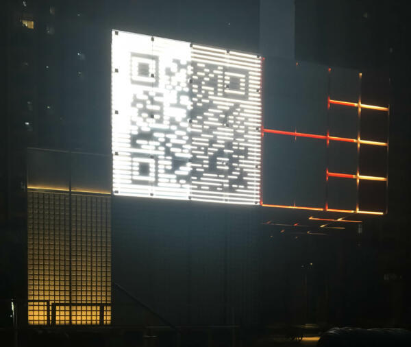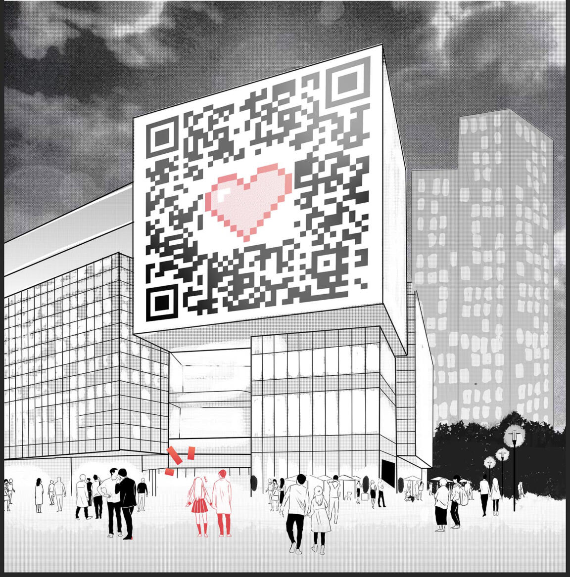 For content, animated game culture influences the online-offline character of the corner screens. The modulated QR codes contribute their own aesthetic, accentuating the building’s presence and creating opportunities for public interaction.