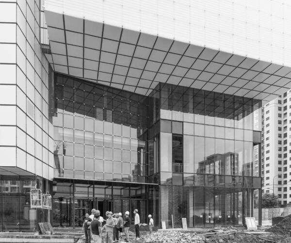 To the main traffic intersection of the block, a cube of 22.5 x 22.5 metres length protrudes above the two bottom floors of the mall, its dimensional mass establishing a strong sense of presence in long-distance visibility.