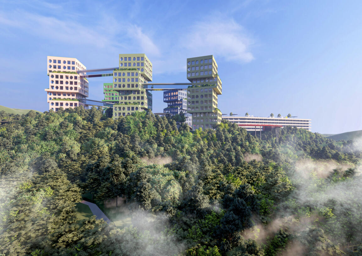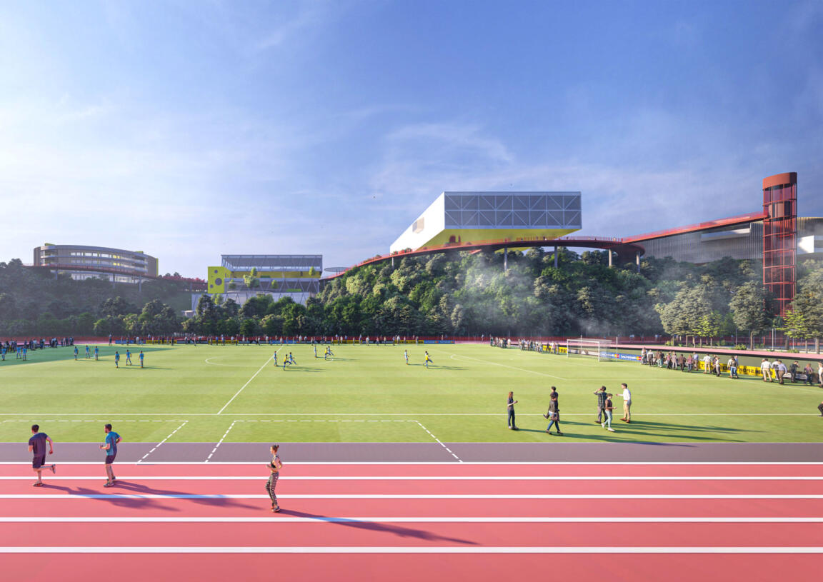 An extensive program from primary through to high school with boarding facilities, as well as a dedicated football centre, stipulates a “healthy lifestyle campus” that is seamlessly integrated into the undulating local landscape. Football pitches are scattered throughout the hilly site, reinforcing the sense of distribution and integration at once.