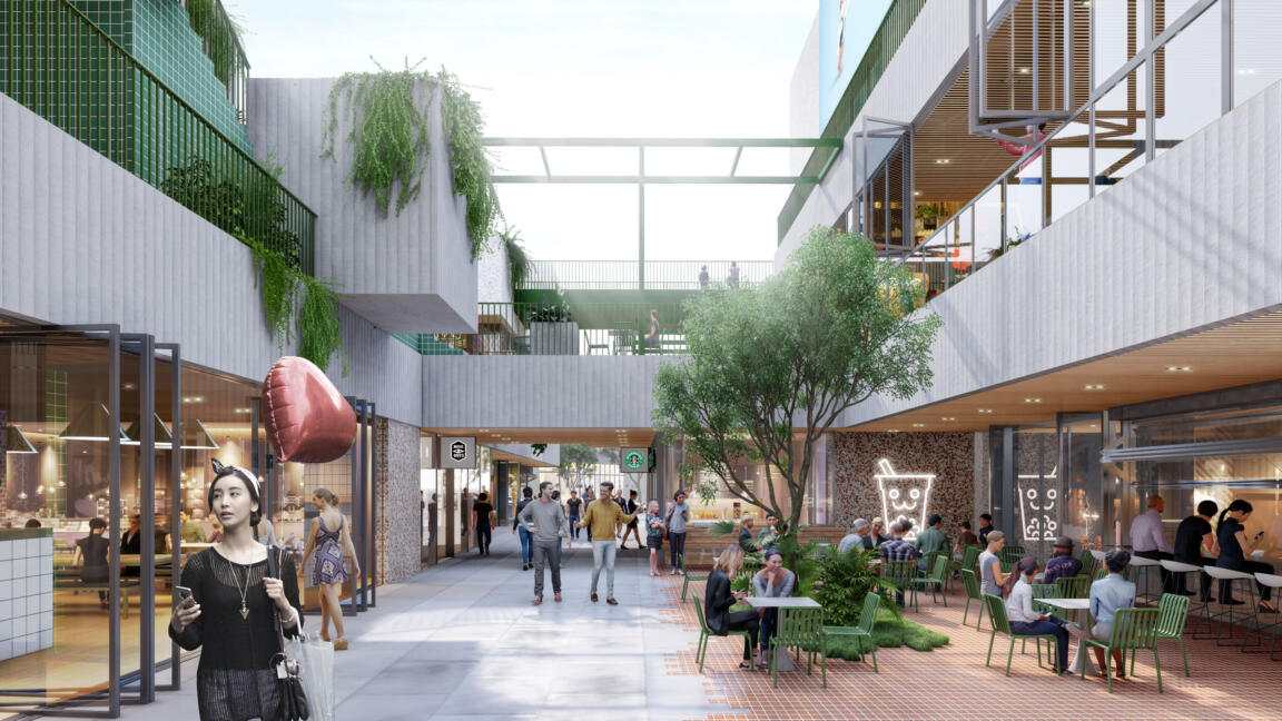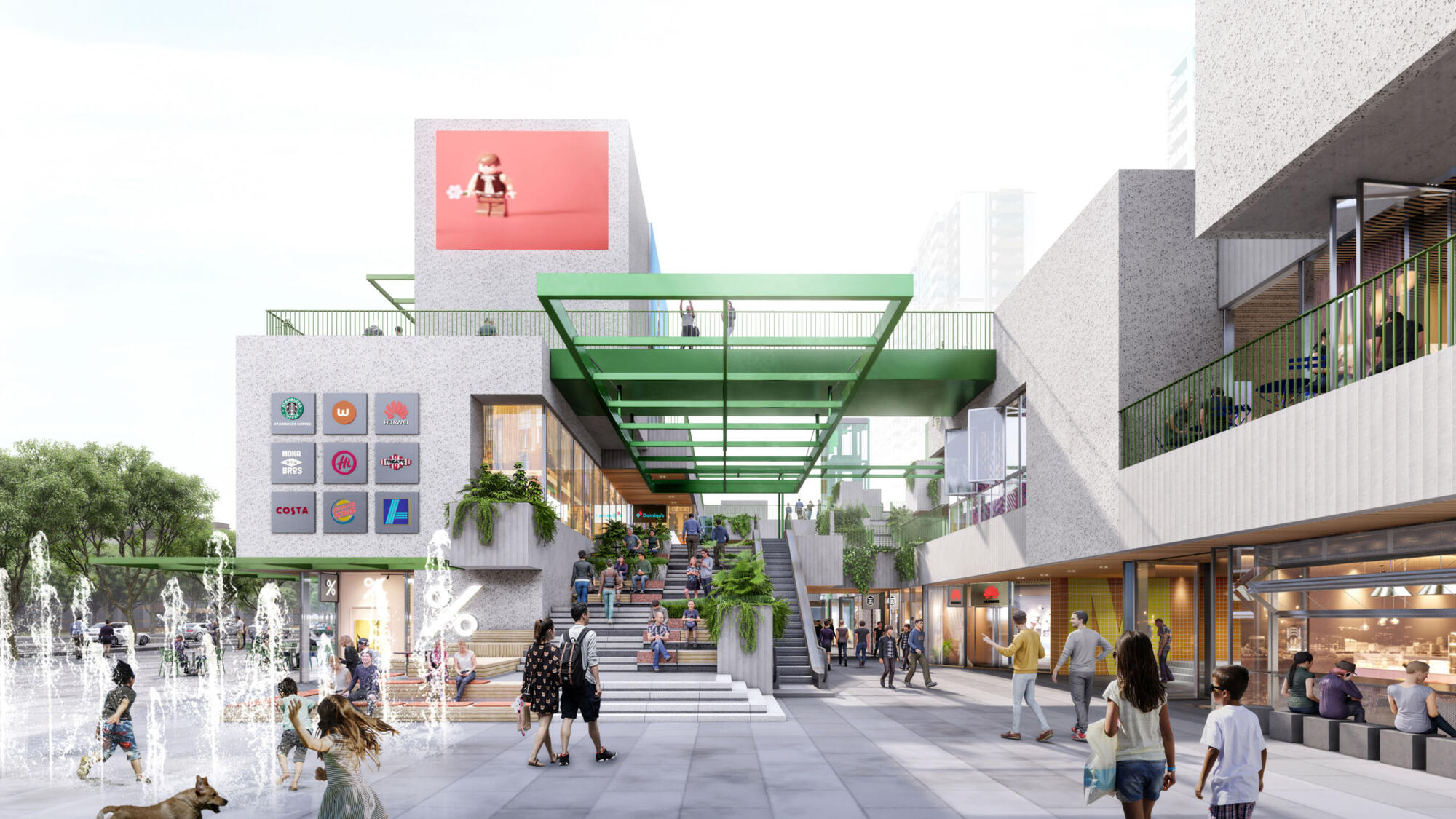 Three lively courtyards and a quiet community garden interject a meandering retail street towards a busy traffic hub.