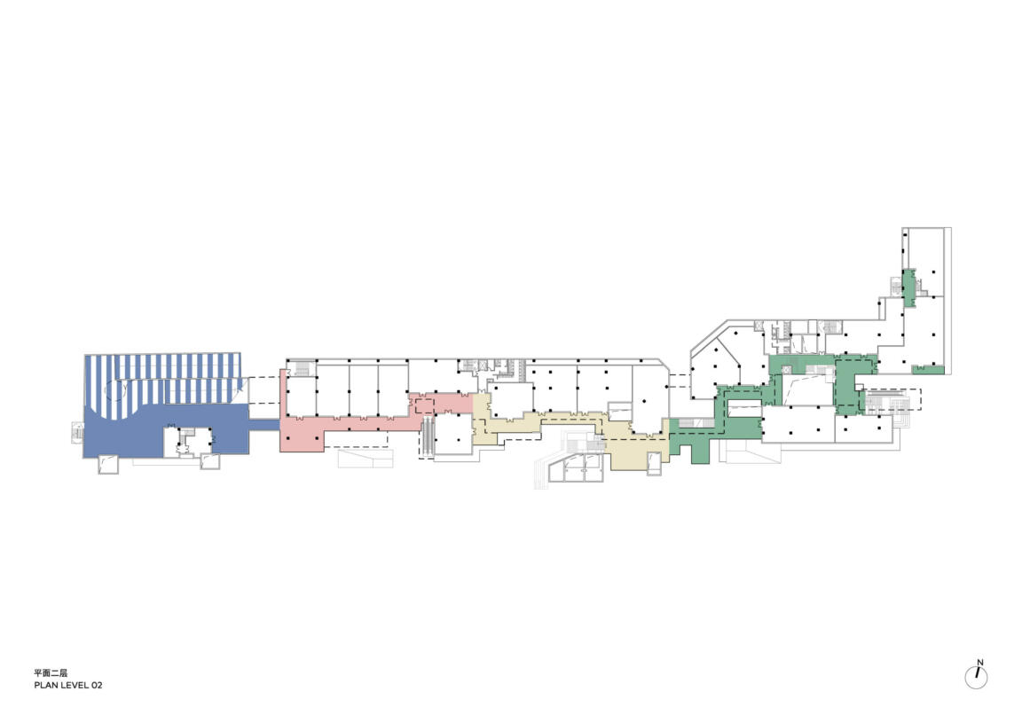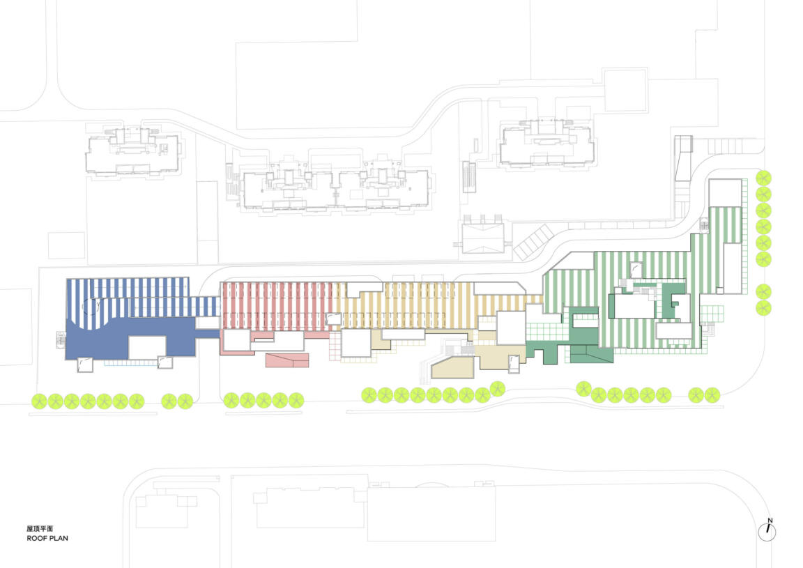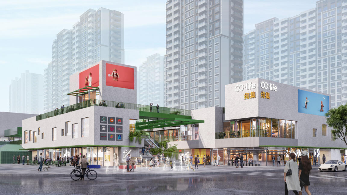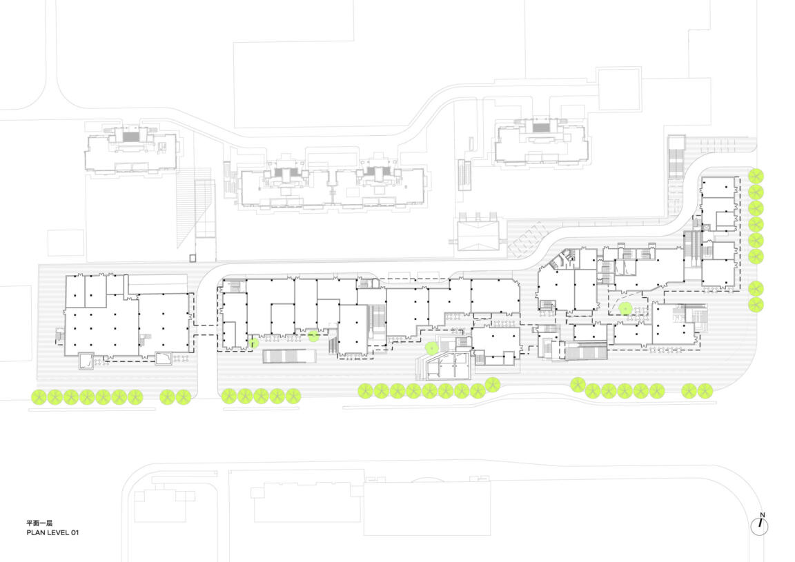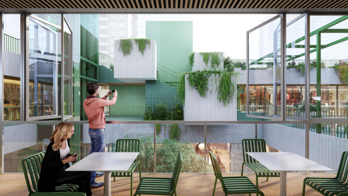 With its strong corner presence towards the intersection, the Wutong Courtyard offers a contemporary sustainable social media cool: the feature vertical circulation leads up into green landscaped terraces above the metro station that offer cafés, a market place, and leisure facilities.
