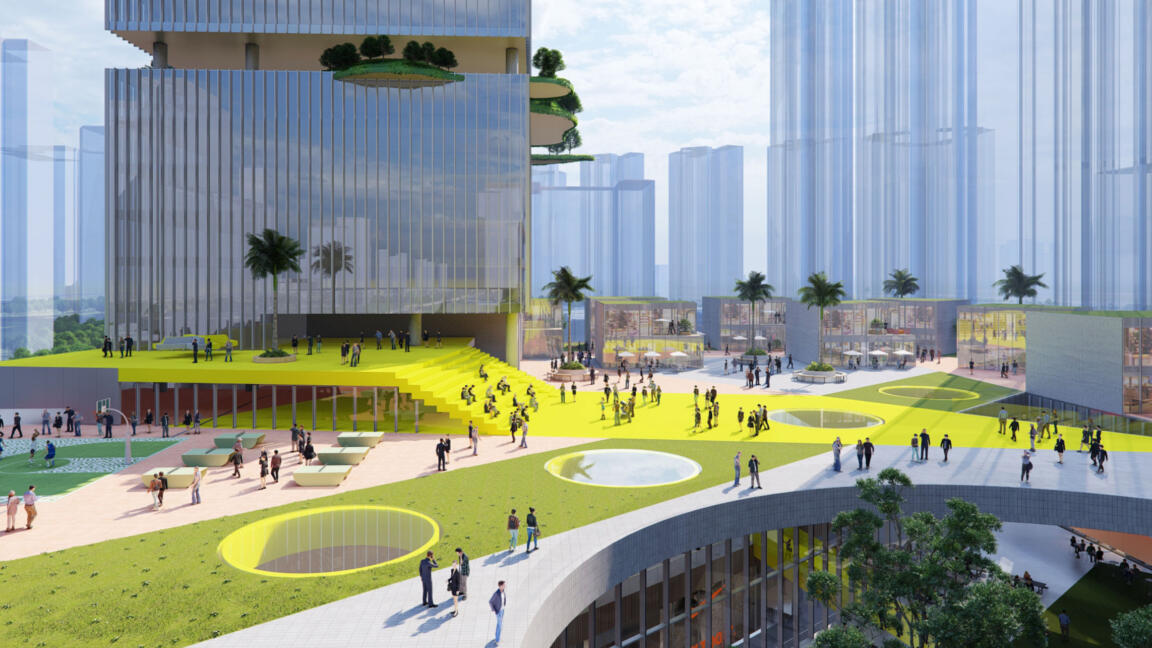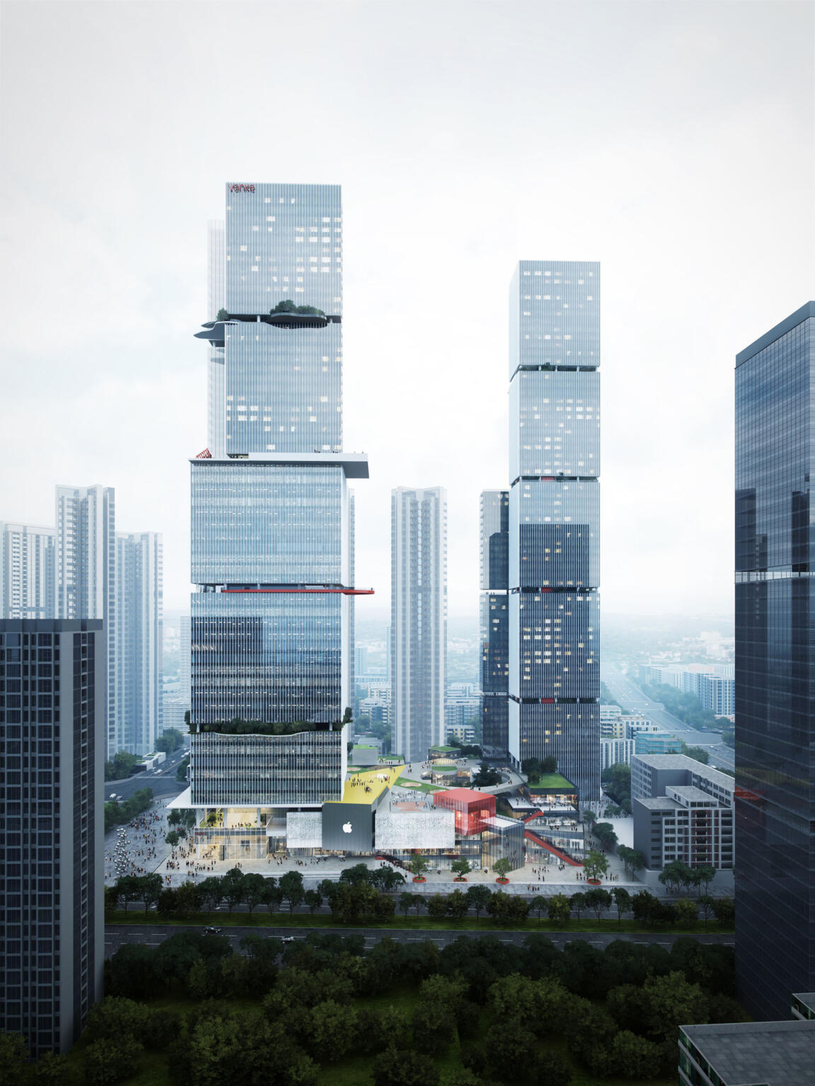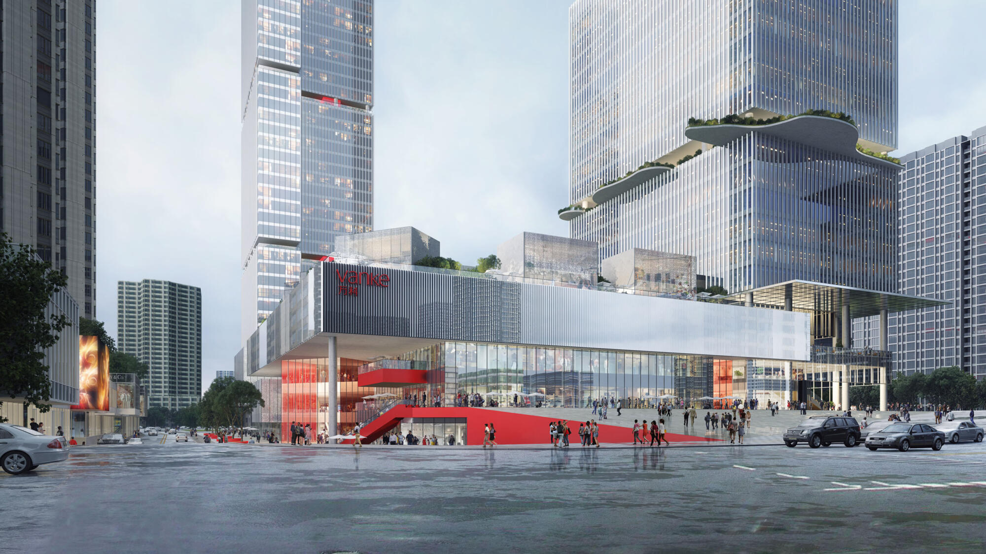 An ensemble of two residential and office towers, wellness and medical facilities, and a shopping mall, expands across a sloping site in Shenzhen’s Nanshan district.