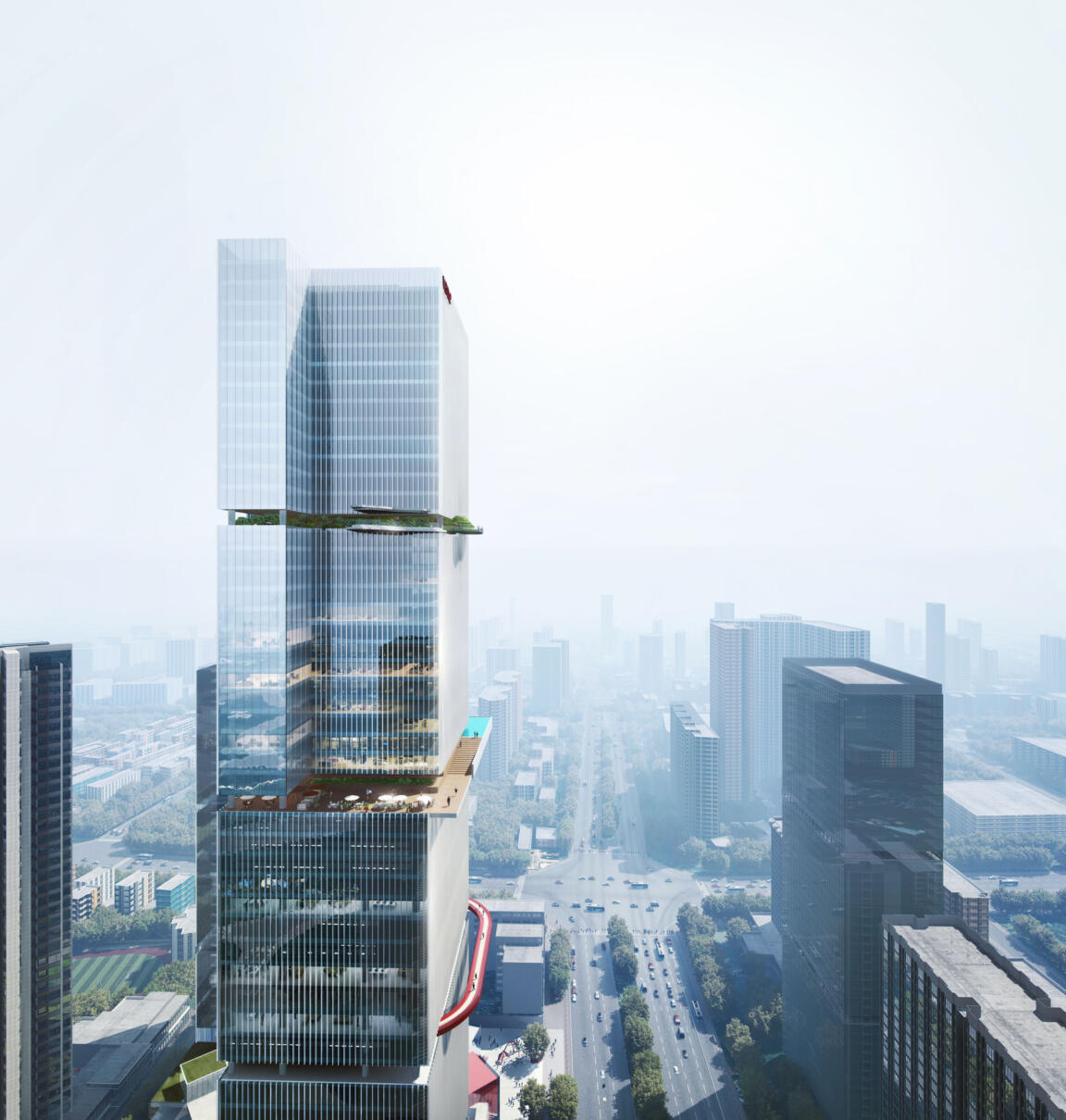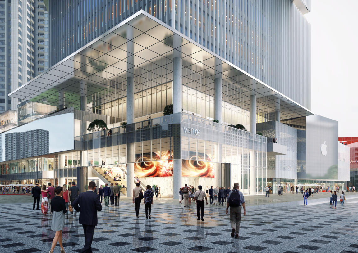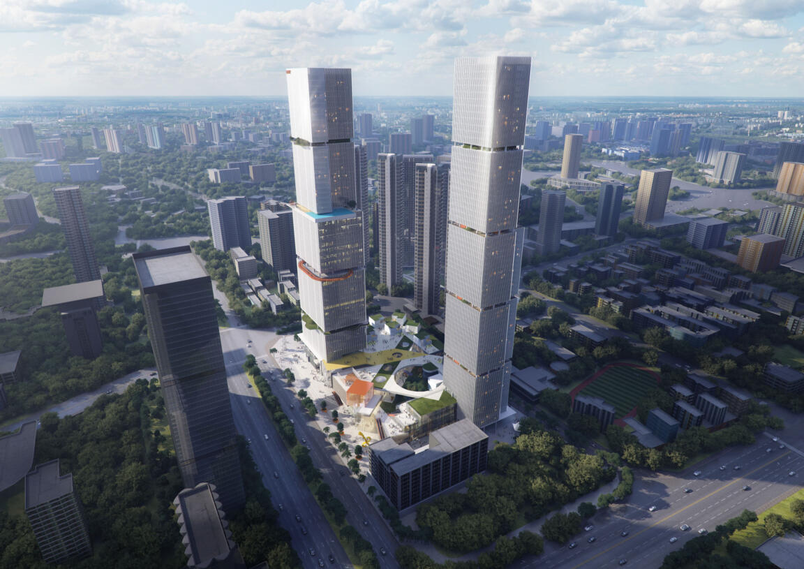 An ensemble of two residential and office towers, wellness and medical facilities, and a shopping mall, expands across a sloping site in Shenzhen’s Nanshan district.