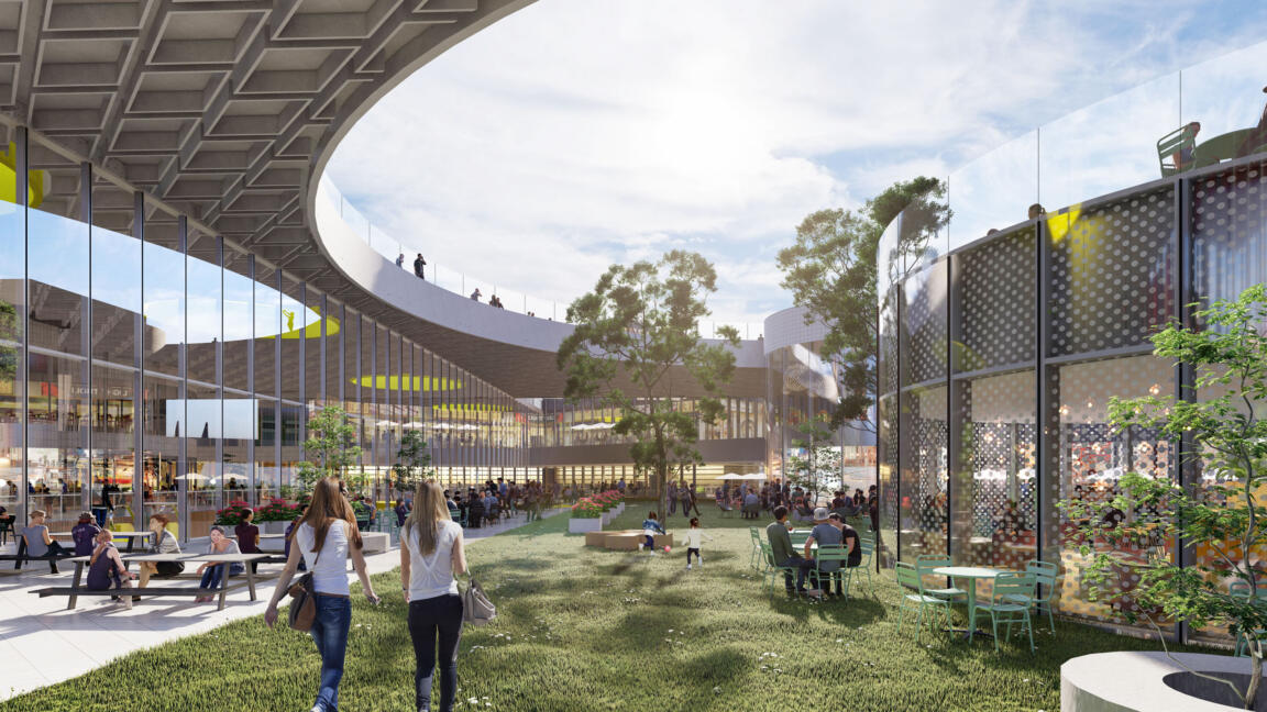 The large internal atrium gives centre stage to multiple sculpted volumes while ensuring indoor view connections throughout. Spreading across two levels, a generous rooftop is accessible from public sidewalk, outdoor and indoor mall, and office and apartment towers. Restaurants, sports and wellness spaces make use of the open landscape roof which is further populated by co-working pavilions on the upper level.